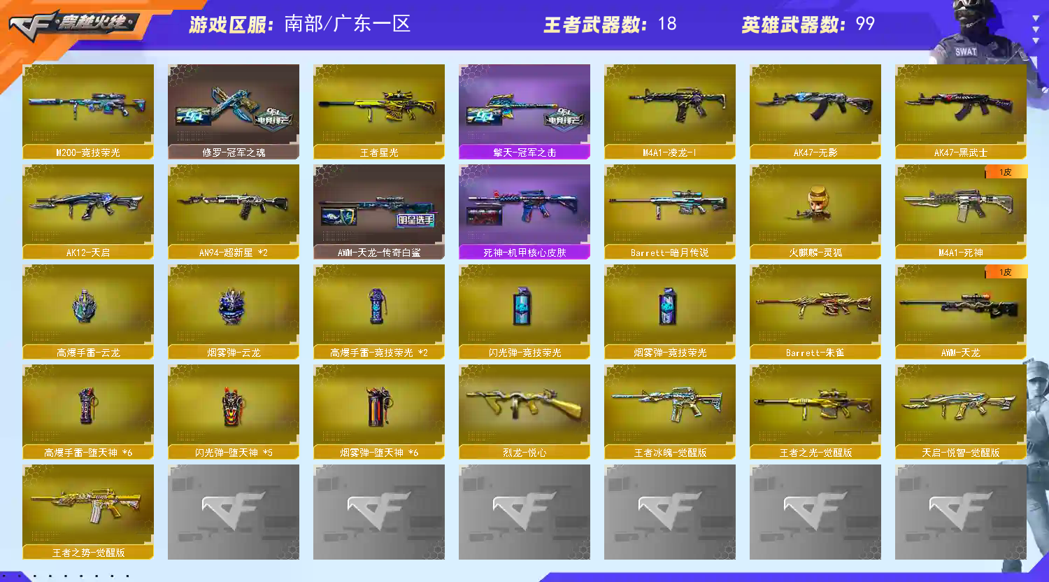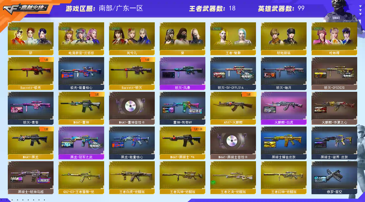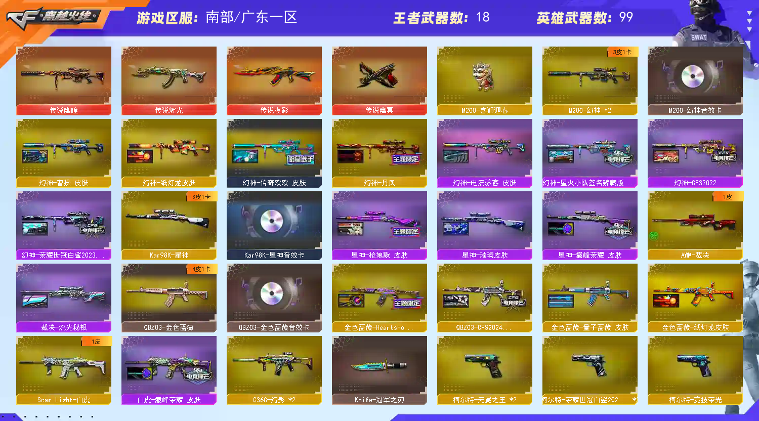 【此号价值数十万,如有开G开辅助封号的,想想自己是否能够承担的起,后果自负,由平台提供,身份信息,证据和地址进行报警处理】 传说幽瞳 传说幽冥 传说辉光 传说夜影 白虎 2幻影 2银翼 金色蔷薇 王者白虎 王者蔷薇 裁决 2幻神 星神 竞技荣光 王者幻神 王者风神 USP雷暴 2柯尔特白鲨 2无冕之王 2炽芒蝶刃 冠军之刃 M200喜狮迎春 双面神 毒蜂 清道夫 马枪 隼 雲悠悠 枪娘樱 星际战将 研 雨棠 岚兮儿 王者魅影 王者凌霄 幻神音效卡 星神音效卡 金色蔷薇音效卡 雷神音效卡 黑骑士音效卡 幻神欧欧 幻神白鲨2023 幻神电流骇客 幻神纸灯龙 幻神丹凤 幻神星火小队 幻神曹操 幻神2022 星神巅峰荣耀 星神枪娘默 星神璀璨 炽芒蝶刃冠军炽芒 炽芒蝶刃白鲨 炽芒蝶刃破浪逐光 QBZ纸灯龙 QBZ女团 QBZ量子蔷薇 QBZ2024 炼狱末日审判 裁决流光秘银 炼狱夏佐 白虎巅峰荣耀;USP-雷暴,柯尔特-无冕之王,柯尔特-荣耀世冠白鲨2023,传说幽冥,炽芒蝶刃,Knife-冠军之刃,隼,