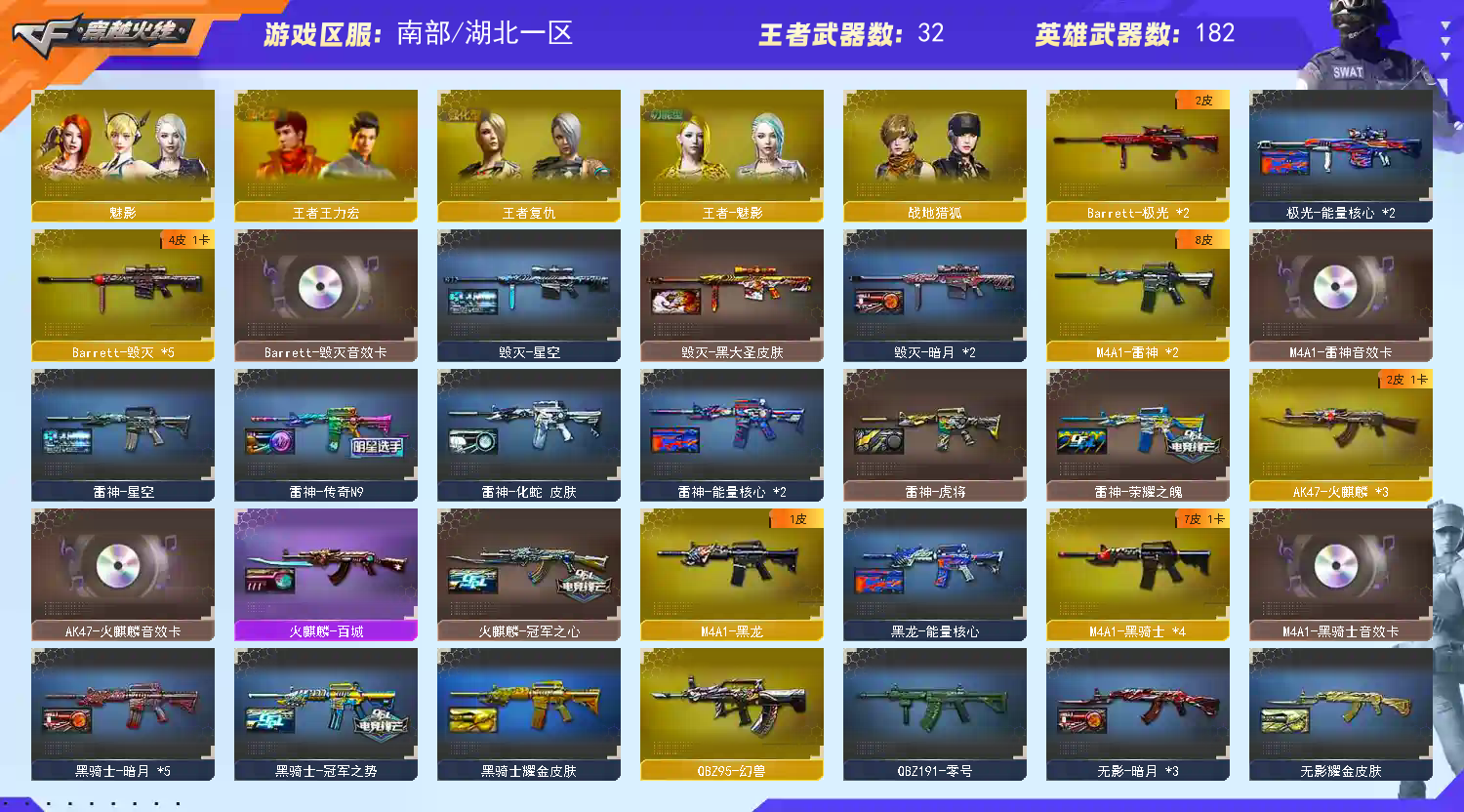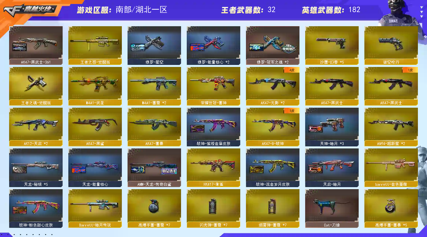 南部精品号 【重要套装】幻兽套装/雷暴套装 【重要角色】_葵/_樱/_蝴蝶_/魅影/_炫/_迷迭香/蛇隐宗/蛇姬/雅典娜/王者-零/王者复仇/王者王力宏/王者零-传说之路/王者樱-热浪之夏/王者-魅影/职业选手/灵狐者-职业经理/铁骑荣耀/铁骑-乘风破浪/零-水下丽影/灵狐者-黄金海岸 【传说武器】传说光耀/传说圣灵 【英雄武器】_M200-幻神/Barrett-毁灭(5)/Barrett-极光(2)/barrett-金色蔷薇/Barrett-暗月传说/雷霆之怒/王者之怒-觉醒版/Kar98K-星神/AWM-天龙(2)/AWM-裁决(2)/M4A1-雷神(2)/荣耀世冠-雷神/M4A1-黑龙/M4A1-龙血(2)/M4A1-黑骑士(4)/黑骑士-海王/M4A1-武圣/M4A1-雷霆(2)/M4A1-猎神/王者之魄-觉醒版/王者冰魄-觉醒版/HK417-朱雀/_Scar Light-白虎/QBZ95-幻兽/AK12-天启(2)/AK47-火麒麟(3)/王者炎心-觉醒版/AK47-无影(2)/无影-神兵利器/AK47-雷暴/AK47-黑鲨/AK47-黑武士/AK-47-猩红传说(25)/AK47-B-身先士卒/AK47-B-常胜将军/AK47-B-战士(2)/AK47-B-战神/AN94-超新星(2)/QBZ03-金色蔷薇/王者之心-觉醒版/9A91-烈火/RPK-盘龙(6)/汤姆逊-烈龙(10)/AA-12-雷霆/加特林-炼狱/COP-堕天神/雷霆之契/沙鹰-天神(2)/沙鹰-修罗(7)/沙鹰-幻兽(5)/王者之魂-觉醒版/Glock18-武圣/_破空枪刃_/USP-雷暴/麒麟刺(2)/麒麟刺-堕天神/龙啸-堕天神/王者之啸-觉醒版(5)/擎天(3)/王者之击-觉醒版(2)/屠龙(14)/雷霆之锋/王者之锋-觉醒版(2)/女皇利刃-幻兽/斩神刀-雷暴/高爆手雷-幻兽(5)/高爆手雷-雷暴(5)/高爆手雷-雷霆(7)/高爆手雷-堕天神(4)/烟雾弹-幻兽(5)/烟雾弹-雷暴(5)/烟雾弹-雷霆(7)/烟雾弹-堕天神(4)/闪光弹-幻兽(5)/闪光弹-雷暴(5)/闪光弹-雷霆(7)/闪光弹-堕天神(4)/G36C-幻影/王者火魄-觉醒版/龙啸-烈火龙威 【王者武器】王者之影/王者之势(2)/王者之城/王者之鲨/王者之魄(2)/王者之戮/王者之武/王者之魄闪光弹 【小人枪】火麒麟-绝迹/HK417-朱雀-蛇隐宗/Cat-刀锋/AWM-灵狐-15周年嘉年华/巴雷特-零-水下丽影/真的是手枪/COP-旗袍/迷你深渊冰龙/迷你白狐/魔能飞环-曼陀罗/迷你裂空之翼/冰火魔兽(2)/迷你生化手雷/生化手雷-小钢(5)/生化手雷-机甲核心/闪光弹-小乔 【其他重要武器】炫金武士/炫金火麒麟/炫金千变/炫金黑龙(2)/炫金雷神/炫金毁灭(3)/炫金天龙/炫金修罗(2)/火麒麟-能量核心/黑武士-能量核心(3)/火麒麟-暗月(2)/激光毁灭者III(2)/冰龙粉碎者-白马银枪/激光毁灭者III-白马银枪/机甲撕裂者III/AK47-冰龙粉碎者/AK47-泰坦破坏者III/AK47-绚樱/XM8-炫彩/M14EBR-情人节2020/M4A1-电音(2)/M4A1-Guitar 炫彩(2)/M14EBR-赤血龙魂(2)/M4A1-秘银赤龙(3)/M14EBR-朋克/AN94-青花瓷/AK47-轮回(2)/M4CQBR-AP-孔明/AK47-娜塔莎/AK47-B-十周年(3)/M4A1-紫狱/AK12-枪王排位(2)/9A91-赤血龙魂(9)/M4A1-战龙/金色小号/AK47-SS-枪王排位(2)/AK47-破空冰刃(2)/M4A1-情人节2019/联想锋行黄金AK/HK417-赤血龙魂/M4A1-十年火线/M4A1-破空冰刃/AK47-青龙/AK47-十年火线(2)/AN94-凤凰/神罚/M200-青花瓷(2)/巴雷特-情人节2020/AWM-银月/雷蛇AWM(3)/M82A1-红龙/Barrett-捣乱兔兔/AWM-红色悦动(2)/AWM-枪娘(2)/黄金AWM/M200-青帝/M200-大黄蜂/AWM-奥运/M200-赤血龙魂(11)/Barrett-翔龙/AWM-恶棍-枪王排位(3)/AWM-恶棍/M200-情人节2019/M200-圣诞/凤凰之怒/AWM-蓝水晶(2)/98K-蓝色骑士/AWM-2018圣诞/AWM-Pink/凤凰之力/末日裁决者/巨龙咆哮Ⅲ/雷蛇加特林/KAC-小动物/EVO III-赤血龙魂(3)/斯泰尔-巧克力/征服者-毁灭之王 [Lv Max]/神圣爆裂者(2)/SPAS-12-雷电核心/修罗-年鹏/阐释者III/Cop357-萌杀/蟒蛇-炫彩/Colt1911-彩蝶/愤怒公牛左轮-枪王排位(3)/MAC-10-幻能朋克/新USP-枪王排位奖励(5)/COP357-十二生肖·羊/幻影Anaconda-枪王排位/COP-金蝉子-枪王排位/沙鹰-枪王排位(3)/Anaconda-炽焰核心/Anaconda-情人节2021/新USP-怒火大圣/Anaconda-雷电核心/沙鹰-青龙/匕首-幻能朋克(2)/斩神刀-御龙/军用铁锹-丹龙/收割者-枪王排位(2)/虹光丛林匕首-枪王排位/猫猫手套/蝴蝶刀-枪王排位/尼泊尔军刀-战龙/丛林匕首-卧龙(4)/丛林匕首-枪王排位(2)/军用铁锹-飞龙在天/啸天/胜利奖杯闪光弹-枪王排位/胜利奖杯手雷-枪王排位/闪光弹-枪王排位(6)/胜利奖杯烟雾弹-枪王排位(3) 【重要武器皮肤】幻神-丹凤/巴雷特-毁灭-CFPL冠军/毁灭-星空/毁灭-暗月/毁灭-黑大圣皮肤/毁灭-青帝皮肤/巴雷特SV皮肤/极光-能量核心/AWM-天龙-传奇白鲨/天龙-CFSTAR/天龙-秘银/天龙-能量核心/裁决-羽掣 皮肤/火麒麟-CFSTAR/火麒麟-AG/火麒麟-百城/火麒麟-冠军之心/无影-暗月/无影耀金皮肤/AK47-黑武士-361/AK47-B-常胜将军-刘备/AK47-B-常胜将军-孙权/雷神-化蛇 皮肤/雷神-源计划2.0专属 皮肤/M4A1-雷神-白鲨皮肤/雷神-传奇N9/雷神-荣耀之魄/雷神-虎将/雷神-能量核心/雷神-星空/黑骑士-冠军之势/黑骑士耀金皮肤/黑骑士-暗月/黑龙-能量核心/死神-秘银/Scar Light-白虎-暗星/QBZ03-冠军之薇/天启-暗月/战神-流金岁月皮肤/战神-紫绶金章皮肤/战神-粉色甜心皮肤/炼狱-星空/修罗-冠军之魂/修罗-星空/修罗-能量核心/天神-暗月 【重要光效】炼狱-悦蓝金色光效/王者之啸金色光效/王者之影金色光效/王者之心金色光效/王者之怒金色光效/王者之锋金色光效/王者之魂金色光效/王者之魄金色光效/AK47-火麒麟蓝色光效/AN94-超新星蓝色光效/AWM-天龙蓝色光效/M4A1-死神蓝色光效/RPK-盘龙蓝色光效/加特林-炼狱蓝色光效/屠龙蓝色光效/擎天蓝色光效/汤姆逊-烈龙蓝色光效/沙鹰-修罗蓝色光效/王者冰魄-蓝色光效/麒麟刺蓝色光效/龙啸蓝色光效/AK47-火麒麟蓝粉色光效/AK47-黑武士蓝粉色光效/M200-幻神蓝粉色光效/M4A1-雷神蓝粉