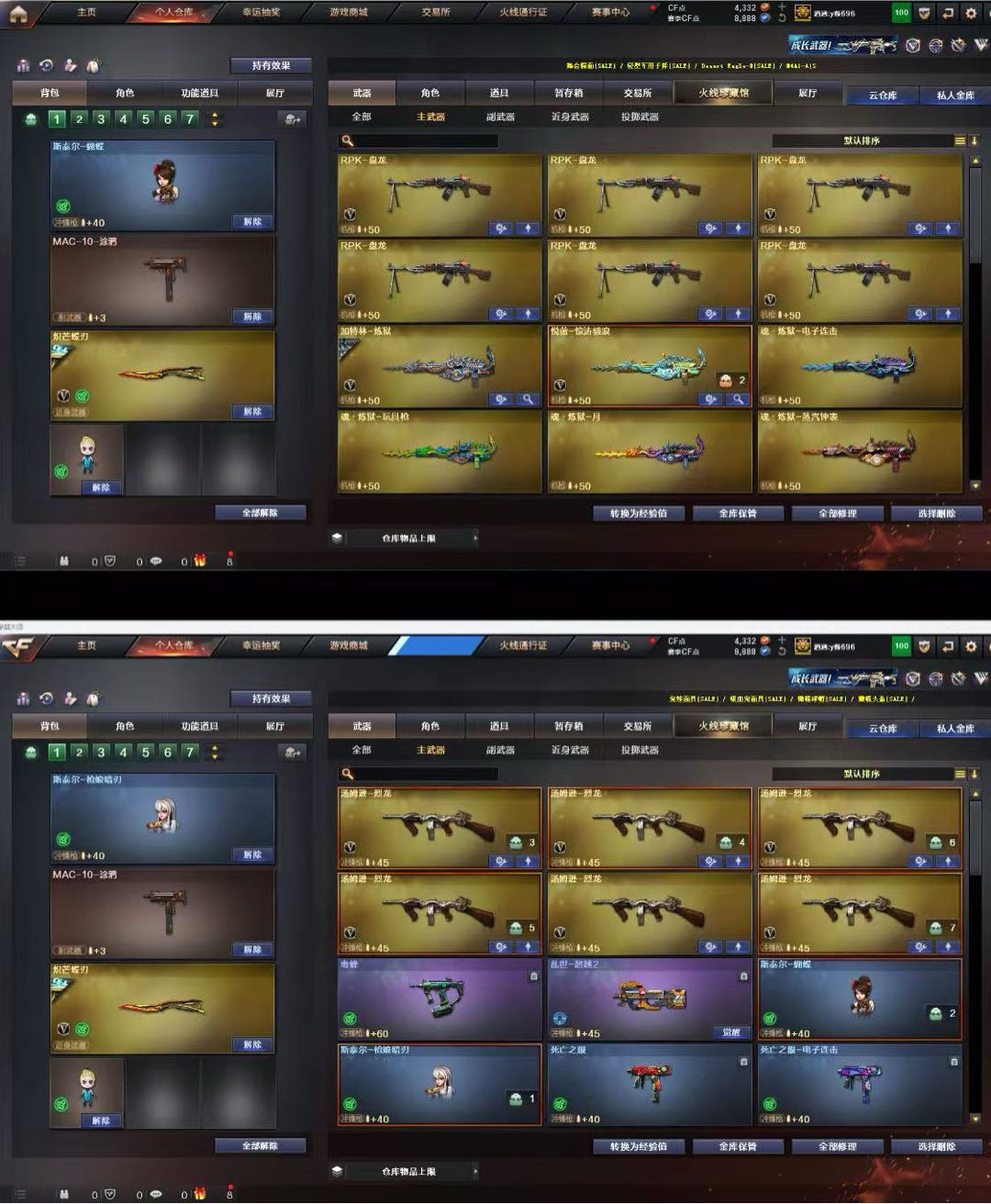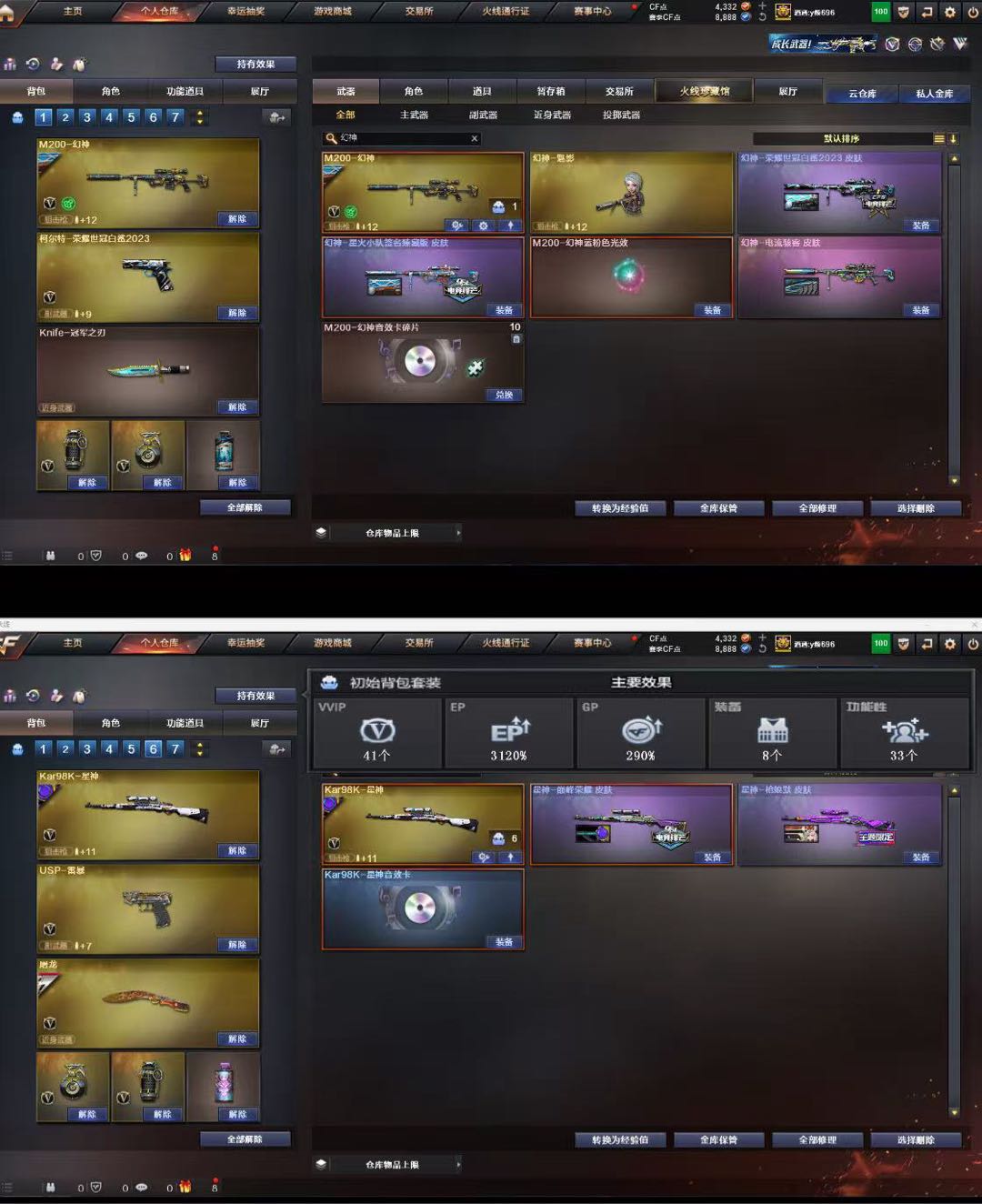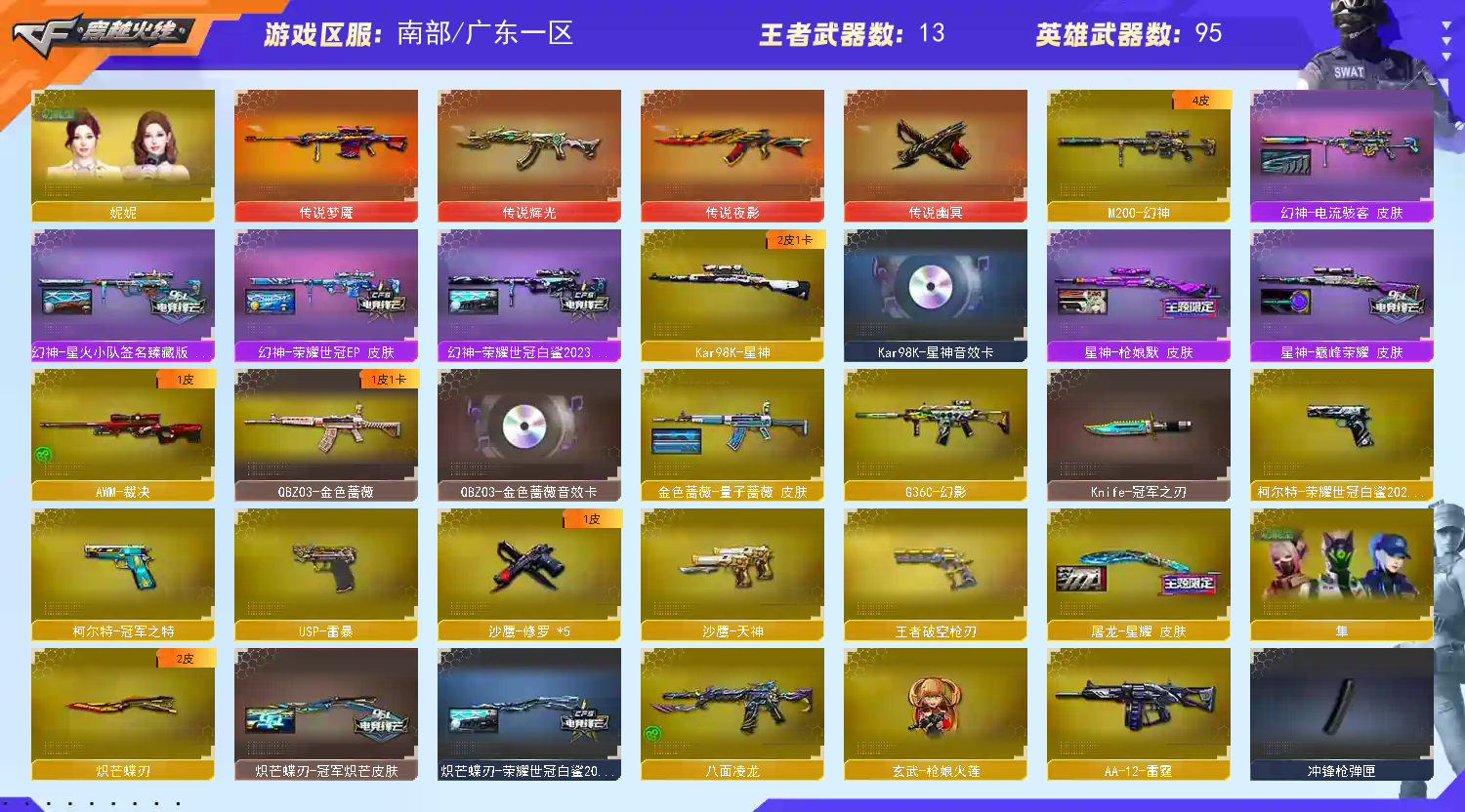 4传说:隼八面凌龙炽芒蝶刃,6烈蝴蝶枪娘暗刃,6盘炼狱,幻神白鲨2023星火小队,星神3件套具体看图;USP-雷暴,柯尔特-荣耀世冠白鲨2023,传说幽冥,柯尔特-冠军之特,炽芒蝶刃,Knife-冠军之刃,隼,