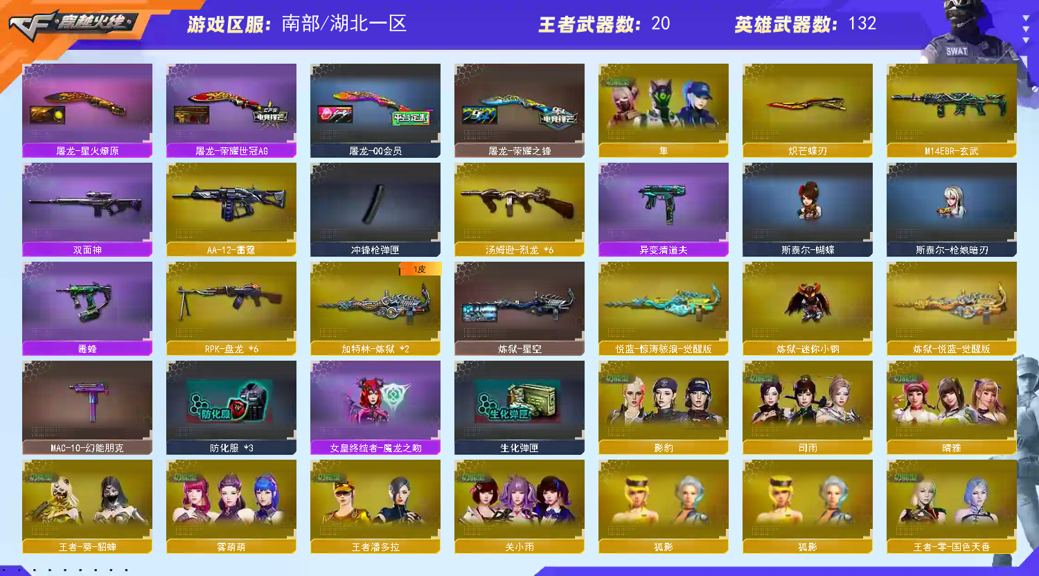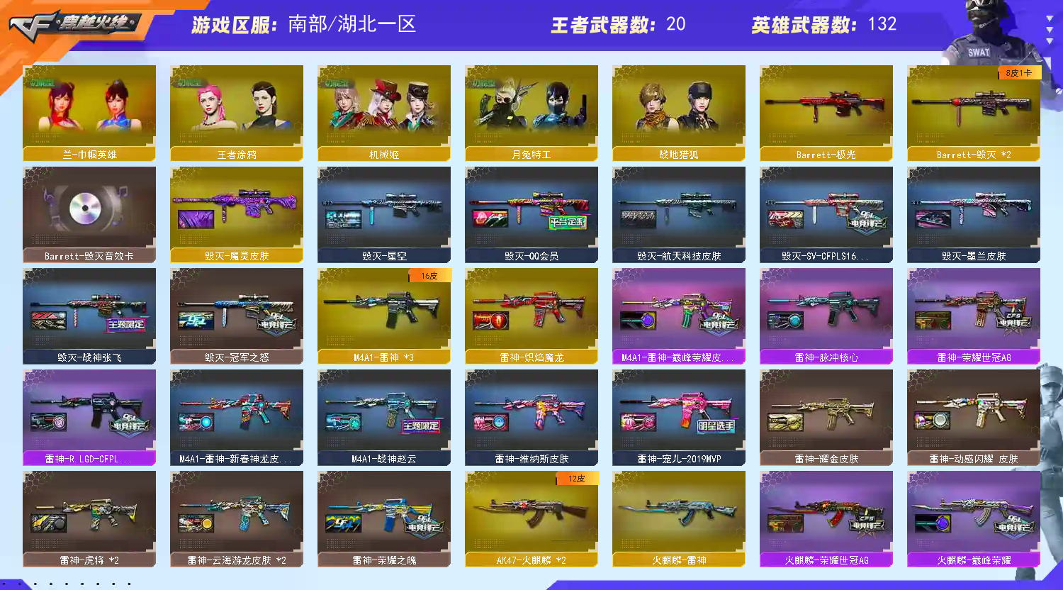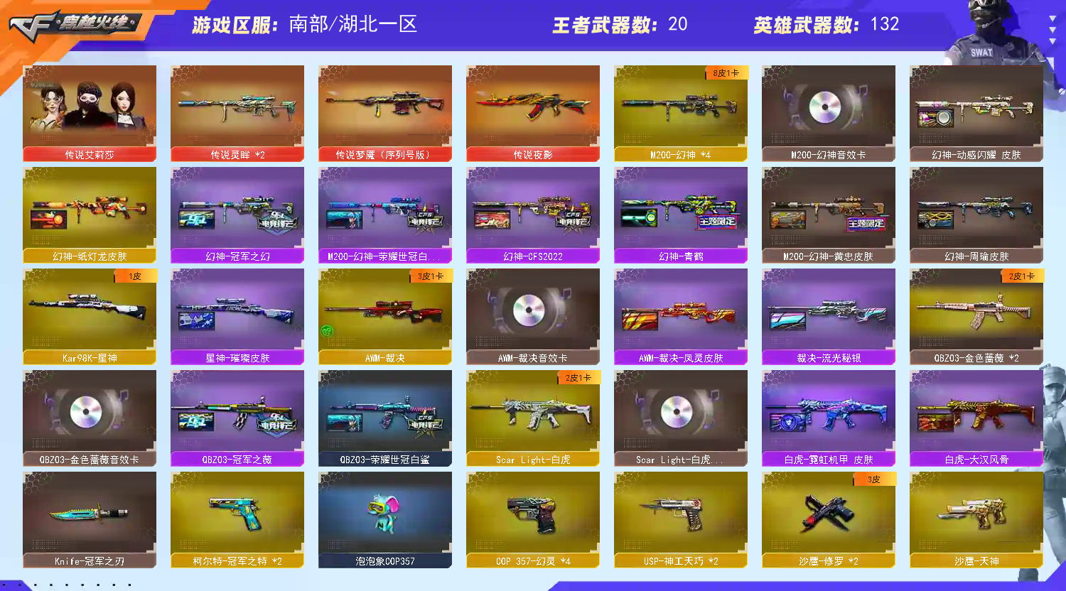 【稀有武器】:传说暗裔/传说灵眸/M200-幻神/Kar98K-星神/八面凌龙/G36C-幻影/ScarLight-白虎/M14EBR-玄武/M4A1-青龙/HK417-朱雀/M4A1-夜魔/M4A1-幻灵/M4A1-神工天巧/M4A1-雷霆(2)/雷霆之契/USP-雷暴/COP-堕天神/破空枪刃-夜魔/柯尔特-电竞装甲/COP357-幻灵/柯尔特-竞技荣光/天神-动感闪耀/COP357-云龙/沙鹰-幻兽/柯尔特-冠军之特/QBZ03-金色蔷薇/AK47-火麒麟(5)/AK47-麒麟/M4A1-黑龙(3)/M4A1-雷神(3)/M4A1-黑骑士(4)/AK47-无影/AK47-黑武士(4)/荣耀世冠-雷神/Barrett-毁灭(5)/Barrett-极光(5)/AWM-裁决(4)/M200-竞技荣光/RPK-盘龙(5)/加特林-炼狱(3)/悦蓝-惊涛骇浪-觉醒版/汤姆逊-烈龙(9)/AA-12-雷霆(2)/炽芒蝶刃(2)/斩神刀-雷暴/麒麟刺-堕天神/龙啸-堕天神/马来剑-夜魔(2)/幻灵之锋(2)/擎天-竞技荣光/云龙扇/女皇利刃-幻兽 【王者武器】:王者之心-觉醒版/王者之魄-觉醒版/王者芳薇-觉醒版/王者之怒-觉醒版/王者之光-觉醒版/王者风神-觉醒版/王者之力/王者星霆 【热门角色】:传说影煞/电竞教官-云悠悠/影豹/炫/隼/魅影/奇洋探员/乔伊教练/王者-魅影/王者玲珑/王者凌霄/灵狐者-职业经理/流浪蔷薇/潘多拉-X/兔囡囡/职业选手/潘多拉 【热门音效卡】:M200-幻神音效卡/Kar98K-星神音效卡/AWM-裁决音效卡/加特林-炼狱音效卡/M4A1-雷神音效卡/Barrett-毁灭音效卡/M4A1-黑骑士音效卡/AK47-火麒麟音效卡 【热门皮肤】:幻神-AG-CFPLS24冠军皮肤/幻神-宠儿-2021MVP/幻神-电流骇客皮肤/幻神-丹凤/白虎-白鲨-CFPLS23冠军/裁决-巅峰荣耀皮肤/QBZ03-CFS2024皮肤/星神-破竹皮肤/屠龙-星火燎原/Kar98K-星神-冠军之星皮肤/白虎-巅峰荣耀 皮肤/死神-机甲核心皮肤/白虎-电玩粉兔皮肤/毁灭-战神张飞/雷神-传奇N9/极光-高能霹雳皮肤/屠龙-荣耀之锋/毁灭-荣耀之怒/屠龙-春桃皮肤/雷神-荣耀之魄 【其他亮点】:斯泰尔-蝴蝶/炼狱-迷你小钢/柯尔特-赛博朋克/MK5-炽火炎龙/毒蜂/VEPR-12-金魔/贝雷塔687-射手座/M14EBR-冠军金牛;柯尔特-冠军之特,炽芒蝶刃,Knife-冠军之刃,隼,晴雅,传说艾莉莎,RPK-盘龙,