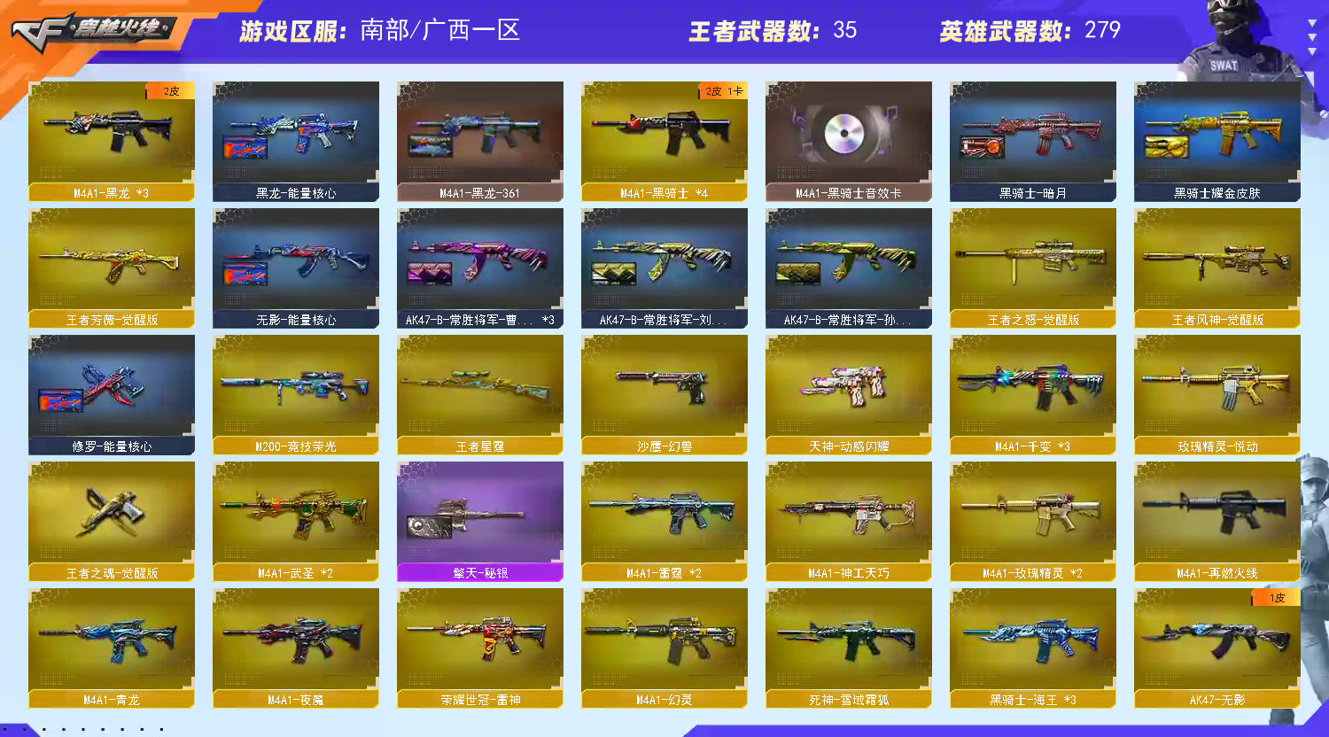 【稀有武器】:传说暗裔/传说灵眸/M200-幻神/Kar98K-星神/八面凌龙/G36C-幻影/ScarLight-白虎/M14EBR-玄武/M4A1-青龙/HK417-朱雀/M4A1-夜魔/M4A1-幻灵/M4A1-神工天巧/M4A1-雷霆(2)/雷霆之契/USP-雷暴/COP-堕天神/破空枪刃-夜魔/柯尔特-电竞装甲/COP357-幻灵/柯尔特-竞技荣光/天神-动感闪耀/COP357-云龙/沙鹰-幻兽/柯尔特-冠军之特/QBZ03-金色蔷薇/AK47-火麒麟(5)/AK47-麒麟/M4A1-黑龙(3)/M4A1-雷神(3)/M4A1-黑骑士(4)/AK47-无影/AK47-黑武士(4)/荣耀世冠-雷神/Barrett-毁灭(5)/Barrett-极光(5)/AWM-裁决(4)/M200-竞技荣光/RPK-盘龙(5)/加特林-炼狱(3)/悦蓝-惊涛骇浪-觉醒版/汤姆逊-烈龙(9)/AA-12-雷霆(2)/炽芒蝶刃(2)/斩神刀-雷暴/麒麟刺-堕天神/龙啸-堕天神/马来剑-夜魔(2)/幻灵之锋(2)/擎天-竞技荣光/云龙扇/女皇利刃-幻兽 【王者武器】:王者之心-觉醒版/王者之魄-觉醒版/王者芳薇-觉醒版/王者之怒-觉醒版/王者之光-觉醒版/王者风神-觉醒版/王者之力/王者星霆 【热门角色】:传说影煞/电竞教官-云悠悠/影豹/炫/隼/魅影/奇洋探员/乔伊教练/王者-魅影/王者玲珑/王者凌霄/灵狐者-职业经理/流浪蔷薇/潘多拉-X/兔囡囡/职业选手/潘多拉 【热门音效卡】:M200-幻神音效卡/Kar98K-星神音效卡/AWM-裁决音效卡/加特林-炼狱音效卡/M4A1-雷神音效卡/Barrett-毁灭音效卡/M4A1-黑骑士音效卡/AK47-火麒麟音效卡 【热门皮肤】:幻神-AG-CFPLS24冠军皮肤/幻神-宠儿-2021MVP/幻神-电流骇客皮肤/幻神-丹凤/白虎-白鲨-CFPLS23冠军/裁决-巅峰荣耀皮肤/QBZ03-CFS2024皮肤/星神-破竹皮肤/屠龙-星火燎原/Kar98K-星神-冠军之星皮肤/白虎-巅峰荣耀 皮肤/死神-机甲核心皮肤/白虎-电玩粉兔皮肤/毁灭-战神张飞/雷神-传奇N9/极光-高能霹雳皮肤/屠龙-荣耀之锋/毁灭-荣耀之怒/屠龙-春桃皮肤/雷神-荣耀之魄 【其他亮点】:斯泰尔-蝴蝶/炼狱-迷你小钢/柯尔特-赛博朋克/MK5-炽火炎龙/毒蜂/VEPR-12-金魔/贝雷塔687-射手座/M14EBR-冠军金牛;USP-雷暴,柯尔特-冠军之特,炽芒蝶刃,传说影煞,隼,电竞教官-云悠悠,RPK-盘龙,