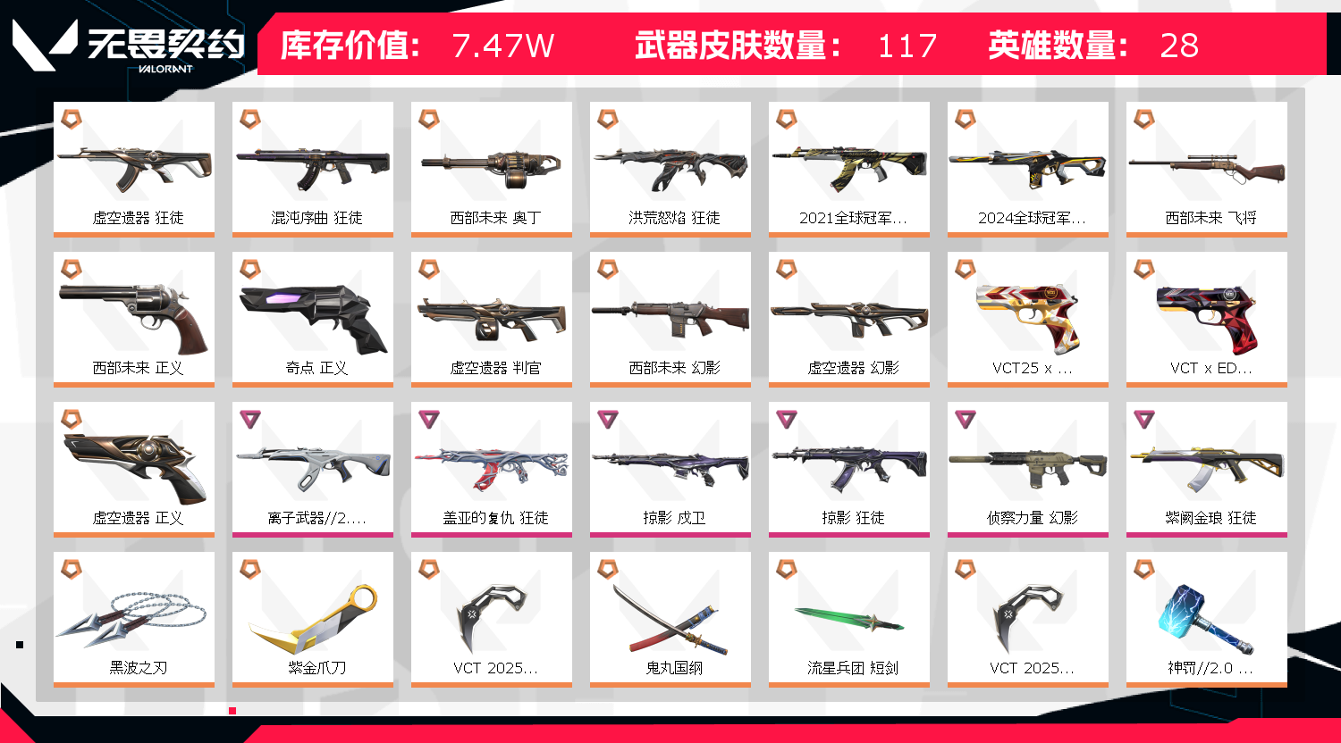 1;西部未来 奥丁,黑波之刃,紫金爪刀,VCT 2025 爪刀,盖亚的复仇 狂徒,虚空遗器 狂徒,掠影 戍卫,