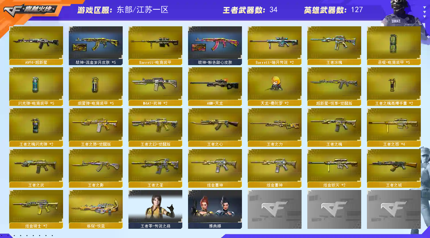 可排位146V31王者/M200-幻神+黄忠/白虎/7盘7烈/QBZ蔷薇/电竞装甲+网剧套;RPK-盘龙,QBZ03-金色蔷薇,M200-幻神,Scar Light-白虎,