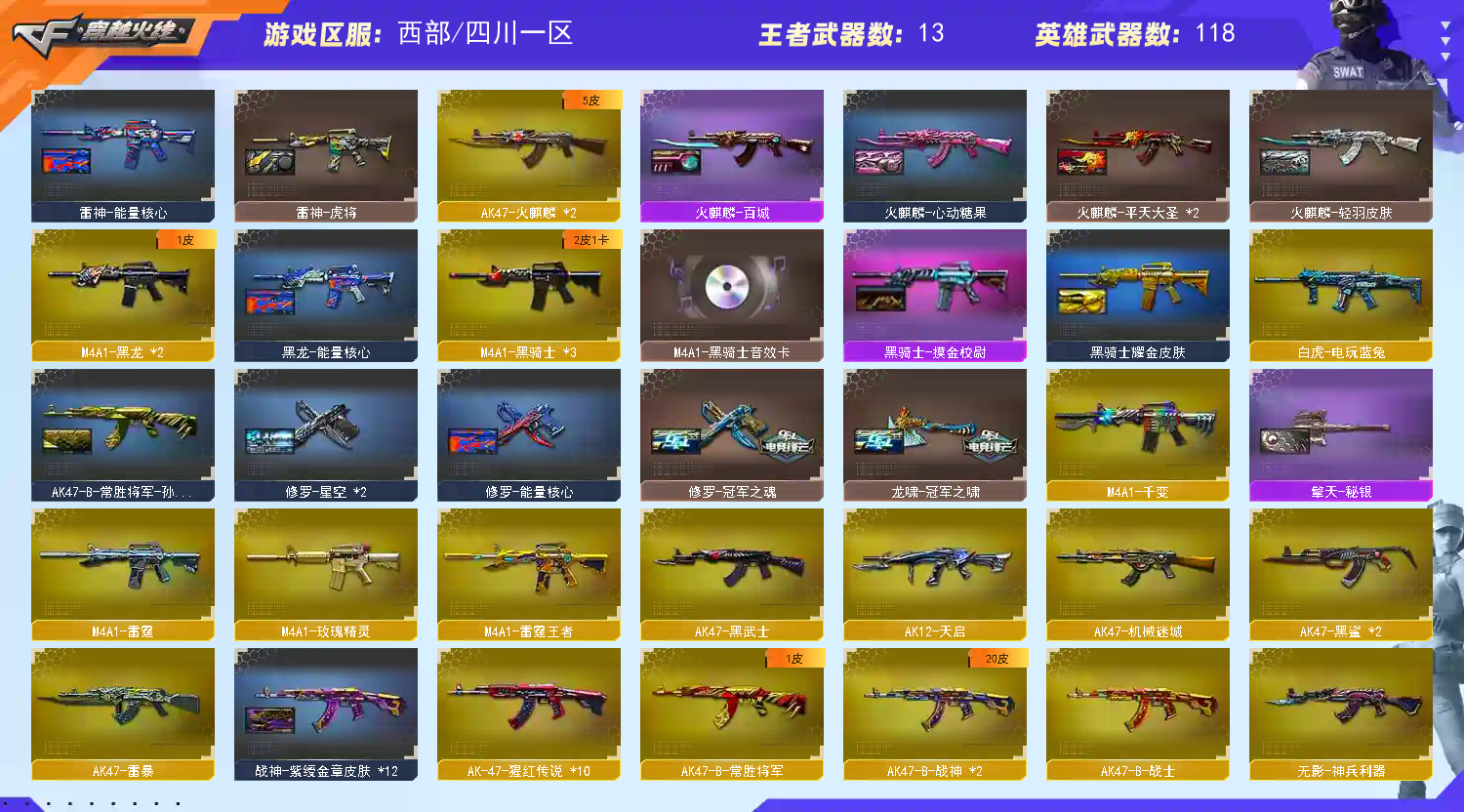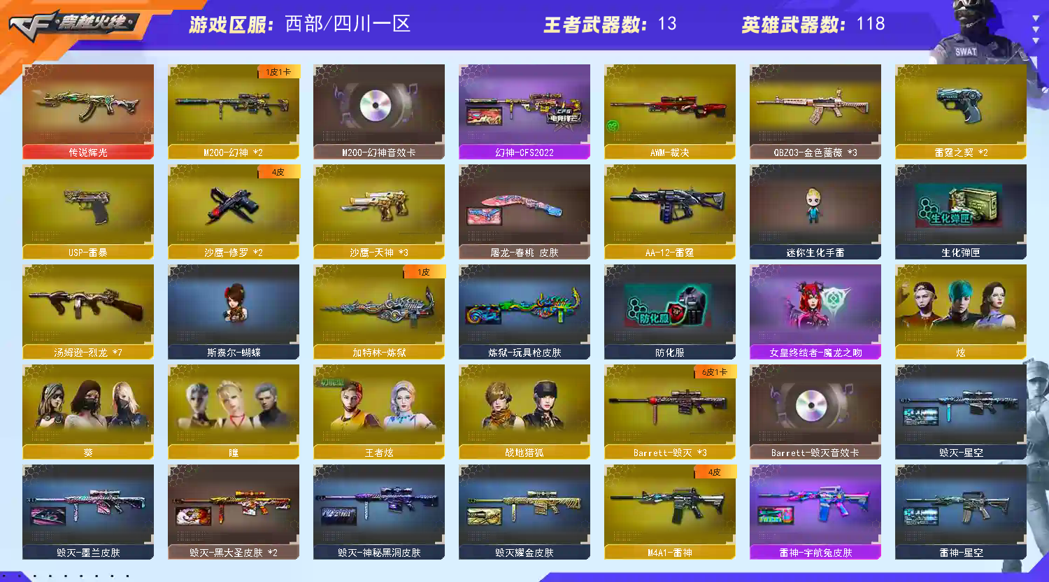 西部极品号 【重要套装】雷暴套装/雷霆套装 【重要角色】_葵/_瞳/_炫/王者炫/灵动武士/铁骑荣耀/空/兰-海滩派对 【传说武器】传说辉光 【英雄武器】_M200-幻神(2)/Barrett-毁灭(3)/Barrett-朱雀/Barrett-暗月传说(3)/雷霆之怒/AWM-天龙/AWM-裁决/王者之力-觉醒版/M4A1-雷神/M4A1-黑龙(2)/M4A1-千变/M4A1-黑骑士(3)/M4A1-雷霆/M4A1-猎神/M4A1-玫瑰精灵/王者之魄-觉醒版/王者之势-觉醒版/白虎-电玩蓝兔/AK12-天启/AK47-火麒麟(2)/无影-神兵利器/AK47-雷暴/AK47-黑鲨(2)/AK47-黑武士/AK-47-猩红传说(10)/AK47-机械迷城/AK47-B-常胜将军/AK47-B-战士/AK47-B-战神(2)/AN94-超新星/QBZ03-金色蔷薇(3)/9A91-烈火/汤姆逊-烈龙(7)/AA-12-雷霆/加特林-炼狱/雷霆之契(2)/沙鹰-天神(3)/沙鹰-修罗(2)/USP-雷暴/麒麟刺(4)/龙啸/王者之啸-觉醒版/擎天(2)/屠龙(3)/雷霆之锋/王者之锋-觉醒版/斩神刀-雷暴/高爆手雷-雷暴(5)/高爆手雷-雷霆(7)/烟雾弹-云龙/烟雾弹-雷暴(5)/烟雾弹-雷霆(7)/烟雾弹-雷霆王者-觉醒版/闪光弹-雷暴(5)/闪光弹-雷霆(7)/闪光弹-雷霆王者-觉醒版 【王者武器】王者凛烈/M4A1-雷霆王者/雷霆王者之锋/高爆手雷-雷霆王者(3) 【小人枪】M4A1-雷神-精英刀锋/AWM-灵狐-15周年嘉年华/斯泰尔-蝴蝶/COP-旗袍/夺魂/迷你深渊冰龙(2)/魔能飞环-曼陀罗(2)/冰火魔兽(6)/迷你牛牛/迷你裂空之翼(2)/生化手雷-机甲核心/闪光弹-小乔/迷你生化手雷 【其他重要武器】炫金骑士/炫金无影/炫金毁灭/炫金修罗/M4A1-十二生肖·龙-雷神/M4A1-英雄-能量核心/冰龙粉碎者-白马银枪/激光毁灭者III-白马银枪/激光毁灭者I(2)/激光毁灭者III/黄金AK-47(3)/M14EBR-炎龙/M4A1-秘银赤龙(2)/M4CQBR-AP-孔明(2)/M4A1-S-火种/AN94-青花瓷(2)/M4A1-水枪-机甲核心/AK47-苍龙/AK47-齐天大圣/M4A1-XS-耀龙/M4A1-破空冰刃(2)/M4A1-情人节2019(2)/AK47-肯德基/QBZ03-锋芒破茧/G3A3-SS-枪王排位/AK47-丹龙/M4A1-樱/AK47-B-十周年(2)/9A-91翡翠(2)/M4A1-战龙(2)/M4A1-SS-枪王排位/M4A1-紫狱/AK47-圣诞节[2019](2)/M14EBR-情人节2020(2)/HK417-赤龙/HK417-红龙/AK-103-红色悦动/深海AK47-Q管家/9A91-赤血龙魂(3)/AK47-枪娘/AK47-轮回/AK47-SS-枪王排位/AK47-破空冰刃(2)/M4A1-电音/AK47-万圣节2018(2)/M4A1-肯德基(2)/M4A1-十年火线(2)/QBZ03-烛龙/M14EBR-赤血龙魂/M4A1-樱花/56式步枪-梨花/黄金AWM/AWM-Pink(3)/M200-萌杀/M82A1-飞龙在天(2)/M200-落樱/暗金M200(2)/M200-WeGame/凤凰之力/Barrett-黑大圣/M200-神秘黑洞/M200-赤血龙魂(3)/FN弩炮-CFS2017纪念版/Barrett-炎龙/巴雷特-情人节2020/AWM-T(3)/Barrett-翔龙/AWM-枪娘/AWM-万圣节2019/雷蛇AWM/M200-圣诞/M200-万圣节2018/AWM-蓝水晶/M200-情人节2019/AWM-圣诞/M240B-卡通(2)/KAC-小动物/KAC-赤烛(3)/EVOIII-萌杀(2)/EVOIII- 曹操/斯太尔-能量核心/EVOⅢ-黑金传说/神圣爆裂者-末日/神圣爆裂者(2)/AA-12-圣龙/SPAS-12-雷电核心(2)/阐释者III/愤怒公牛左轮-枪王排位(2)/沙鹰-枪王排位(3)/新USP-枪王排位奖励(3)/柯尔特-百城(2)/沙鹰-能量核心/COP357-十二生肖·羊/COP-金蝉子-枪王排位/USP-黑大圣(2)/愤怒公牛左轮-丹龙/Anaconda-万圣节2019(2)/Anaconda-雷电核心(2)/COP 357--绚樱/Anaconda-炽焰核心(2)/沙鹰-万圣节2018/沙鹰-雷蛇/金刚伞-电玩红兔/蝴蝶刀-枪王排位(2)/军用铁锹-丹龙(2)/鹰爪-枪王排位/丛林匕首-枪王排位(3)/雷神之怒-机甲核心/尼泊尔军刀-战龙/魔能镰刀/虹光丛林匕首-枪王排位/丛林匕首-卧龙(4)/啸天/军用铁锹-赤龙/军用铁锹-飞龙在天/闪光弹-枪王排位(3)/手雷-能量核心/烟雾弹-机甲核心/胜利奖杯烟雾弹-枪王排位/胜利奖杯闪光弹-枪王排位/胜利奖杯手雷-枪王排位 【重要武器皮肤】幻神-CFS2022/毁灭-星空/毁灭耀金皮肤/毁灭-墨兰皮肤/毁灭-神秘黑洞皮肤/毁灭-黑大圣皮肤/火麒麟-CFSTAR/火麒麟-平天大圣/火麒麟-心动糖果/火麒麟-百城/火麒麟-轻羽皮肤/AK47-B-常胜将军-孙权/M4A1-千变-孔明皮肤/雷神-源计划2.0专属 皮肤/雷神-虎将/雷神-宇航兔皮肤/雷神-能量核心/雷神-星空/黑骑士耀金皮肤/黑骑士-摸金校尉/黑龙-能量核心/战神-流金岁月皮肤/战神-紫绶金章皮肤/战神-粉色甜心皮肤/炼狱-玩具枪皮肤/修罗-冠军之魂/修罗-星空/修罗-能量核心/屠龙-春桃 皮肤/擎天-秘银/龙啸-冠军之啸 【重要光效】王者之锋金色光效/王者之魄金色光效/AK47-黑武士蓝色光效/AN94-超新星蓝色光效/沙鹰-修罗蓝色光效/AK12-天启红绿光效/M4A1-武圣红绿光效/RPK-盘龙红绿色光效/加特林-炼狱红绿色光效/汤姆逊-烈龙红绿色光效/M4A1-武圣紫色光效/M4A1-雷霆王者原始光效 【重要音效卡】M200-幻神音效卡/M4A1-黑骑士音效卡/Barrett-毁灭音效卡 【重要戒指】15周年限定戒指/龙眼(死神)/龙眼(鹰)/金蛇戒/银蛇戒/23赛季纪念戒指-耀银(拇指)/23赛季纪念戒指-耀银(食指) /24赛季纪念戒指-耀铜(食指)/24赛季纪念戒指-耀银(拇指)/25赛季纪念戒指-耀铜(食指)/25赛季纪念戒指-耀铜(拇指) 【拥有重要玩偶】黄金幸运猪猪玩偶/金色幸运鼠玩偶;USP-雷暴,QBZ03-金色蔷薇,M200-幻神,