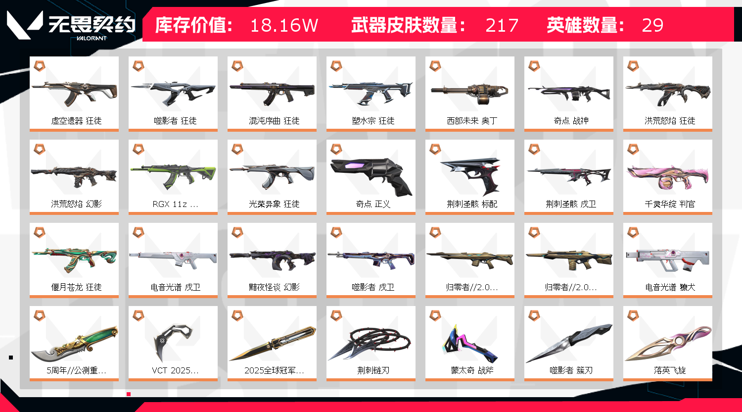 可以打排位,禁止开挂,骂人,炸鱼装一下谢谢。随时更新好用的套装;西部未来 奥丁,奇点 战神,5周年//公测重制版 苍龙之刃,VCT 2025 爪刀,盖亚的复仇 狂徒,虚空遗器 狂徒,洪荒怒焰 狂徒,