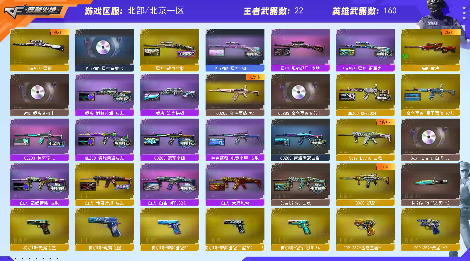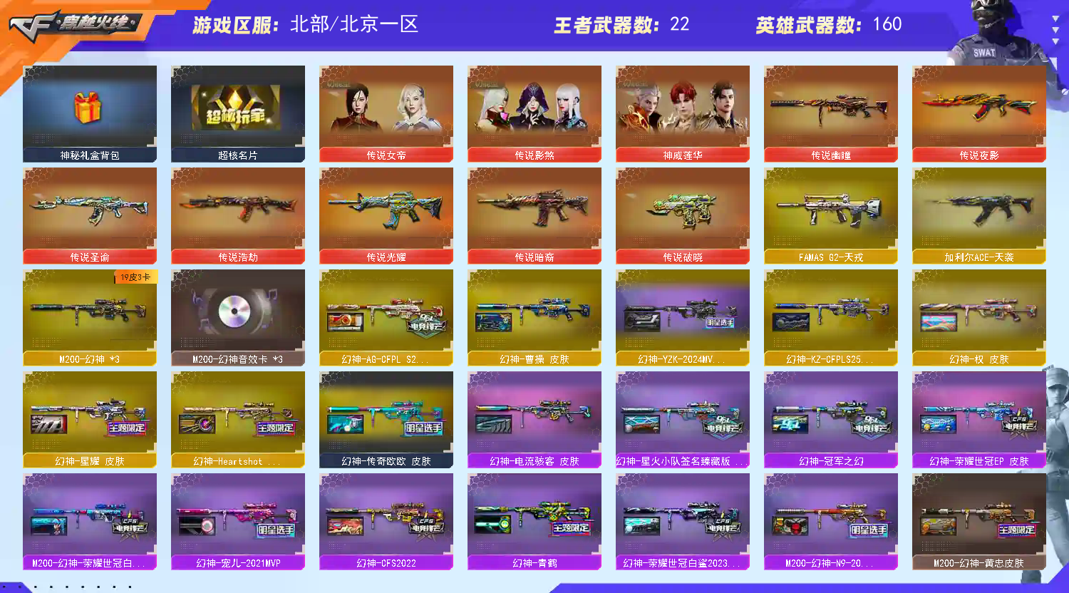 【稀有武器】:传说光耀/传说暗裔/传说夜影/传说幽瞳/传说破晓/M200-幻神(2)/Kar98K-星神/VSK-94-金蚀/G36C-幻影/ScarLight-白虎/M14EBR-玄武/M4A1-青龙/HK417-朱雀/QBZ03-天罚/AK47-雷暴/USP-雷暴(2)/破空枪刃-夜魔/天神-动感闪耀/COP357-云龙(2)/柯尔特-荣耀世冠白鲨2023(2)/柯尔特-无冕之王/修罗-古蛇迷踪/COP357-雷霆王者-觉醒版/柯尔特-冠军之特(4)/金色蔷薇-古蛇迷踪/QBZ03-金色蔷薇/AK47-火麒麟(2)/M4A1-黑龙(2)/M4A1-雷神(4)/M4A1-黑骑士(2)/AK47-无影/AK47-黑武士/Barrett-毁灭/Barrett-极光/AWM-裁决/M200-竞技荣光/RPK-盘龙(6)/加特林-炼狱/汤姆逊-烈龙(6)/AA-12-雷霆/炽芒蝶刃/斩神刀-雷暴/马来剑-夜魔/唐刀-神工天巧/云龙扇 【王者武器】:王者之魄-觉醒版/M4A1-雷霆王者-觉醒版/王者芳薇-觉醒版/王者之怒-觉醒版/王者之光-觉醒版/王者幻神-觉醒版/王者雷怒/王者星霆 【热门角色】:传说女帝/传说影煞/机械姬/研/鹰/雨棠/隼/魅影/奇洋探员/乔伊教练/蛇隐宗/王者-魅影/王者炽天使/王者凌霄/王者潘多拉/流浪蔷薇/职业选手/潘多拉 【热门音效卡】:M200-幻神音效卡(3)/Kar98K-星神音效卡/AWM-裁决音效卡/Scar Light-白虎音效卡/QBZ03-金色蔷薇音效卡/加特林-炼狱音效卡/QBZ03-天罚音效卡/M4A1-雷神音效卡/Barrett-毁灭音效卡/M4A1-黑骑士音效卡/AK47-火麒麟音效卡/M4A1-黑龙音效卡/Barrett-极光音效卡 【热门皮肤】:幻神-AG-CFPLS24冠军皮肤/幻神-Heartshot皮肤/幻神-传奇欧欧皮肤/幻神-星耀皮肤/M200-幻神-N9-2022MVP/幻神-荣耀世冠白鲨2023皮肤/幻神-宠儿-2021MVP/幻神-星火小队签名臻藏版皮肤/M200-幻神-荣耀世冠白鲨/幻神-CFS2022/幻神-电流骇客皮肤/幻神-曹操皮肤/幻神-青鹤/白虎-白鲨-CFPLS23冠军/裁决-巅峰荣耀皮肤/QBZ03-CFS2024皮肤/荣耀之魄-CFPL十周年臻藏版/星神-破竹皮肤/毁灭-星耀皮肤/金色蔷薇-量子蔷薇皮肤/雷神-高能霹雳 皮肤/QBZ03-传奇宠儿/屠龙-星火燎原/天罚-孙权皮肤/雷神-刘备 皮肤/QBZ03-巅峰荣耀皮肤/Kar98K-星神-冠军之星皮肤/雷神-R.LGD-CFPLS18冠军/屠龙-荣耀世冠AG/擎天-冠军之击/QBZ03-冠军之薇/白虎-巅峰荣耀 皮肤/裁决-流光秘银/火麒麟-大唐荣光/白虎-大汉风骨/白虎-电玩粉兔皮肤/QBZ03-荣耀世冠白鲨/炼狱-虎牙皮肤/M4A1-战神赵云/雷神-宠儿-2019MVP(2)/雷神-传奇N9/AK47-火麒麟-传奇EVEN(2)/极光-高能霹雳皮肤/ScarLight-白虎-冠军之虎皮肤/毁灭-冠军之怒/M4A1-雷神-CFS2019/屠龙-荣耀之锋(2)/雷神-冠军之魄/炽芒蝶刃-冠军炽芒皮肤/雷神-荣耀之魄 【其他亮点】:斯泰尔-蝴蝶/Knife-冠军之刃(2)/幻神-枪娘爱丽丝/VEPR-12-金魔/Scar Light-马枪/黄金猫猫手套-白鲨/烟雾弹-荣耀世冠白鲨2023(2)/超核名片 (截图展示段位不代表实际段位,如赛季更新等不可抗拒因素发生变化,其余道具看截图或咨询客服);USP-雷暴,柯尔特-无冕之王,柯尔特-荣耀世冠白鲨2023,柯尔特-冠军之特,炽芒蝶刃,Knife-冠军之刃,传说影煞,