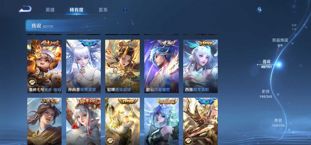 v10、12典藏520皮、马超无双飞将、韩信典藏、马可深海之熄、瑶珍品传说大耳狗之梦、青丘·九尾、枫霜尽、绯月行、前尘镜、至尊宝、天魔缭乱