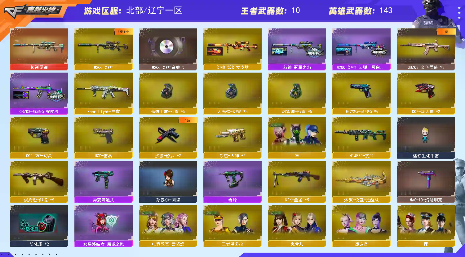 >>>>>>毁号,涉及毁坏虚拟罪及计算机安全罪,请文明游戏素质游戏,让我们共建美好租号平台>>>>>> 本游戏账号:英雄武器142个; 王者武器15个。 装备不多,但是主武器、副武器、近身武器够用 拥有完美游戏体验。重要的是,特殊装备有:擎天-竞技荣光、烟雾弹-竞技荣光、闪光弹-竞技荣光、柯尔特-竞技荣光、传说灵眸、USP-雷暴、M200-竞技荣光、AK47-火麒麟、麒麟刺、龙啸-堕天神、M200-幻神、王者之力-觉醒版、王者之怒-觉醒版、炫金雷神、王者玉锋、炼狱-悦蓝-觉醒版、炫金毁灭、王者之锋-觉醒版、火麒麟-绝迹、迷迭香、蝴蝶、职业选手、堕天使、M4A1-黑骑士音效卡、生化弹匣、M200-幻神音效卡、等,随意畅选。 注意事项: A.游戏过程中请不要恶意挂机或者不文明发言 B.恶意挂机、顶号等行为将被拉黑无法再次下单 C.进入游戏后中途请勿退出登陆,否则无法再次上号 D.部分账号由于异地登录可能会出现密码错误提示,通常再尝试5-6次后可上号 |||||||||喜欢本账号请点 ☆收藏☆ 方便下次租用,谢谢光临惠顾|||||||||;USP-雷暴,隼,电竞教官-云悠悠,RPK-盘龙,QBZ03-金色蔷薇,M200-幻神,Scar Light-白虎,