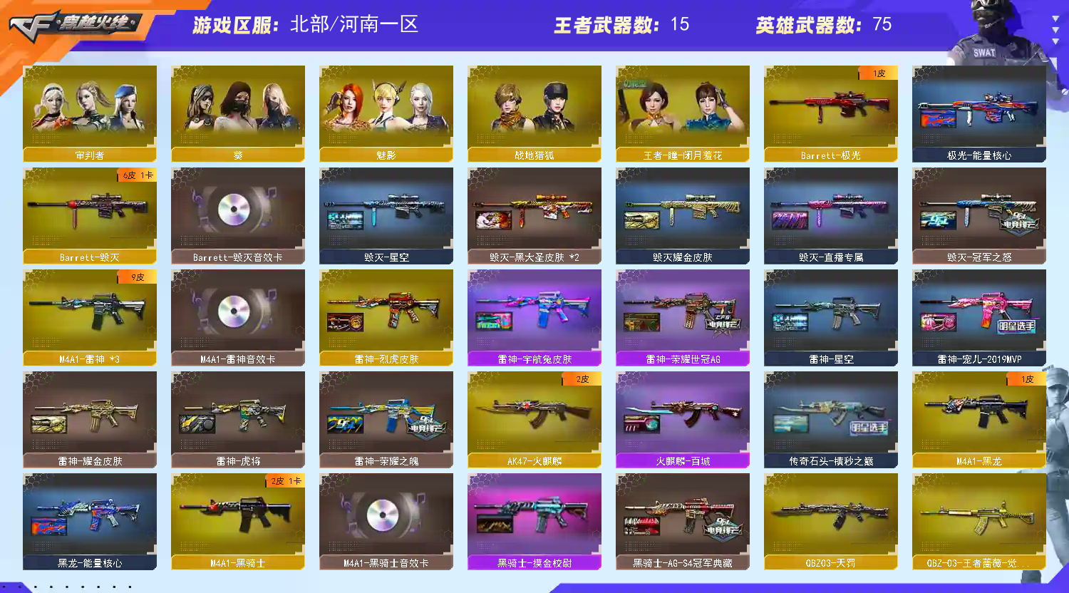>毁号,涉及毁坏虚拟财产罪及计算机安全罪,请文明游戏素质游戏,让我们共建美好租号平台>>>>>> 本游戏账号:英雄武器80个; 王者武器11个。 装备不多,但是主武器、副武器、近身武器够用 拥有完美游戏体验。重要的是,特殊装备有:M4A1-黑骑士、麒麟刺、AK47-火麒麟、AWM-天龙、Barrett-毁灭、M4A1-雷神、M4A1-黑龙、QBZ03-金色蔷薇、COP-堕天神、麒麟刺-堕天神、闪光弹-堕天神、烟雾弹-堕天神、Scar Light-白虎、Kar98K-星神、M200-幻神、USP-雷暴、COP 357-幻灵、荣耀世冠-柯尔特、黑骑士-海王、幻灵之锋、闪光弹-竞技荣光、传说灵眸、王者之魄高爆手雷、王者之魄闪光弹、王者之魄烟雾弹、王者玉锋、王者青龙、QBZ-03-王者蔷薇-觉醒版、王者之光-觉醒版、王者之怒-觉醒版、王者冰魄-觉醒版、潘多拉、堕天使、雷霆-β、魅影、王者-瞳-闭月羞花、王者-春、职业选手、关小雨、王者-迷迭香、圣诞潘多拉-X、王者潘多拉、生化弹匣、Barrett-毁灭音效卡、M4A1-雷神音效卡、M4A1-黑骑士音效卡、M200-幻神音效卡、Kar98;USP-雷暴,荣耀世冠-柯尔特,柯尔特-冠军之特,Knife-冠军之刃,QBZ03-金色蔷薇,G36C-幻影,M200-幻神,