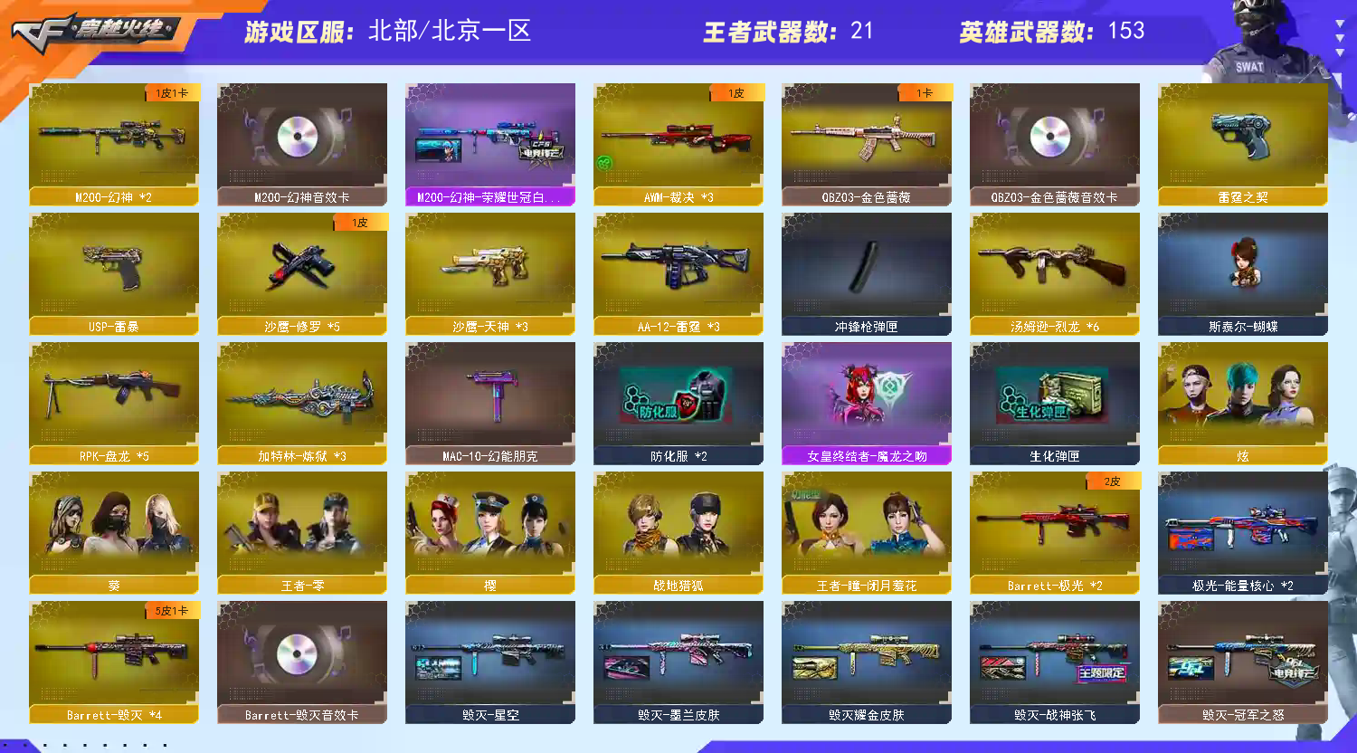>>>>>>毁号,涉及毁坏虚拟财产罪及计算机安全罪,请文明游戏素质游戏,让我们共建美好租号平台>>>>>> 本游戏账号:英雄武器151个; 王者武器31个。 装备不多,但是主武器、副武器、近身武器够用 拥有完美游戏体验。重要的是,特殊装备有:AK47-火麒麟、M4A1-玫瑰精灵、加特林-炼狱、M200-幻神、麒麟刺、USP-雷暴、闪光弹-竞技荣光、烟雾弹-竞技荣光、擎天-竞技荣光、王者之光、炫金骑士、王者之魄、炫金雷神、王者之力-觉醒版、王者之灵、炫金毁灭、炫金天龙、王者之势-觉醒版、王者之幻、炫金武士、王者之怒、王者之戮、王者之翼、王者之魄-觉醒版、王者之光-觉醒版、王者之戮-觉醒版、王者之心-觉醒版、火麒麟-灵狐、王者-瞳-闭月羞花、堕天使、王者-零、M4A1-黑骑士音效卡、王者之心金色光效、M200-幻神音效卡、生化弹匣、等,随意畅选。 注意事项: A.游戏过程中请不要恶意挂机或者不文明发言 B.恶意挂机、顶号等行为将被拉黑无法再次下单 C.进入游戏后中途请勿退出登陆,否则无法再次上号 D.部分账号由于异地登录可能会出现密码错误提示,通常再尝试5-6次后可上号 |||||||||;USP-雷暴,RPK-盘龙,QBZ03-金色蔷薇,M200-幻神,