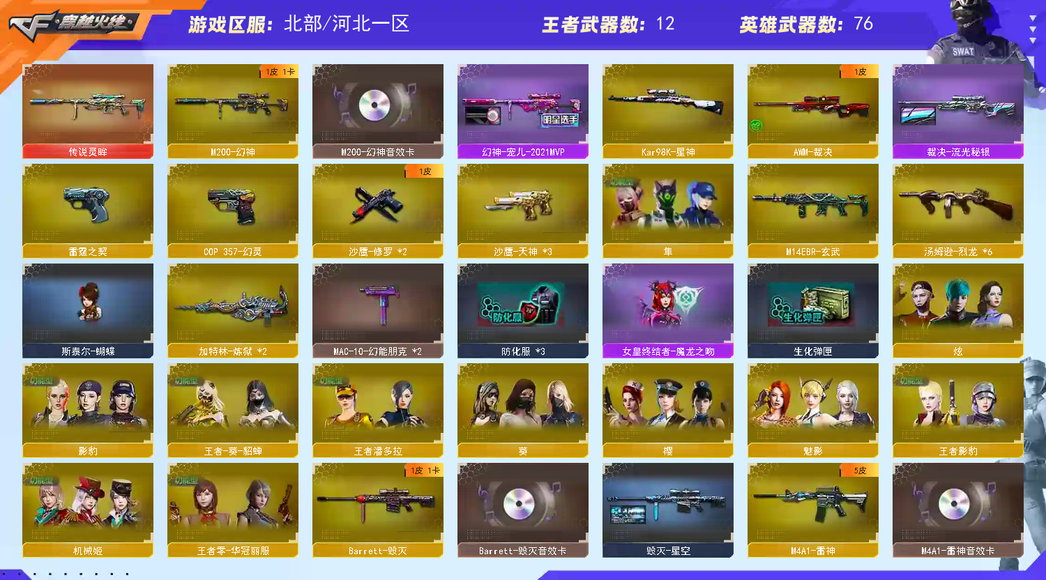 >>>>>>毁号,涉及毁坏虚拟财产罪及计算机安全罪,请文明游戏素质游戏,让我们共建美好租号平台>>>>>> 本游戏账号:英雄武器76个; 王者武器12个。 装备不多,但是主武器、副武器、近身武器够用 拥有完美游戏体验。重要的是,特殊装备有:麒麟刺、加特林-炼狱、黑骑士-海王、传说灵眸、M200-幻神、AK47-火麒麟、M4A1-玫瑰精灵、王者之魄-觉醒版、王者之武-觉醒版、王者之怒-觉醒版、炫金雷神、炫金天龙、魅影、王者-葵-貂蝉、堕天使、王者影豹、M200-幻神音效卡、M4A1-黑骑士音效卡、王者之魄金色光效、生化弹匣、等,随意畅选。 注意事项: A.游戏过程中请不要恶意挂机或者不文明发言 B.恶意挂机、顶号等行为将被拉黑无法再次下单 C.进入游戏后中途请勿退出登陆,否则无法再次上号 D.部分账号由于异地登录可能会出现密码错误提示,通常再尝试5-6次后可上号 |||||||||喜欢本账号请点 ☆收藏☆ 方便下次租用,谢谢光临惠顾|||||||||;隼,M200-幻神,传说灵眸,Kar98K-星神,