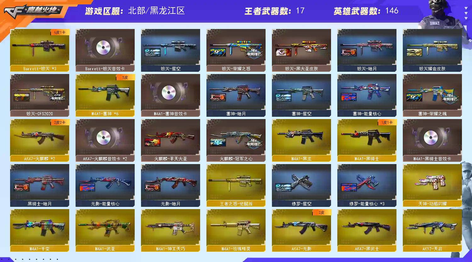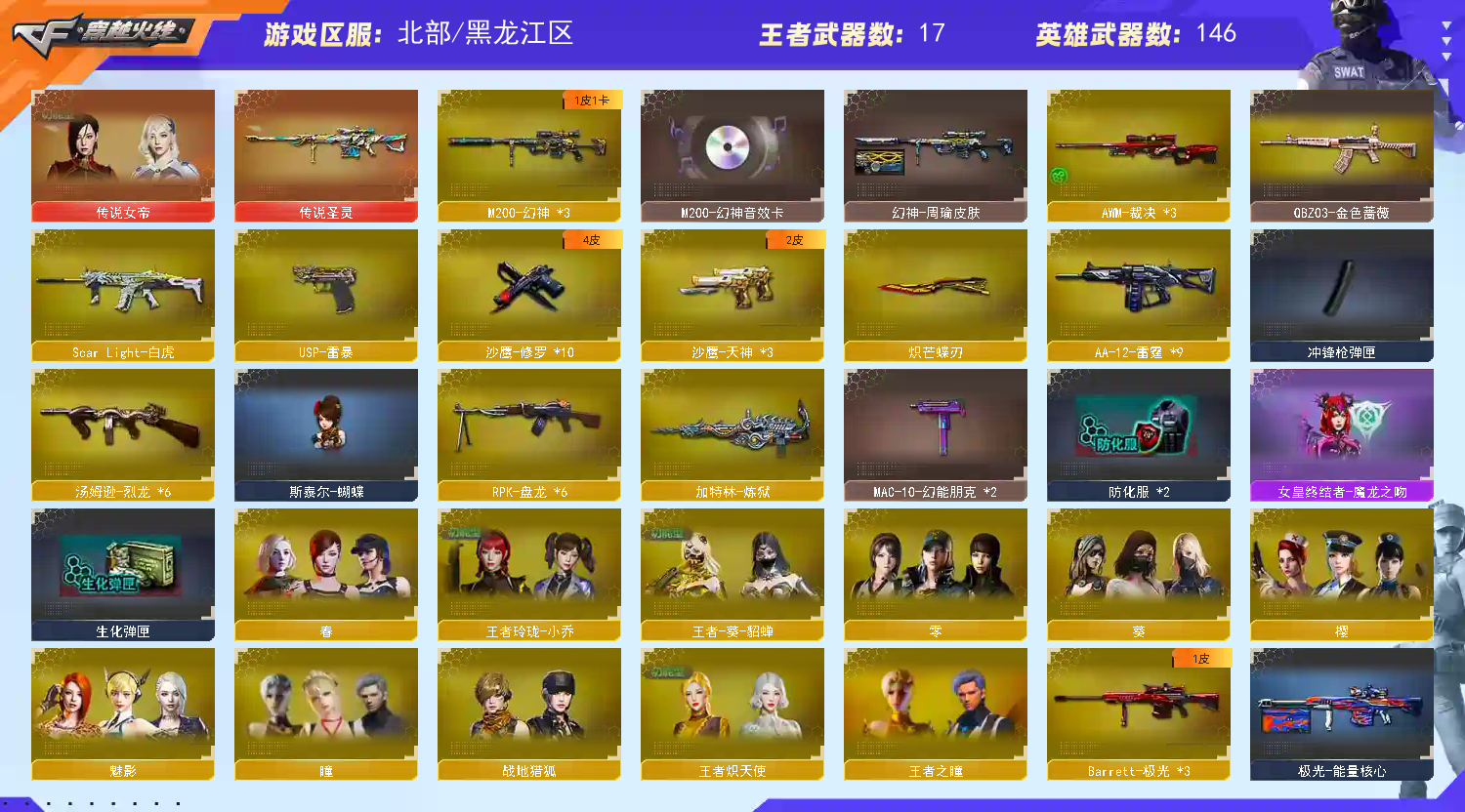 >>>>>>毁号,涉及毁坏虚拟财产罪及计算机安全罪,请文明游戏素质游戏,让我们共建美好租号平台>>>>>> 本游戏账号:英雄武器114个; 王者武器21个。 装备不多,但是主武器、副武器、近身武器够用 拥有完美游戏体验。重要的是,特殊装备有:麒麟刺、M4A1-玫瑰精灵、M200-幻神、HK417-朱雀、传说圣灵、USP-雷暴、AK47-火麒麟、加特林-炼狱、王者之武、王者之幻-觉醒版、王者之力-觉醒版、王者之光、王者之势-觉醒版、王者之影、炫金雷神、王者之锋-觉醒版、王者之魄-觉醒版、王者之心-觉醒版、王者之怒-觉醒版、火麒麟-灵狐、火麒麟-暗月、魅影、传说女帝、王者-葵-貂蝉、雪莉杨、王者玲珑-小乔、职业选手、堕天使、王者之瞳、M4A1-黑骑士音效卡、王者之魄金色光效、王者之心金色光效、M200-幻神音效卡、生化弹匣、等,随意畅选。 注意事项: A.游戏过程中请不要恶意挂机或者不文明发言 B.恶意挂机、顶号等行为将被拉黑无法再次下单 C.进入游戏后中途请勿退出登陆,否则无法再次上号 D.部分账号由于异地登录可能会出现密码错误提示,通常再尝试5-6次后可上号 |||||||||喜欢本账;USP-雷暴,炽芒蝶刃,传说女帝,RPK-盘龙,QBZ03-金色蔷薇,M200-幻神,Scar Light-白虎,