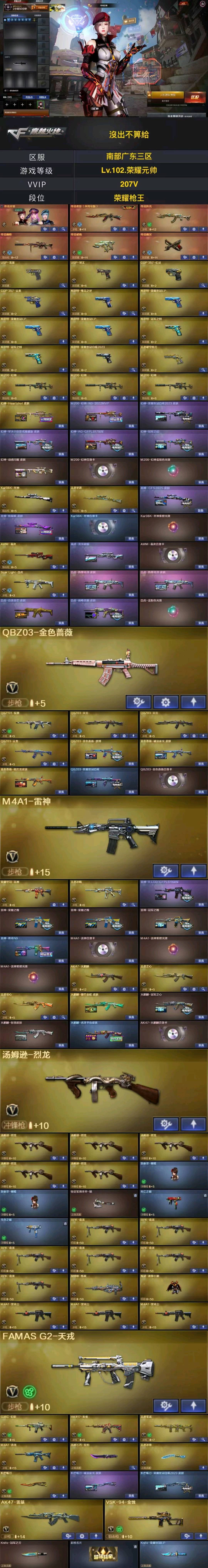 【VVIP数量】220 【重要套装】雷暴套装/云龙套装 【重要角色】传说星骇/_零/魅影/_春/雨棠/鹰/荒漠琉璃/月兔特工/_晴雅/隼/机械姬/雨墨/研/战地猎狐/妮妮/幻面灵狐/王者零-传说之路/王者-零-国色天香/雪域霜狐/葵-阿尔法武装/修道士/铁扇公主/奇洋探员/虚空/乔伊教练/铁骑荣耀/铁骑-乘风破浪/灵狐者-黄金海岸/樱-青春偶像 【传说武器】传说夜影/传说辉光/传说幽瞳/传说幽冥/传说破晓 【英雄武器】_M200-幻神(3)/Barrett-毁灭(2)/Barrett-极光/barrett-金色蔷薇/Barrett-暗月传说/王者蔷薇-觉醒版/Kar98K-星神/AWM-天龙/AWM-裁决/M4A1-青龙/M4A1-雷神(3)/荣耀世冠-雷神/M4A1-死神/M4A1-黑龙(3)/M4A1-龙血/M4A1-千变/M4A1-黑骑士(3)/黑骑士-海王/M4A1-武圣/M4A1-猎神/M4A1-玫瑰精灵/王者猎神-觉醒版/王者之武-觉醒版/王者之势-觉醒版/王者之圣-觉醒版/王者冰魄-觉醒版/王者风势-觉醒版/HK417-朱雀/_Scar Light-白虎/AK12-天启/AK47-火麒麟(2)/王者炎心-觉醒版/AK47-无影/无影-神兵利器/AK47-雷暴/AK47-麒麟/AK47-黑武士/AK-47-猩红传说(2)/AK47-机械迷城/AK47-B-身先士卒/AK47-B-常胜将军/AK47-B-战士/AK47-B-战神/AN94-超新星/QBZ03-云龙/QBZ03-天罚(2)/QBZ03-金色蔷薇/王者之心-觉醒版/王者之城-觉醒版/烈火-动感闪耀/9A91-烈火/RPK-盘龙(6)/汤姆逊-烈龙(6)/AA-12-雷霆/加特林-炼狱/COP 357-云龙/COP 357-幻灵/天神-动感闪耀/沙鹰-天神(5)/沙鹰-修罗(3)/王者之魂-觉醒版/Glock18-武圣/柯尔特-冠军之特(2)/USP-雷暴/云龙扇(2)/麒麟刺(3)/麒麟刺-堕天神/龙啸/王者之啸-觉醒版/擎天/擎天-竞技荣光/王者之击-觉醒版/屠龙-动感闪耀/屠龙(7)/幻灵之锋(3)/王者之锋-觉醒版(2)/斩神刀-雷暴/炽芒蝶刃/手雷-动感闪耀/高爆手雷-云龙/高爆手雷-幻灵(6)/高爆手雷-雷暴(7)/高爆手雷-堕天神/高爆手雷-竞技荣光/烟雾弹-云龙/烟雾弹-幻灵(6)/烟雾弹-雷暴(7)/烟雾弹-堕天神/烟雾弹-竞技荣光/闪光弹-云龙/闪光弹-幻灵(6)/闪光弹-雷暴(9)/闪光弹-堕天神/闪光弹-竞技荣光/HK417-朱雀-电竞之星/机械迷城-穹宇/FAMAS G2-天戎/死神-雪域霜狐/G36C-幻影/QBZ191-银翼游侠/超新星-热带奇洋/黑武士-锦绣游龙/王者火魄-觉醒版/魂·QBZ03-金色蔷薇-古蛇迷踪/VSK-94-金蚀/炼狱-百战金芒/柯尔特-荣耀世冠EP(3)/柯尔特-电竞之星/USP-冥王/柯尔特-荣耀世冠白鲨2023/屠龙-电竞之星/麒麟刺-百战金芒/丛林匕首-玄豹/龙啸-热带奇洋/烟雾弹-荣耀世冠EP(3)/高爆手雷-玄豹/烟雾弹-玄豹/闪光弹-玄豹/手雷-热带奇洋 【王者武器】王者玄武/王者雷影/王者霜心/王者森力/王者星光/王者星霆/王者破空枪刃/王者冰锋/闪光弹-雷暴王者(3)/烟雾弹-雷暴王者(3)/高爆手雷-雷暴王者(3)/王者之魄高爆手雷(3)/王者之魄闪光弹 【小人枪】M4A1-雷神-精英刀锋/牛牛-AK47/火麒麟-灵狐/AWM-灵狐-15周年嘉年华/天龙-曼陀罗/KAC锯式机枪-黑桃战神/炼狱-迷你小钢/MK5-炽火炎龙/斯泰尔-蝴蝶(2)/COP-白鲨/COP-旗袍/夺魂(2)/迷你深渊冰龙/迷你深渊冰龙-王绿豆/迷你钢铁终结者/魔能飞环-曼陀罗/迷你波特博士/小飞碟-宇航兔兔/冰火魔兽 【其他重要武器】炫金黑龙(2)/炫金火麒麟/炫金千变/M4A1-再燃火线/机械赤魂/AK47-再燃火线/冰龙粉碎者-白马银枪/激光毁灭者III/机甲撕裂者III/AK47-苍龙(3)/M4A1-XS-翔龙/XM8-炫彩/M4A1-C-海浪(2)/AK47-B-十周年/M4A1-圣诞2021(2)/金色小号/M4A1-紫炎/M14EBR-炎龙/M4A1-S-火种/M4A1-秘银赤龙(5)/百城M4A1/百城AK47/M14EBR-朋克/M4A1-樱(3)/M4A1-紫狱(2)/AK47-娜塔莎(2)/QBZ03-麟龙/AK47-丹龙/AK103-神秘黑洞/AK47-QT/QBZ03-吕布/AK47-轮回(2)/AK47-SS-枪王排位(3)/AT15-万圣节/AK47-雷蛇/M14EBR-赤血龙魂/M14EBR-情人节2020/AK47-十二生肖-蛇/AK47枪王排位II/黄金AK-47/M4A1-SS-枪王排位/9A91-赤血龙魂/AK47-破空冰刃/9A91-2017万圣节/AK47-枪娘/M4A1-电音/AK47-万圣节2018/9A-91翡翠/M4A1-肯德基/M4A1-情人节2019/HK417-赤血龙魂/QBZ03-烛龙/M4A1-十年火线/M4A1-破空冰刃/AK47-十年火线/M4A1-战龙/M4A1-青龙./M4A1C-死亡之翼/神罚/Barrett-翔龙(2)/AWM-恶棍-枪王排位(3)/雷蛇AWM(3)/AWM-红色悦动/AWM-十周年(2)/Barrett-炎龙(2)/AWM-Pink/AWM-A枪王排位II(2)/百城AWM/M82A1-青龙(2)/M200-萌杀/M200-落樱/双面神/98K-火线13周年/Barrett-麟龙/M200-牡丹(2)/黄金AWM/Barrett-战龙/AWM-摸金校尉/AWM-万圣节刀锋/AWM-奥运/AWM-卡通/暗金M200/破天狂龙/暗金AWM/AWM-涂鸦/AWM-枪娘/AWM-万圣节2019/M200-情人节2019/M200-圣诞/M200-万圣节/M200-万圣节2018/AWM-蓝水晶/98K-烛龙/M200-涂鸦/AWM-2018圣诞/AWM-A/巨龙咆哮Ⅲ/雷蛇加特林/KAC-小动物/MG3-翔龙/M240B-卡通/KAC-耀龙/火狱乱世-超越Max/生存之眼/EVO III-赤血龙魂(2)/异变清道夫/EVO3A1-火线13周年/EVOⅢ-黑金传说/死亡之眼/神圣爆裂者III(2)/试炼破坏者III/征服者-地狱之火 [Lv Max]/神圣爆裂者-末日III/VEPR-12-宙斯/Spas-12-黑金/SPAS-12-雷电核心/Glock-18-宙斯(2)/新USP-枪王排位奖励(4)/蟒蛇-炫彩/幻影Anaconda-枪王排位(2)/COP-金蝉子-枪王排位(3)/愤怒的公牛-朋克/愤怒公牛左轮-枪王排位(2)/沙鹰-枪王排位(3)/沙漠之鹰-炎龙/MAC-10-幻能朋克/柯尔特-百城/迷彩沙鹰-70KG/Anaconda-麟龙/COP-青帝(2)/MAC-10-涂鸦(2)/Anaconda-情人节2021/新USP-怒火大圣/幻影沙鹰-枪王排位/Cop357-赤龙/Anaconda-雷电核心/Anaconda-炽焰核心/沙鹰-万圣节2018/COP 357-青龙/沙鹰-雷蛇/沙鹰-青龙/Knife-荣耀世冠EP/轻型军用手斧-再燃火线/尼泊尔军刀-再燃火线/影锋刃-枪王之王/宙斯权杖/招财猫-枪王排位(2)/收割者-枪王排位/虹光丛林匕首-枪王排位/猫猫手套(2)/Knife-冠军之刃/斩神刀-青帝/魔能镰刀/丛林匕