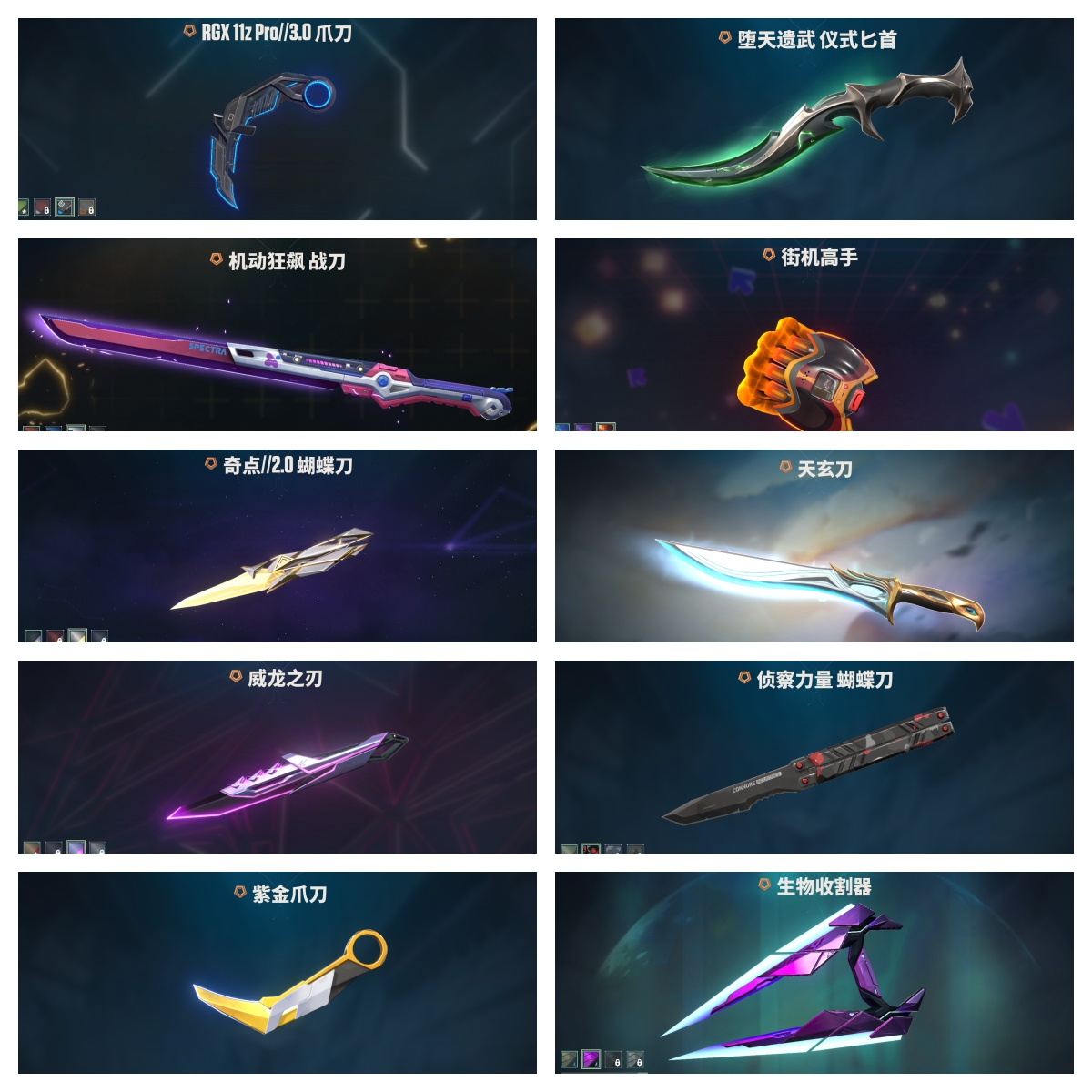 【拥有近战武器】荒土机兵-热能刀,超限闪存-匕首,超能偶像-应援棒,流星兵团-短剑,珍珠棘贝-短剑,钢轨卫士-战锤,沙尘幻旅-匕首,弧光异彩-军刀,机动狂飙-战刀,紫金爪刀,RGX-11z-Pro//3.0-爪刀,天玄刀,