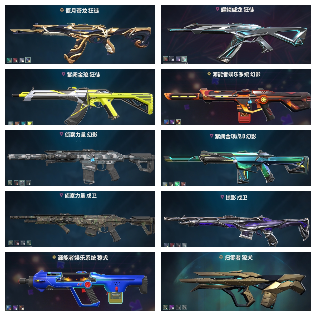 【拥有步枪】光明哨兵-狂徒,混沌序曲-狂徒,塑水宗-狂徒,全息波普//2.0-狂徒,偃月苍龙-狂徒,紫阙金琅//2.0-幻影,紫阙金琅-狂徒,盖亚的复仇-狂徒,海洋之星-狂徒,荒土机兵-狂徒,超限闪存-幻影,超能偶像-戍卫,超能偶像-狂徒,流星兵团-狂徒,珍珠棘贝-幻影,珍珠棘贝-戍卫,钢轨卫士-狂徒,钢轨卫士-戍卫,沙尘幻旅-狂徒,噬源兽防卫工程-幻影,弧光异彩-獠犬,弧光异彩-狂徒,纳米-幻影,逆冲蛮牛-戍卫,逆冲蛮牛-獠犬,模拟赫兹-獠犬,浮光跃金-戍卫,聚合之力-幻影,采蜜小蜂队-獠犬,战术熊与伙伴们-戍卫,复古浪潮-獠犬,战术小伙伴-獠犬,战术小伙伴-幻影,萌彩剪影-戍卫,胡桃狂想-獠犬,彩梦之城-戍卫,