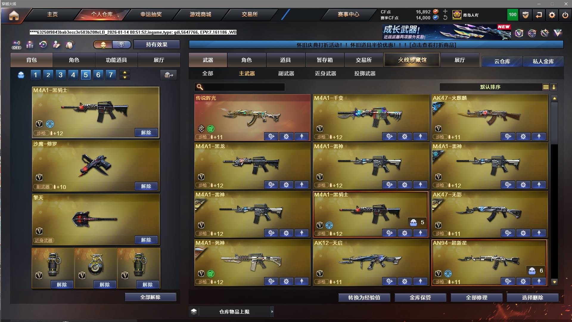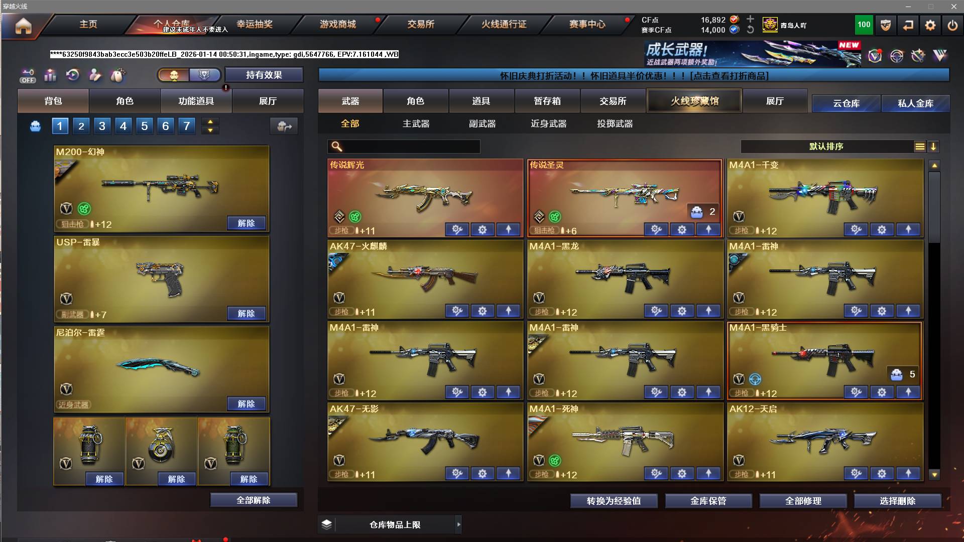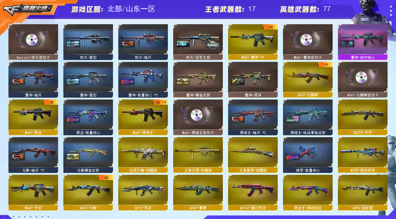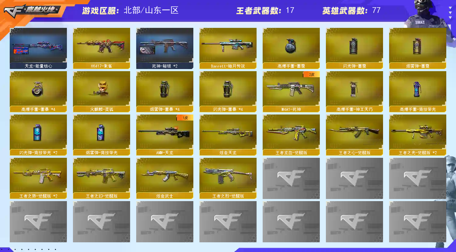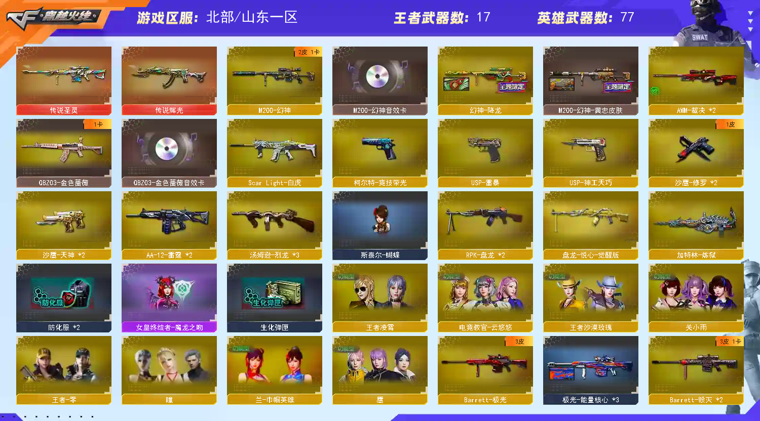 王者武器:王者之光-觉醒版;盘龙-悦心-觉醒版;王者玉锋;王者之怒-觉醒版;王者之烈-觉醒版;王者星神-觉醒版;王者之势-觉醒版;王者龙血-觉醒版;王者之心-觉醒版;王者之击-觉醒版;王者之幻-觉醒版;炫金天龙;炫金武士;炫金天神 英雄武器:黑武士-锦绣游龙;汤姆逊-烈龙;USP-神工天巧;高爆手雷-神工天巧;QBZ03-天罚;传说圣灵;AN94-超新星;HK417-朱雀;Scar Light-白虎;传说辉光;闪光弹-竞技荣光;擎天-竞技荣光;烟雾弹-竞技荣光;高爆手雷-竞技荣光;柯尔特-竞技荣光;M200-竞技荣光;M4A1-黑龙;M200-幻神;AWM-裁决;AA-12-雷霆;沙鹰-天神;麒麟刺;M4A1-雷神;AK12-天启;M4A1-千变;龙啸;USP-雷暴;AK47-雷暴;高爆手雷-雷暴;烟雾弹-雷暴;闪光弹-雷暴;斩神刀-雷暴;QBZ03-金色蔷薇;加特林-炼狱;Barrett-暗月传说;AK-47-猩红传说;Barrett-毁灭;雷霆之锋;高爆手雷-雷霆;烟雾弹-雷霆;闪光弹-雷霆;屠龙;M4A1-死神;沙鹰-修罗;Barrett-极光;RPK-盘龙;AK47-无影;;USP-雷暴,电竞教官-云悠悠,王者沙漠玫瑰,RPK-盘龙,QBZ03-金色蔷薇,M200-幻神,Scar Light-白虎,