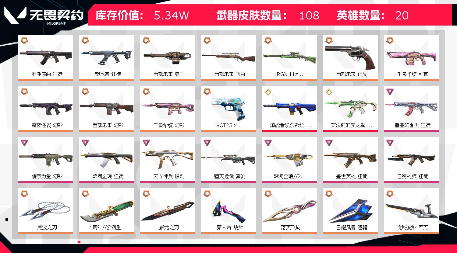 狂徒:塑水宗 盖亚的复仇 混沌序曲 盖世英雄日冕雄狮 紫金 幻影:源能者娱乐系统 黯夜怪谈 莲花 侦察力量 西部未来 刀:黑波之刃 落英飞旋 未来开拓者 威龙之刃 苍龙之刃 手枪:西部未来正义 VCT-IEV25标配 威龙鬼魅 冲锋枪:猫猫骇灵 天界刺针 狙击枪:堕天遗武大狙 西部未来鸟狙 显卡莽侠 机枪:紫金奥丁 西部未来奥丁;西部未来 奥丁,黑波之刃,5周年//公测重制版 苍龙之刃,威龙之刃,盖亚的复仇 狂徒,源能者娱乐系统 幻影,侦察力量 幻影,