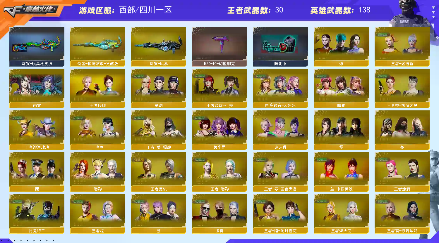 首页 > 租号大厅 > 穿越火线 > 电信区/四川一区 > VIP6/10传说/女帝/影煞/艾莉莎138英雄/热门武器角色