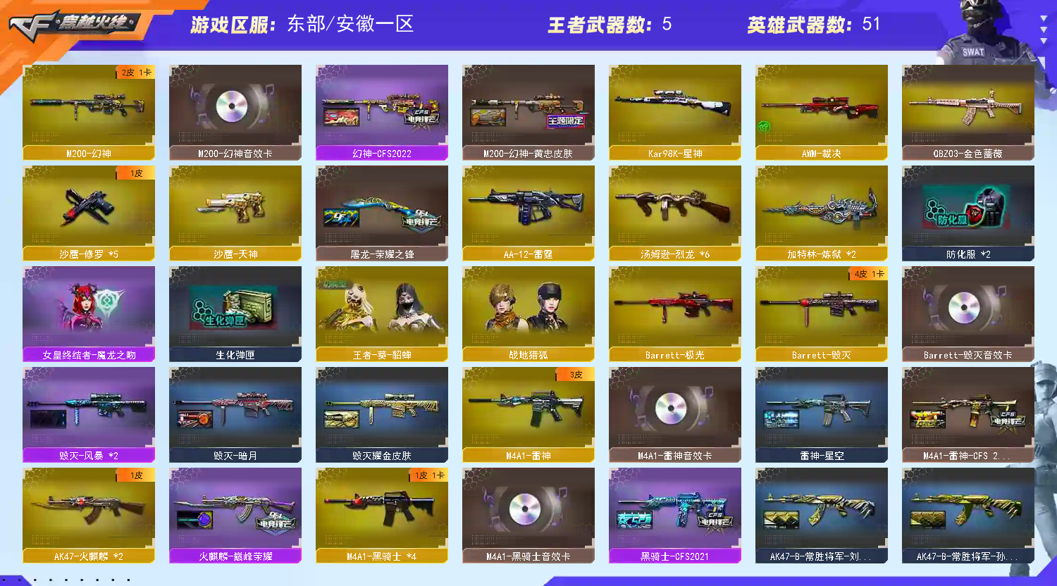 Lv.102 荣耀元帅,0传说/9王者/0炫金/51英雄/CF点1548/【重要角色3】王者零传说之路/铁骑荣耀/角色-职业经理【王者武器8】王者之心-觉醒版/QBZ-03-王者蔷薇-觉醒版/王者之魄高爆手雷*3/王者之魄烟雾弹/王者之魄闪光弹*2【热门武器21】M200-幻神/荣耀世冠-火麒麟/荣耀世冠-雷神/6烈龙/6盘龙/5修罗/炼狱【英雄武器51】无影-神兵利器/AK47-火麒麟/QBZ03-金色蔷薇/AK47-B-战神/AK-47-猩红传说/AK47-B-常胜将军/AK47-B-战士/AK47-B-身先士卒/M4A1-雷神/荣耀世冠-雷神/荣耀世冠-火麒麟/黑骑士-海王*2/M4A1-黑骑士/Barrett-极光/M200-幻神/Barrett-暗月传说/Barrett-毁灭/烈龙-云海游龙/汤姆逊-烈龙*6/RPK-盘龙*6/加特林-炼狱/擎天-云海游龙/龙啸-烈火龙威/幻灵之锋/麒麟刺/龙啸/擎天/屠龙*2/手雷-云海游龙/高爆手雷-幻灵*4/烟雾弹-幻灵/沙鹰-修罗*5【热门皮肤16】M200-幻神-黄忠/幻神-AG-CFPLS17冠军/M4A1-雷神-CFS 2019/毁灭-冠军之怒/白虎-AG-CFPLS20冠军/天龙-CFSTAR*2/火麒麟-CFSTAR*3/修罗-CFSTAR*2/火麒麟-百城/火麒麟-平天大圣/火麒麟-心动糖果/炼狱-星空【人偶武器4】灵狐娃娃手雷/闪光弹-貂蝉/高爆手雷-大乔/AWM-灵狐-15周年嘉年华【暴走生化武器12】汤姆逊-烈龙*6/RPK-盘龙*6【挑战武器3】M4A1-黑骑士/机甲撕裂者III/神圣爆裂者-末日III【音效卡武器3】M4A1-黑骑士音效卡/M200-幻神音效卡/Barrett-毁灭音效卡【普通皮肤6】AK-47-雷神/AK47-B-常胜将军-刘备/AK47-B-常胜将军-曹操*2/AK47-B-常胜将军-孙权/极光-能量核心【光效3】巴雷特-毁灭蓝色光效/加特林-炼狱蓝色光效/AWM-天龙蓝色光效【玩偶9】枪娘阿敏玩偶/15周年玩偶/小兔姬玩偶/大乔玩偶/三国-吴国玩偶/三国-魏国玩偶/大乔玩偶/关羽玩偶/灵狐潜伏者玩偶【戒指武器12】25赛季纪念戒指-耀银(拇指)/25赛季纪念戒指-耀银(食指)/15周年限定戒指/24赛季纪念戒指-耀银(拇指)/24赛季纪念戒指-耀铜(食指)/23赛季纪念戒指-耀银(拇指)/22赛季纪念戒指-耀银(拇指)/22赛季纪念戒指-耀铜(食指)/21赛季纪念戒指-耀银(拇指)/21赛季纪念戒指-耀铜(食指)/20赛季纪念戒指-耀金/龙眼(鹰);QBZ03-金色蔷薇,M200-幻神,Kar98K-星神,