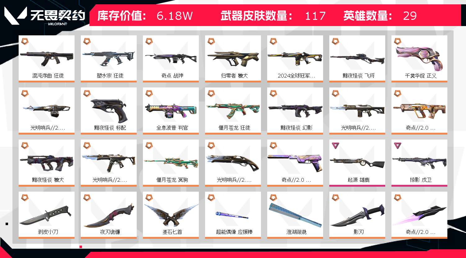 【拥有套装】黯夜怪谈套装(黯夜怪谈-幻影,黯夜怪谈-獠犬,黯夜怪谈-飞将,黯夜怪谈-标配,夜刃诡镰)奇点2.0套装(奇点//2.0-狂徒,奇点//2.0-鬼魅,奇点//2.0-蝴蝶刀)光明哨兵2.0套装(光明哨兵//2.0-幻影,光明哨兵//2.0-奥丁,光明哨兵//2.0-骇灵,光明哨兵//2.0-短炮,圣石匕首)2024全球冠军赛套装(2024全球冠军赛-幻影,2024全球冠军赛-战刀)掠影套装(掠影-狂徒,掠影-冥驹,掠影-戍卫,掠影-正义,影刃)