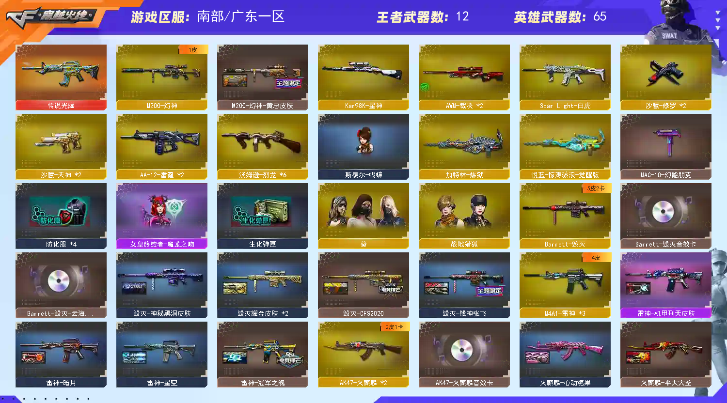 传说光耀|M200幻神黄忠98k星神|幻神竞技荣光|6烈蝴蝶|白虎青龙|4音效|生化爆破全装号 南部战区合区大区(江西一区、南方大区、湖南一区、湖南二区、湖北一区、湖北二区、广东一区、广西一区、广东二区、广东三区、广东四区)登录的时候选择广东一区 【编号】:GDA540 【角 色】:葵、新海豹突击队、救世主-X、蜀雪、铁骑荣耀、影舞者-X、8周年戒指、双蛇戒指、双龙戒指 【主 武】:传说光耀、M200幻神(黄忠)、98K星神、M200竞技荣光、6烈龙蝴蝶、白虎、青龙、Barrett朱雀、火麒麟X2(STAR)、黑龙、雷神X3(冠军之魄、星空)、黑骑士X2(马超)、死神、黑武士、天启、玫瑰精灵X2、烈火、黑武士网剧、天龙(STAR)、毁灭(耀金)、裁决X2、王者森觉X2、Barrett朱雀、毁灭征服者、冰龙粉碎者、机甲撕裂者、激光毁灭者、圣炎切割者、深渊巨龙咆哮、神圣爆裂者、试炼破坏者、苍雷、金魔等各种活动武器 【副 武】:修罗X2(STAR)、天神、天神网剧、阐释者、COP小青龙、胜利之火、大黄蜂 【近 身】:屠龙、龙啸X2、擎天(秘银)、尼泊尔雷霆、马来剑夜魔、擎天云海游龙、龙啸热带奇洋、龙啸云海游龙、龙啸烈火龙威、丛林匕首-枪王排位、猫猫手套、激光短刃、冰火魔拳 【投 掷】:雷霆套装、夜魔套装、深渊终结者手雷、胜利之光、高爆手雷-雷蛇、高爆手雷-SS 【道 具】:火麒麟音效卡、毁灭云海游龙音效卡、黑骑士音效卡、毁灭音效卡、审判者玩偶、7个背包、AC(防弹衣+防弹头盔)、C4工具钳、手雷包、挑战弹夹、夺命之镰、变异宝贝、灵魂忍者、生化弹夹、防化服、机枪弹夹、冲锋枪弹夹、散弹枪弹夹、手枪弹夹、狙击枪弹夹、步枪弹夹、减少停顿包;M200-幻神,Scar Light-白虎,Kar98K-星神,
