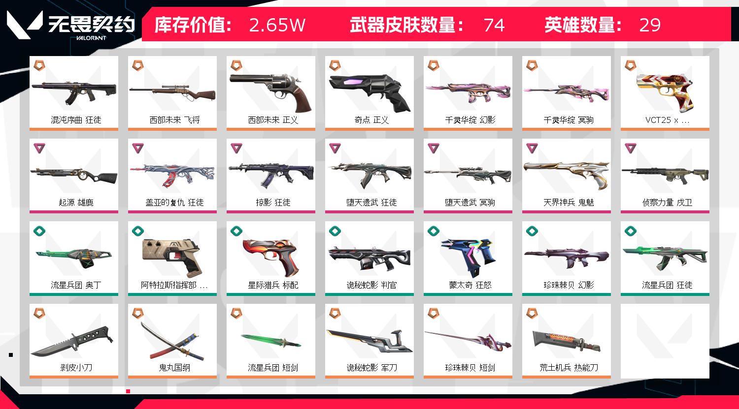 首页 > 租号大厅 > 无畏契约-wegame > wegame/wegame > 长租特惠❗️🈲挂机💖热门皮肤几乎都有💗混沌,掠影,盖亚,剥皮,遗武,莲花,奇点西部未来正义