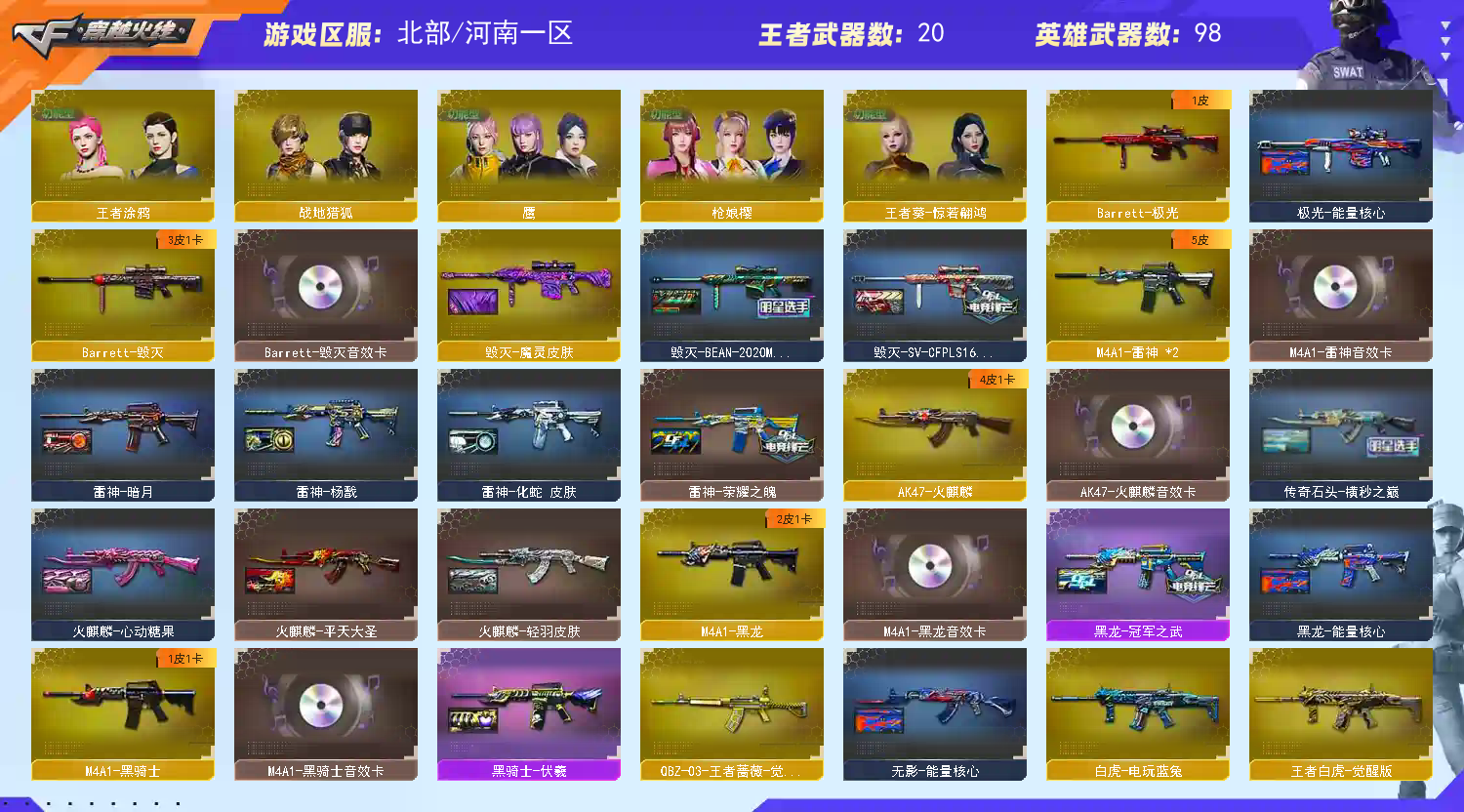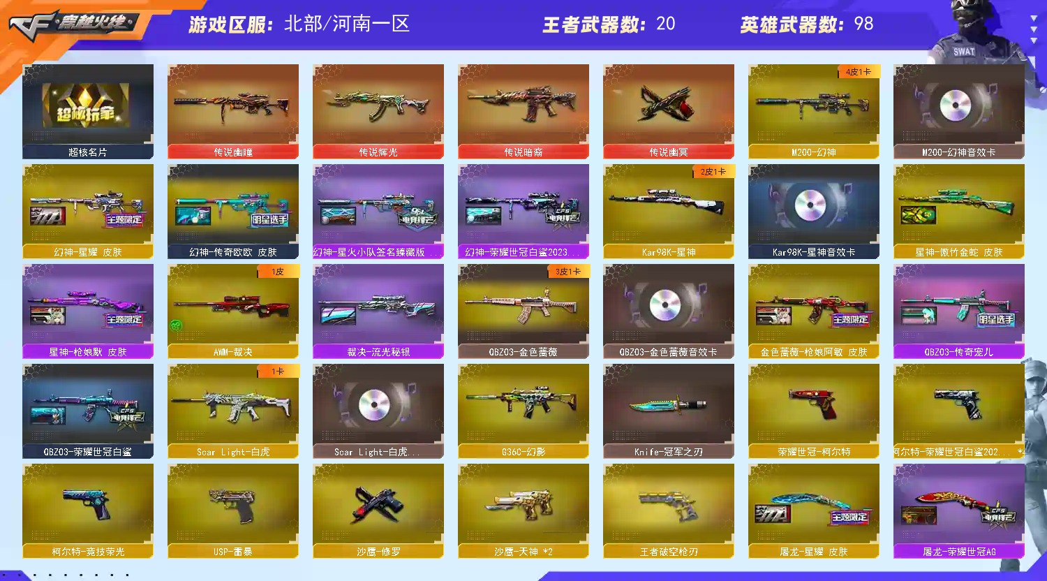 【重要套装】竞技荣光套装 【重要角色】_葵/_樱/雨棠/鹰/电竞教官-云悠悠/荒漠琉璃/关小雨/枪娘樱/_晴雅/隼/司雨/蛇隐宗/蛇姬/王者零-传说之路/王者葵-惊若翩鸿/王者涂鸦/王者雾萌萌/乔伊教练/电竞少女/职业选手/零-热舞青春/_炽天使/铁骑荣耀/灵狐者-黄金海岸/云海玲珑 【传说武器】传说暗裔/传说辉光/传说幽瞳/传说幽冥 【英雄武器】_M200-幻神/M200-竞技荣光/Barrett-毁灭/Barrett-极光/Barrett-朱雀/Barrett-暗月传说(3)/王者之怒-觉醒版/王者星神-觉醒版/Kar98K-星神/AWM-天龙/AWM-裁决/王者之决-觉醒版/M4A1-青龙/M4A1-雷神(2)/雷神-葫芦兄弟/荣耀世冠-雷神/M4A1-黑龙/M4A1-黑骑士/黑骑士-海王(3)/M4A1-武圣/王者之势-觉醒版/王者冰魄-觉醒版/王者风势-觉醒版/王者之戮-觉醒版/HK417-朱雀/_Scar Light-白虎/白虎-电玩蓝兔/王者白虎-觉醒版/M14EBR-玄武/AK12-天启/AK47-火麒麟/AK47-无影/AK47-黑武士/AK47-B-常胜将军/AK47-B-战神/AN94-超新星(2)/QBZ03-金色蔷薇/王者之心-觉醒版/QBZ-03-王者蔷薇-觉醒版/烈火-动感闪耀/王者之烈-觉醒版/RPK-盘龙(6)/汤姆逊-烈龙(6)/AA-12-雷霆/加特林-炼狱/炼狱-悦蓝-觉醒版/天神-动感闪耀/沙鹰-天神(2)/沙鹰-修罗/Glock18-武圣/荣耀世冠-柯尔特/柯尔特-竞技荣光/USP-雷暴/麒麟刺/麒麟刺-堕天神/龙啸/荣耀世冠-龙啸/擎天/擎天-竞技荣光/王者之击-觉醒版(2)/屠龙-动感闪耀/屠龙(3)/幻灵之锋/王者之锋-觉醒版/炽芒蝶刃/手雷-动感闪耀/高爆手雷-幻灵/高爆手雷-堕天神/高爆手雷-竞技荣光(3)/烟雾弹-堕天神/烟雾弹-竞技荣光(3)/闪光弹-堕天神/闪光弹-竞技荣光(3)/G36C-幻影/QBZ191-银翼游侠/黑武士-锦绣游龙/王者风神-觉醒版/柯尔特-荣耀世冠白鲨2023(4)/龙啸-烈火龙威 【王者武器】王者雷影/王者凤吟/王者破空枪刃/高爆手雷-雷霆王者 【小人枪】M4A1-雷神-精英刀锋/Cat-刀锋/牛牛-AK47/Scar Light-马枪/HK417-朱雀-蛇隐宗/天龙-曼陀罗/AWM-灵狐-15周年嘉年华/王者M200-无畏金戈/王者Barrett-英勇金戈/毁灭-孙三炮/Barrett-曼陀罗/裁决-雪莉杨/炼狱-迷你小钢/斯泰尔-蝴蝶/斯泰尔-枪娘暗刃/COP-旗袍/COP-白鲨/真的是手枪/夺魂/迷你深渊冰龙/迷你曼提柯尔/黄金迷你深渊冰龙/黄金迷你裂空之翼/迷你白狐/冰火魔兽/迷你波特博士/迷你裂空之翼/迷你牛牛/Mini沃特X/魔能飞环-曼陀罗/生化手雷-小钢(2)/生化手雷-机甲核心(3)/疾爆手雷-河马 【其他重要武器】炫金骑士/炫金毁灭/炫金修罗/爆炎激光-超越MAX/机甲撕裂者III/激光毁灭者III-白马银枪/凤凰之魄/AK47-苍龙(2)/M4A1-XS-翔龙/M4A1-破空冰刃/AK47-破空冰刃/Scarlight-炫彩/M14EBR-炎龙/AN94-青花瓷/AK47-盛典-CFS 2022/M4A1-S-火种/M14EBR-朋克/M4A1-C-海浪/凤凰之魂/M4A1-XS-耀龙/M4A1-齐天大圣/QBZ03-锋芒破茧/AK103-神秘黑洞/AK47-丹龙/QBZ03-吕布/M4A1-战龙/AK12-幽灵/Barrett-翔龙/AWM-A/AWM-恶棍-枪王排位/Barrett-捣乱兔兔/AWM-Red/AWM-小故障/M82A1-夏日/AWM-7周年/AWM-盛典-CFS 2022/M200-朋克/M200-萌杀/M82A1-水枪-机甲核心/M200-青花瓷/M200-神秘黑洞/AWM-Pink/KAC-圣炎切割者III/MG3-翔龙/火狱乱世-超越Max/CPW-动力-潘多拉/试炼破坏者III/神圣爆裂者-末日/神圣爆裂者/AA-12-圣龙/惩戒者III/MAC-10-幻能朋克(2)/COLT 1911-雷唤苍龙(2)/Colt1911-彩蝶(2)/愤怒公牛左轮-丹龙/沙漠之鹰-盛典-CFS 2022/Cop357-萌杀/COP357-神秘黑洞/凤凰之灵/金刚伞-电玩红兔/黄金猫猫手套-白鲨/猫猫手套/Knife-冠军之刃/军用铁锹-丹龙/蝴蝶刀-枪王排位/尼泊尔军刀-战龙/雷神之怒-机甲核心/烟雾弹-机甲核心 【重要武器皮肤】幻神-星火小队签名臻藏版 皮肤/幻神-欧欧 皮肤/幻神-荣耀世冠白鲨2023 皮肤/幻神-星耀 皮肤/星神-傲竹金蛇 皮肤/星神-枪娘默 皮肤/Barrett-金色蔷薇-蛇姬 皮肤/毁灭-SV-CFPLS16冠军/毁灭-BEAN-2020MVP/毁灭-枪娘巴雷特/毁灭-魔灵皮肤/毁灭-青帝皮肤/极光-能量核心/AWM-天龙-传奇白鲨/天龙-CFSTAR/裁决-流光秘银/火麒麟-CFSTAR/火麒麟-平天大圣/火麒麟-心动糖果/火麒麟-枪娘凯特琳/火麒麟-轻羽皮肤/传奇石头-横秒之巅/无影-能量核心/AK47-B-常胜将军-刘备/AK47-B-常胜将军-孙权/AK-47-雷神/雷神-化蛇 皮肤/M4A1-千变-孔明皮肤/雷神-源计划2.0专属 皮肤/M4A1-雷神-白鲨皮肤/雷神-杨戬/雷神-荣耀之魄/雷神-暗月/黑骑士-伏羲/黑龙-冠军之武/黑龙-暗月/黑龙-能量核心/金色蔷薇-枪娘阿敏 皮肤/QBZ03-荣耀世冠白鲨/QBZ03-传奇宠儿/战神-流金岁月皮肤/修罗-CFSTAR/屠龙-荣耀世冠AG/屠龙-春桃 皮肤/屠龙-荣耀之锋/屠龙-星耀 皮肤/擎天-冠军之击/龙啸-蛇姬 皮肤/龙啸-纸灯龙皮肤/炽芒蝶刃-破浪逐光 皮肤/炽芒蝶刃-荣耀世冠白鲨2023 皮肤/炽芒蝶刃-冠军炽芒皮肤 【重要光效】屠龙-流星光效/炼狱-悦蓝金色光效/王者之击金色光效/王者之锋金色光效/王者星神原始光效/AK47-火麒麟蓝色光效/AWM-天龙蓝色光效/M4A1-死神蓝色光效/加特林-炼狱蓝色光效/屠龙蓝色光效/巴雷特-毁灭蓝色光效/擎天蓝色光效/M200-幻神蓝粉色光效/屠龙红绿色光效/Kar98K-星神紫橙光效/M4A1-雷神紫橙光效/Barrett-极光绿色光效/龙啸-水墨光效 【重要音效卡】Kar98K-星神音效卡/M200-幻神音效卡/M4A1-黑骑士音效卡/M4A1-黑龙音效卡/QBZ03-金色蔷薇音效卡/Scar Light-白虎音效卡/M4A1-雷神音效卡/Barrett-毁灭音效卡/AK47-火麒麟音效卡/擎天-云海游龙音效卡/M14EBR-玄武音效卡 【重要戒指】8周年戒1/8周年戒2/15周年限定戒指/金蛇戒/银蛇戒/魔青之戒/魔海之戒/17赛季纪念戒指-耀银/18赛季纪念戒指-耀金/20赛季纪念戒指-耀金/2