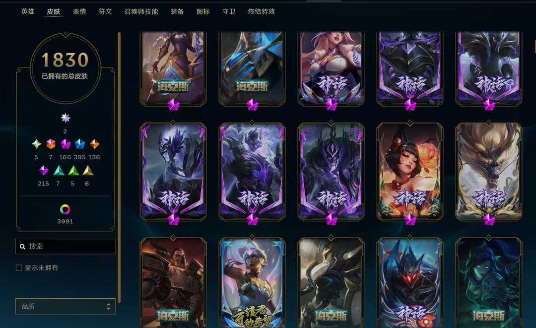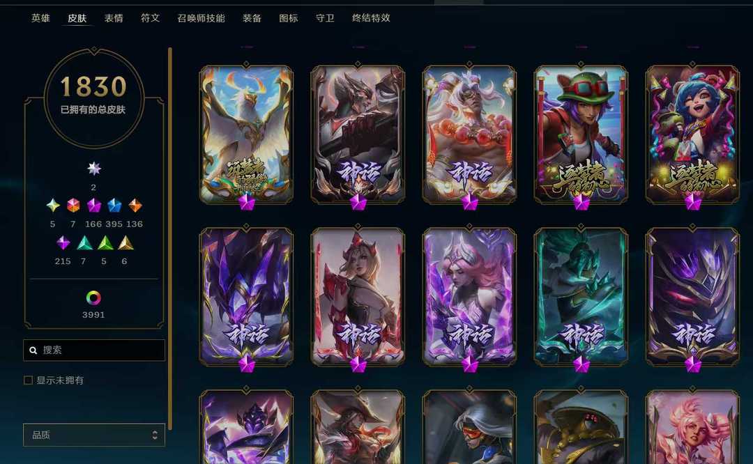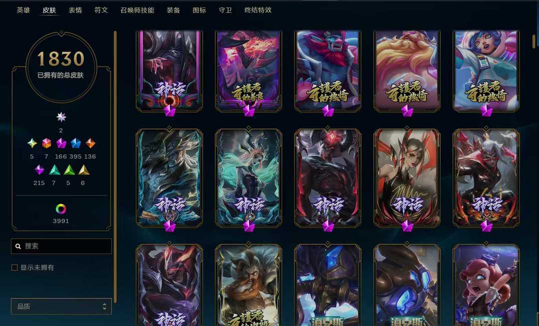 立即租号首页 > 租号大厅 > 英雄联盟 > 联盟一区/祖安 > 1830原皮302臻彩顶级号+云顶全满号⚡满圣堂满神话幻想双殿堂签名版⚡云顶满神话满至臻满神话棋盘