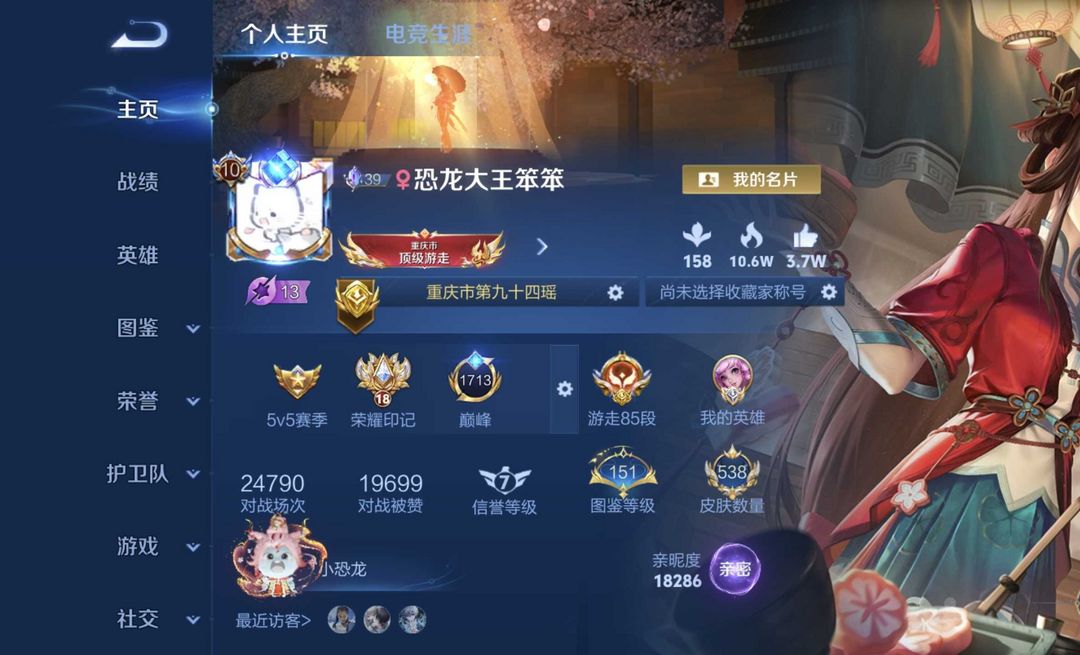 女号正式服在榜省标瑶,现巅峰前10%1713,禁巅峰历史国6瑶游走85段,80评全国十强战队