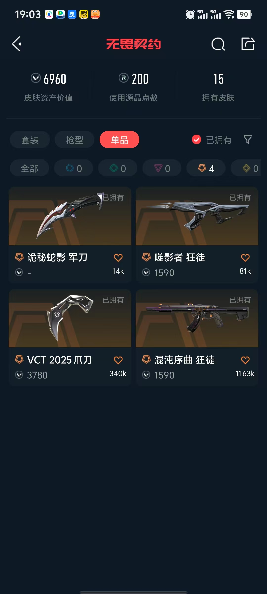 英雄12 武器皮肤数量15VCT2020爪刀 弑影者狂徒 诡秘蛇影 军刀 混沌序曲 狂徒;VCT 2025 爪刀,噬影者 狂徒,混沌序曲 狂徒,