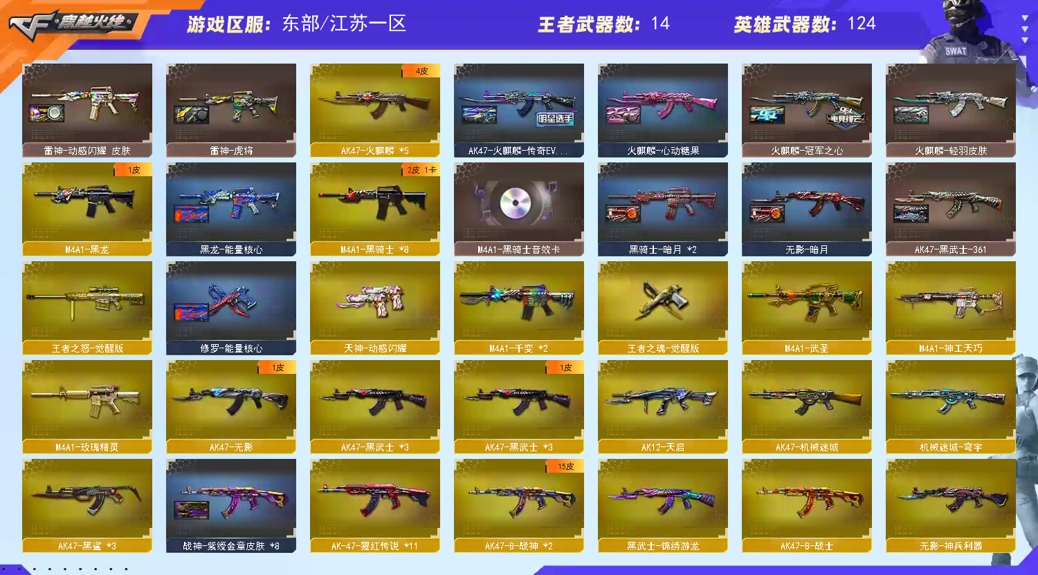 M200幻神|6烈斯太尔蝴蝶6盘龙炼狱|朱雀M4神工天巧王者青龙|2音效|生化爆破全装号 东部战区合区大区(安徽一区、福建一区、上海一区、上海二区、浙江一区、浙江二区、江苏一区、江苏二区、教育大区、移动专区)登录的时候选择江苏一区。 【编号】:JSA407 【角 色】:葵、迷迭香、樱、王者瞳闭月羞花、、麻雀、幻影、堕天使、双蛇戒指、魔龙戒指、耀金纪念戒指 【主 武】:幻神、朱雀、神功天巧、6烈蝴蝶、6盘炼狱、千变X2、火麒麟X4(传奇EV)、黑龙(能量核心)、雷神X6(耀金)、黑骑士X7、无影、死神X3(秘银)、黑武士X3(361)、天启、超新星、武圣、机械迷城、黑鲨X3、、QB金色蔷薇、猎神、王者青龙、天龙X2(STAR)、毁灭X(荣耀之怒)、激光(能量核心)、裁决、AA12雷霆、毁灭征服者、冰龙粉碎者、机甲撕裂者、激光毁灭者、圣炎切割者、深渊巨龙咆哮、神圣爆裂者、试炼破坏者、苍雷、金魔等各种活动武器 【副 武】:修罗X5(能量核心)、天神(暗月)、天神动感闪耀、王者之魂、神阐释者、COP小白龙、COP旗袍、COP神兵利器、涂鸦 【近 身】:屠龙X4、龙啸X3、擎天X2、麒麟刺X4、王者之锋、民裂空之翼、迷你深渊冰龙、魔能飞环曼陀罗 【投 掷】:竞技荣光套装、神工天巧套装、乔高爆、鲲鹏手雷、闪光弹小乔、闪光弹貂蝉、刀锋娃娃手雷 【道 具】:、黑骑士音效卡、毁灭音效卡白虎音效卡、红色艾比玩偶15周年玩偶、小红玩偶、天使灵狐玩偶、7个背包、AC(防弹衣+防弹头盔)、C4工具钳、手雷包、挑战弹夹、夺命之镰、变异宝贝、灵魂忍者、生化弹夹、防化服、机枪弹夹、冲锋枪弹夹、散弹枪弹夹、手枪弹夹、狙击枪弹夹、步枪弹夹、减少停顿;RPK-盘龙,QBZ03-金色蔷薇,M200-幻神,