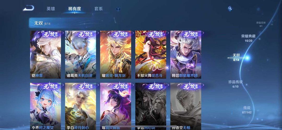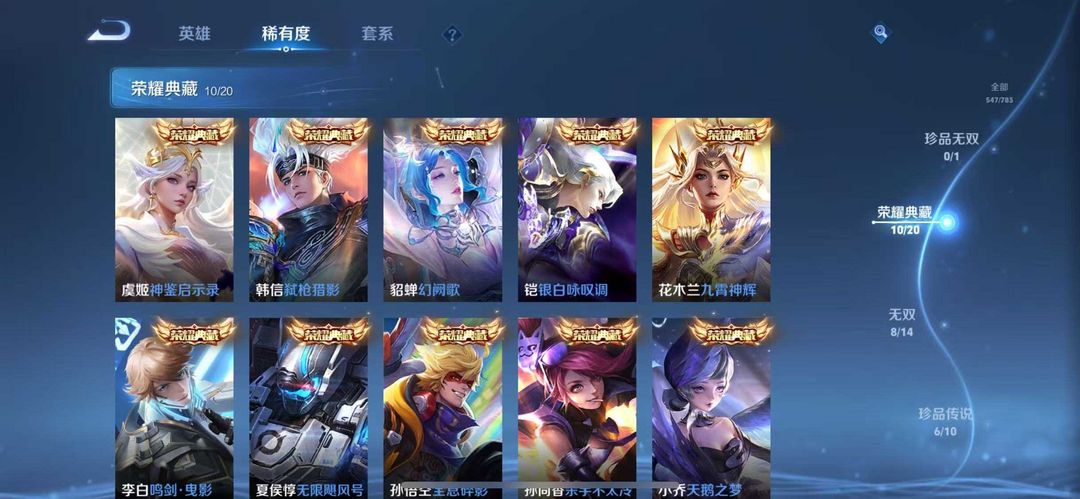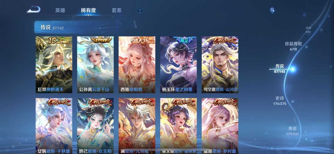 v10、537皮6水4无双、安琪拉-颠倒童话·魔镜、朵莉亚-神骥、遇见神鼓、齐天大圣、白虎志、韩信荣耀典藏、73传说、时之魔女、瑶无双、青丘、九尾、神器明辉仪