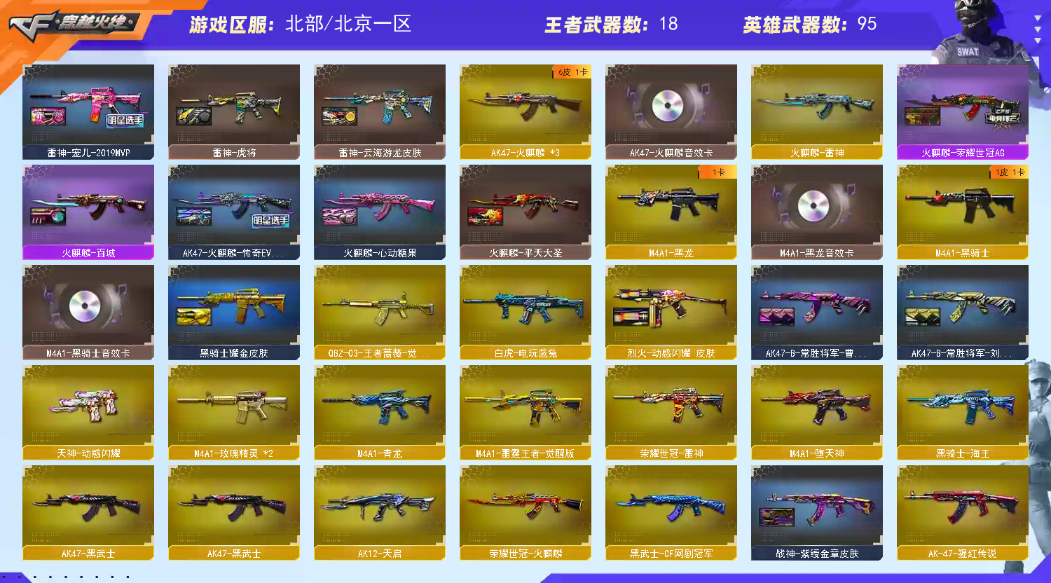 音效卡 M200-幻神音效卡 M4A1-黑骑士音效卡 M4A1-黑龙音效卡 QBZ03-金色蔷薇音效卡 Scar Light-白虎音效卡 火麒麟音效卡 毁灭音效卡 雷神音效卡 天神-动感闪耀 音效卡 黄金猫猫手套 【套装】堕天神套装/荣耀世冠套装/雷霆王者套装 主要武器 M200-幻神/Barrett-毁灭/Barrett-暗月传说(2)/Barrett-雷霆王者-觉醒版/AWM-裁决/M4A1-堕天神/M4A1-青龙/M4A1-雷神(2)/荣耀世冠-雷神/M4A1-死神/M4A1-黑龙/M4A1-黑骑士/M4A1-玫瑰精灵/M4A1-雷霆王者-觉醒版/王者之戮-觉醒版/HK417-朱雀/Scar Light-白虎/白虎-电玩蓝兔/AK12-天启/AK47-火麒麟(2)/荣耀世冠-火麒麟/AK-47-猩红传说/AK47-B-身先士卒/AK47-B-常胜将军/AK47-B-战士/AK47-B-战神(2)/QBZ03-金色蔷薇/QBZ-03-王者蔷薇-觉醒版/烈火-动感闪耀/9A91-烈火/汤姆逊-烈龙(6)/加特林-炼狱/COP-堕天神/COP 357-雷霆王者-觉醒版(3)/荣耀世冠-柯尔特(3) 【武器皮肤】 幻神-宠儿-2021MVP/雷神-荣耀世冠AG/火麒麟-荣耀世冠AG/屠龙-荣耀世冠AG/毁灭-BEAN-2020MVP/毁灭耀金皮肤/毁灭-黑大圣皮肤/雷神-宠儿-2019MVP/雷神-传奇N9/雷神-虎将/雷神-宇航兔皮肤/雷神-烈虎皮肤/雷神-脉冲核心/黑骑士耀金皮肤/黑龙-暗月/M4A1-千变-孔明皮肤/AK47-火麒麟-传奇EVEN/火麒麟-AG战队皮肤/火麒麟-CFSTAR/火麒麟-平天大圣/火麒麟-心动糖果/火麒麟-百城/火麒麟-雷神/AK47-B-常胜将军-刘备/AK47-B-常胜将军-曹操/AK-47-雷神/战神-流金岁月皮肤/战神-紫绶金章皮肤/战神-粉色甜心皮肤/烈火-动感闪耀 皮肤 【此号全部装备太多就不详细描述了,还有很多神器未截图,普通CF点武器也是一百多个就不截图了(满背包满道具爆破、生化、挑战武器应有尽有多个玩偶主流武器多光效),主流枪械都有皮肤音效卡】 喜欢的老板可以加个收藏,这样下次想玩就不怕找不到了。;荣耀世冠-柯尔特,QBZ03-金色蔷薇,M200-幻神,Scar Light-白虎,