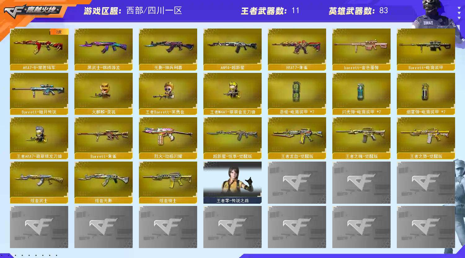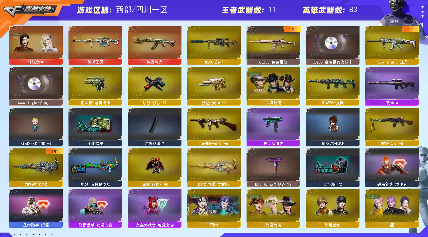 传说女帝辉光圣灵|幻神王者星神|6烈龙蝴蝶5盘龙2炼狱|白虎朱雀玄武青龙|4音效|生化爆破全装 部战区合区大区(四川一区、四川二区、重庆一区、陕西一区、云南一区)登录的时候选择四川一区 【编号】:SC445 【角色】:传说女帝、荒漠琉璃、沙漠玫瑰、鹰、玉棠、王者炽天使、救世主-X、蜀雪、铁骑荣耀、影舞者-X、8周年戒指、双蛇戒指、双龙戒指 【主武】:传说辉光、传说圣灵、幻神、王者星神、青龙、白虎、朱雀、玄武、6烈蝴蝶、5盘2炼狱、火麒麟X2(白虎、关羽)、黑龙(冠军之武)、雷神(荣耀之魄)、黑骑士(伏羲)、无影(霓裳)、超新星、QB金色蔷薇、烈火、玫瑰精灵、烈火、毁灭(荣耀之怒)、激光、Barrett朱雀、Barrett电竞涨价、暗月传说、甲撕裂者、激光毁灭者、圣炎切割者、深渊巨龙咆哮、神圣爆裂者、试炼破坏者、苍雷、金魔等各种活动武器 【副 武】:修罗X7(STAR)、天神柯尔特电竞装甲、天神动感闪耀、阐释者、COP小青龙、胜利之火、 【近 身】:屠龙X3、龙啸(冠军之啸)、擎天、麒麟刺X2、丛林匕首-枪王排位、猫猫手套、激光短刃、冰火魔拳 【投 掷】 :电竞装甲套装X7、深渊终结者手雷、胜利之光、高爆手雷-雷蛇、高爆手雷-SS 【【道 具】:雷神音效卡、黑骑士音效卡、QB金色蔷薇音效卡、白虎音效卡、7个背包、AC(防弹衣+防弹头盔)、C4工具钳、手雷包、挑战弹夹、夺命之镰、变异宝贝、灵魂忍者、生化弹夹、防化服、机枪弹夹、冲锋枪弹夹、散弹枪弹夹、手枪弹夹、狙击枪弹夹、步枪弹夹、减少停顿包;沙漠玫瑰,传说女帝,RPK-盘龙,QBZ03-金色蔷薇,M200-幻神,Scar Light-白虎,