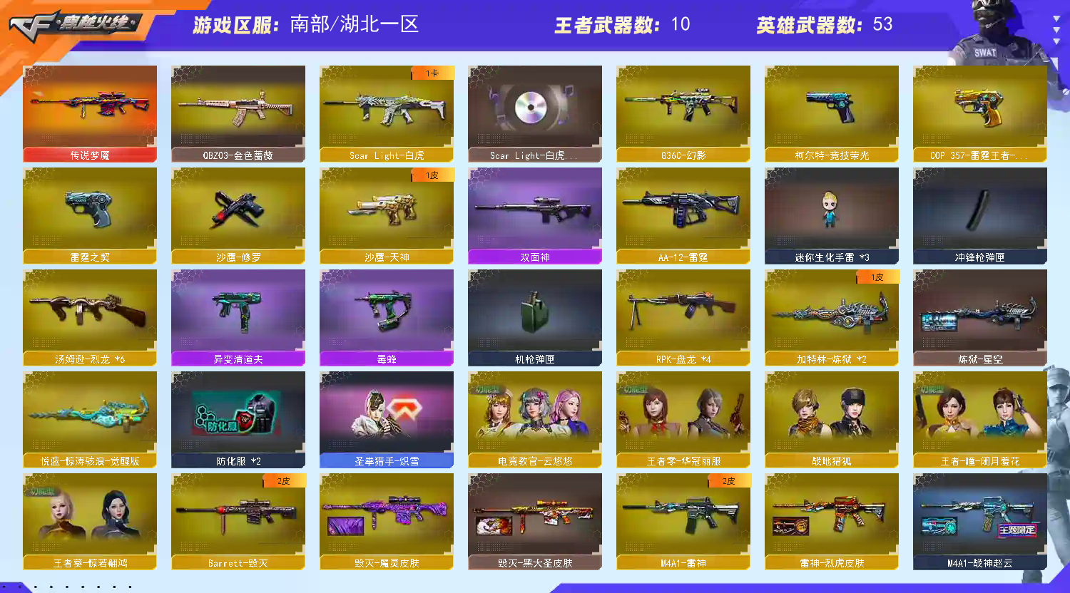 传说梦魇|G36C幻影M200幻神竞技荣光套装|6烈龙毒蜂异变清道夫4盘3炼狱|白虎音效 南部战区合区大区(江西一区、南方大区、湖南一区、湖南二区、湖北一区、湖北二区、广东一区、广西一区、广东二区、广东三区、广东四区)登录的时候选择南方大区 【编号】:HB331 【角 色】:云悠悠、王者瞳闭月羞花、王者葵惊若媥鸿、王者零华冠丽服、风暴女、猎狐者追月、灵狐花神、曼陀罗礼服、黑鹰X、蜀雪、娜塔莎、 【主 武】:传说梦魇、幻神竞技荣光、王者星神、6烈毒蜂、4盘3炼狱、白虎、幻影、火麒麟、黑龙X2、雷神(赵云)、黑骑士、无影、黑骑士、超新星、武圣、机械迷城、黑鲨、龙血X2、QB金色蔷薇、毁灭、Barrett金色蔷薇、激光毁灭者3、巨龙咆哮3、征服者、等各种活动武器 【副 武】:修罗(STAR)、天神(暗月)、武圣、COP雷霆、COP雷霆王者、柯尔特竞技荣光、大黄蜂 【近 身】:屠龙、龙啸、擎天(秘银)、麒麟刺、擎天竞技荣光、炽芒蝶刃等离切割者、破天斩魔剑、 【投 掷】:竞技荣光套装X2、音乐手雷、肥皂手雷、高爆手雷太极、精英手雷2、气球手雷X 【道 具】:白虎音效、铁骑玩偶、审判者玩偶、乔伊教练玩偶、浣熊玩偶、7个背包、AC(防弹衣+防弹头盔)、C4工具钳、手雷包、挑战弹夹、夺命之镰、变异宝贝、灵魂忍者、生化弹夹、防化服、机枪弹夹、冲锋枪弹夹、散弹枪弹夹、手枪弹夹、狙击枪弹夹、步枪弹夹;电竞教官-云悠悠,RPK-盘龙,QBZ03-金色蔷薇,G36C-幻影,Scar Light-白虎,