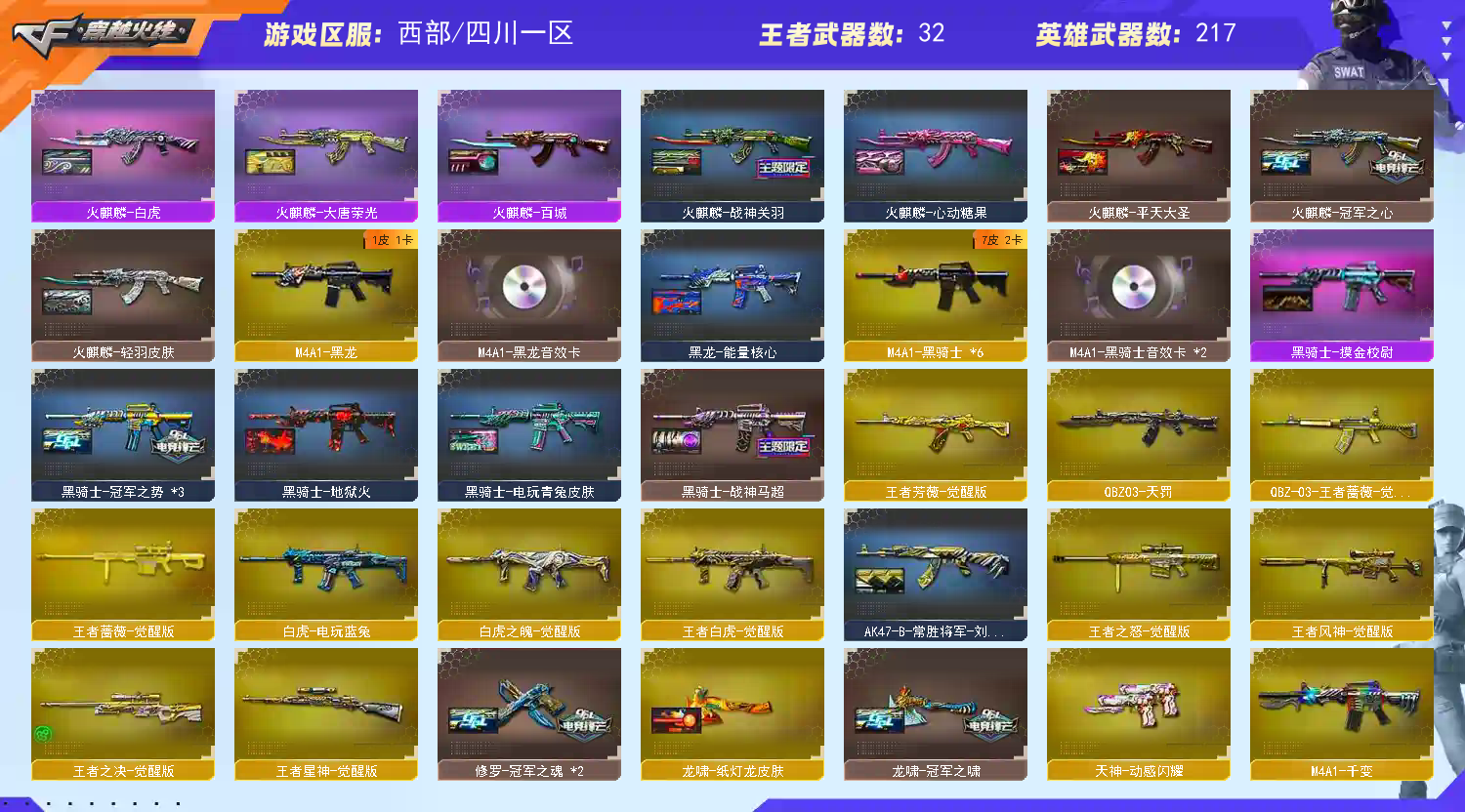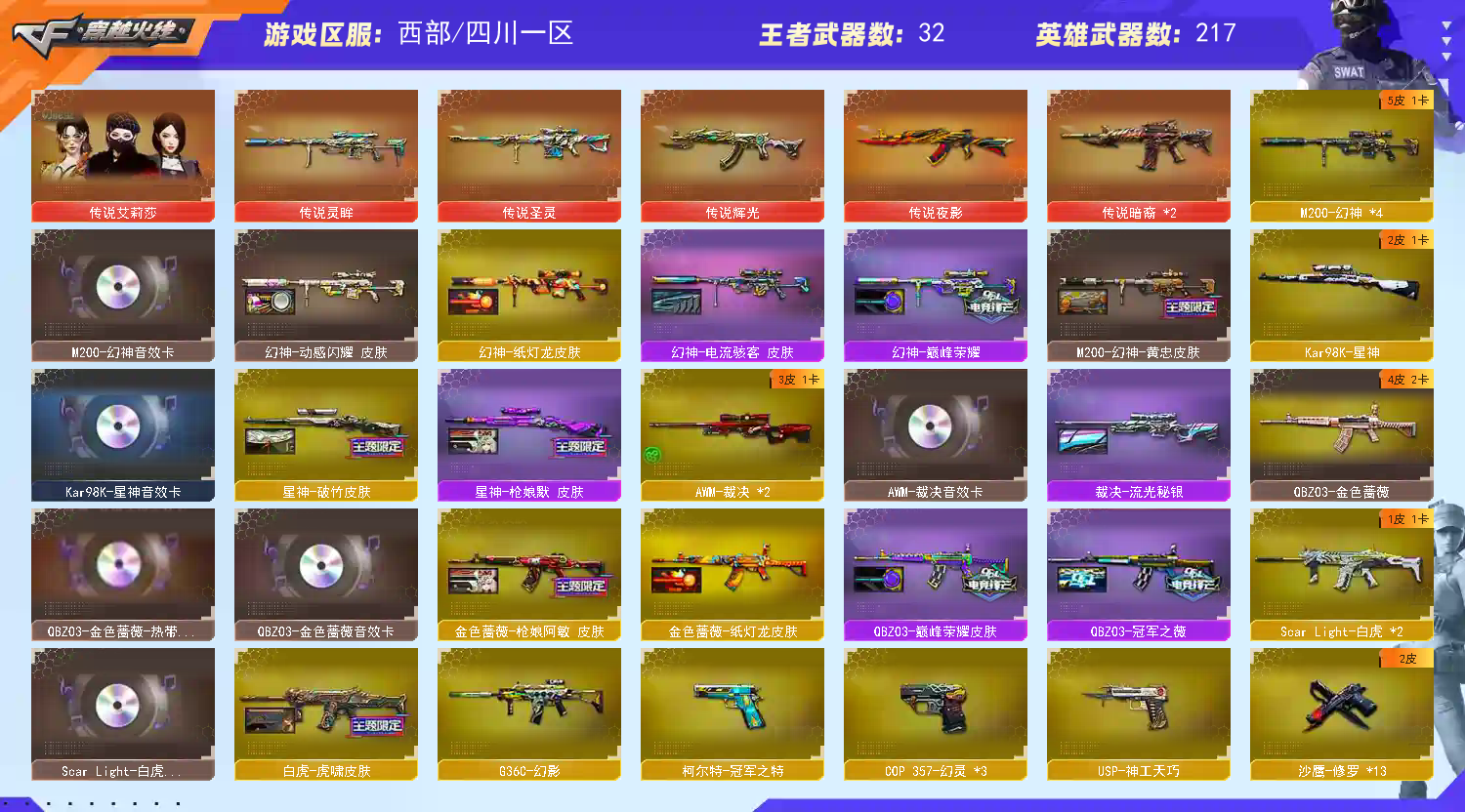 传说艾丽莎灵眸暗裔辉光夜影|幻影幻神巅峰荣耀纸灯笼黄忠动感闪耀4皮音效|星神枪娘破竹音效卡|220V6烈蝴蝶6盘炼狱炽芒蝶刃| 部战区合区大区(四川一区、四川二区、重庆一区、陕西一区、云南一区)登录的时候选择四川一区 【编号】:SC447 【角色】:传说艾丽莎、云悠悠、关小雨、荒漠琉璃、机械姬、枪娘樱、晴雅、司雨、鹰、影豹、雨墨、王者零国色天香、王者瞳闭月羞花、王者之天使、王者空、王者影豹、王者潘多拉、王者沙漠玫瑰、王者樱热浪之夏、救世主-X、蜀雪、铁骑荣耀、影舞者-X、8周年戒指、双蛇戒指、双龙戒指 【主武】:传说灵眸、传说暗翼X2、传说辉光、传说夜影、幻神X4(巅峰荣耀、纸灯笼、黄忠、动感闪耀)、星神(枪娘、破竹)、6盘炼狱、6烈蝴蝶、王者星神、王者风神、青龙、幻影、朱雀、白虎、幻灵、玄武、天罚、神工天巧、金蚀、千变、火麒麟X4(大唐荣光、枪娘、冠军之心、白虎)、雷神X7(脉冲、动感闪耀、耀金、冠军之魄、赵云、冠军之魄)、黑龙(能量核心)、黑骑士X7(宇航兔、冠军之势、地狱火)、黑武士、天启(暗月)、超新星X5、黑鲨X(电流骇客)、QB金色蔷薇(巅峰荣耀)、猎神、毁灭X7(荣耀之怒、冠军之怒、张飞)、极光X3(能量核心)、裁决X2(流光秘银)、Barrett朱雀、玫瑰精灵X3、激光毁灭者、圣炎切割者、深渊巨龙咆哮、神圣爆裂者、试炼破坏者、苍雷、金魔等各种活动武器 【副 武】:修罗X12(STAR、冠军之魂)、天神X2(暗月、宇航兔)、COP幻灵、USP神工天巧、柯尔特冠军之特、阐释者、COP小青龙、胜利之火、 【近 身】:屠龙(春桃)、龙啸X2(冠军之啸、纸灯笼)、麒麟刺、幻灵之锋X6、擎天竞技荣光、炽芒蝶刃、唐刀神工天巧、王者云击、、丛林匕首-枪王排位、猫猫手套、激光短刃、冰火魔拳 【投 掷】 :幻灵套装X12、神工天巧套装X11、深渊终结者手雷、胜利之光、高爆手雷-雷蛇、高爆手雷-SS 【【道 具】:天罚音效、朱雀音效、星神音效、火麒麟音效、QB金色蔷薇音效、幻神音效、黑武士音效、裁决音效、白虎音效、雷神音效、极光音效、黑龙音效、毁灭音效7个背包、AC(防弹衣+防弹头盔)、C4工具钳、手雷包、挑战弹夹、夺命之镰、变异宝贝、灵魂忍者、生化弹夹、防化服、机枪弹夹、冲锋枪弹夹、散弹枪弹夹、手枪弹夹、狙击枪弹夹、步枪弹夹、减少停顿包;柯尔特-冠军之特,炽芒蝶刃,Knife-冠军之刃,隼,电竞教官-云悠悠,晴雅,王者沙漠玫瑰,