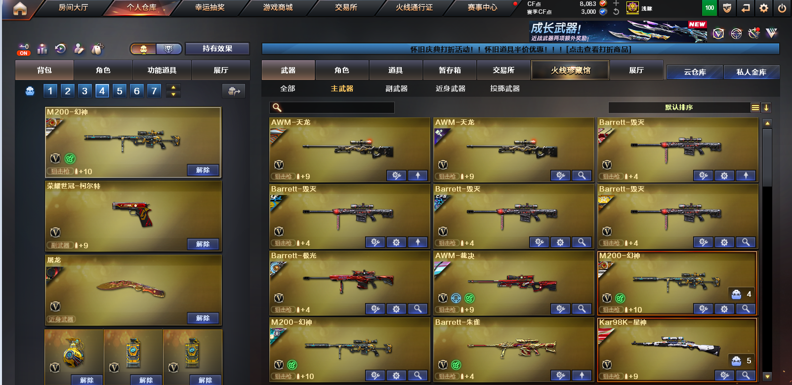 ⭐⭐⭐河南一区⭐登陆游戏,其他区有小号登错勿怪⭐⭐⭐毁号,涉及毁坏虚拟财产罪及计算机安全罪,请文明游戏素质游戏,让我们共建美好租号平台;喜欢本账号请点 ☆收藏☆ 方便下次租用,谢谢光临惠顾。⭐⭐⭐ 武器:传说光耀-幻神-星神-王者凌虎-白虎-G36C幻影-炽芒蝶刃-天罚课桌骑兵+音效-雷暴USP-雷霆COP-堕天神COP*2-荣耀世冠/EP柯尔特-破空夜魔套等;装饰:幻神S24冠军-欧欧-青鹤-星神枪娘默-白虎屠龙火麒麟荣耀巅峰-雷神幻影宋雨琦-量子蔷薇-荣耀三件-流光秘银-冠军心-怒-击-啸-白鲨麒麟刺等;音效卡:幻神-星神-白虎-QBZ蔷薇-雷神-火麒麟-毁灭音效卡等多光效多玩偶;角色:关小雨(4防)宋雨琦-职业经理-女战神-新海豹-炫-迷迭香等;小人枪:绝迹-白鲨-年鹏-绿豆-刀锋-曼陀罗-灵狐-葵等;生化:蝴蝶斯特尔-6烈龙-5炼狱-2盘龙-生化弹夹-机械女猎手皮肤;USP-雷暴,荣耀世冠-柯尔特,炽芒蝶刃,RPK-盘龙,QBZ03-金色蔷薇,G36C-幻影,M200-幻神,