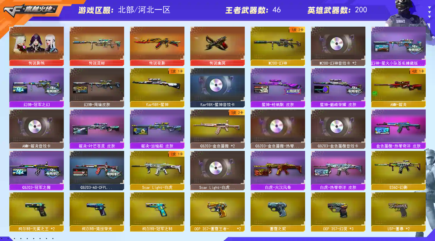 【英雄武器】:【M4A1-死神-1,AK12-天启-1,AN94-超新星-1,M4A1-千变-1,M4A1-黑骑士-3,M4A1-玫瑰精灵-1,AK47-黑武士-1,屠龙-4,龙啸-1,AK47-无影-1,麒麟刺-1,AK47-火麒麟-2,AWM-天龙-1,Barrett-毁灭-1,汤姆逊-烈龙-5,Barrett-极光-3,RPK-盘龙-4,沙鹰-修罗-7,加特林-炼狱-1,沙鹰-天神-1,M4A1-雷神-5,M4A1-黑龙-1,9A91-烈火-1,M200-幻神-1,屠龙-云海游龙-1,M4A1-雷霆-2,USP-雷暴-2,烈龙-云海游龙-1,高爆手雷-雷暴-7,烟雾弹-雷霆-7,雷霆之怒-1,闪光弹-雷霆-9,闪光弹-雷暴-7,烟雾弹-雷暴-7,斩神刀-雷暴-1,M14EBR-玄武-1,M200-竞技荣光-1,传说夜影-1,幻灵之锋-2,擎天-竞技荣光-5,柯尔特-冠军之特-1,柯尔特-竞技荣光-1,烟雾弹-竞技荣光-6,闪光弹-竞技荣光-6,高爆手雷-竞技荣光-6,Scar Light-白虎-1,炽芒蝶刃-2,高爆手雷-雷霆-8,唐刀-神工天巧-1,无影-神兵利器-1,AA-1;USP-雷暴,柯尔特-无冕之王,传说幽冥,柯尔特-冠军之特,炽芒蝶刃,Knife-冠军之刃,传说影煞,