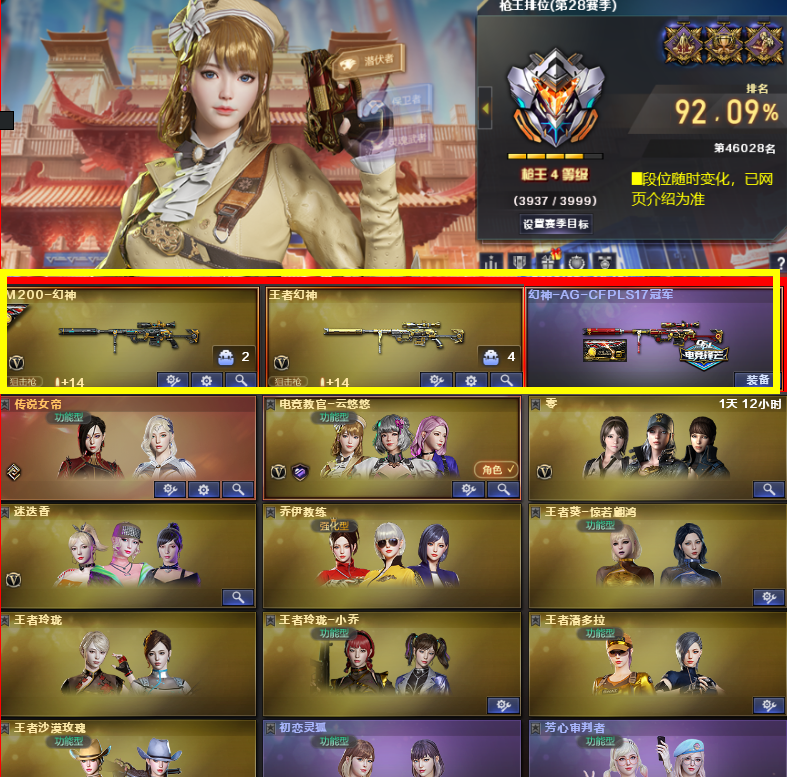 首页 > 租号大厅 > 穿越火线 > 电信区/福建一区 > ✨东部幻神号🔥可排位:传说女帝♥幻神+AG皮肤♥王者M200金戈幻神♥竞技荣光全套♥王幻♥蝴蝶六烈