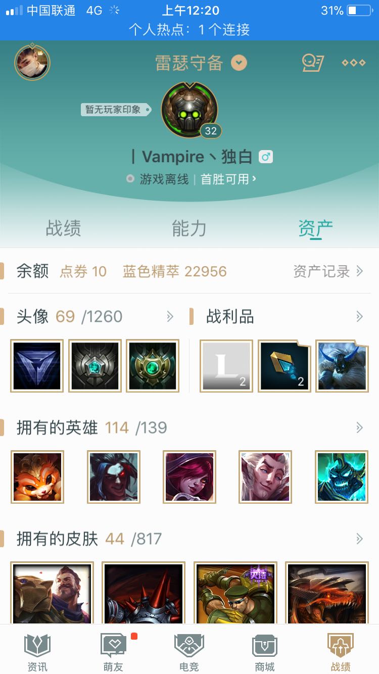 雷瑟守备龙刀号,114个英雄,44个皮肤,上赛季单双排白金4,可打排位。