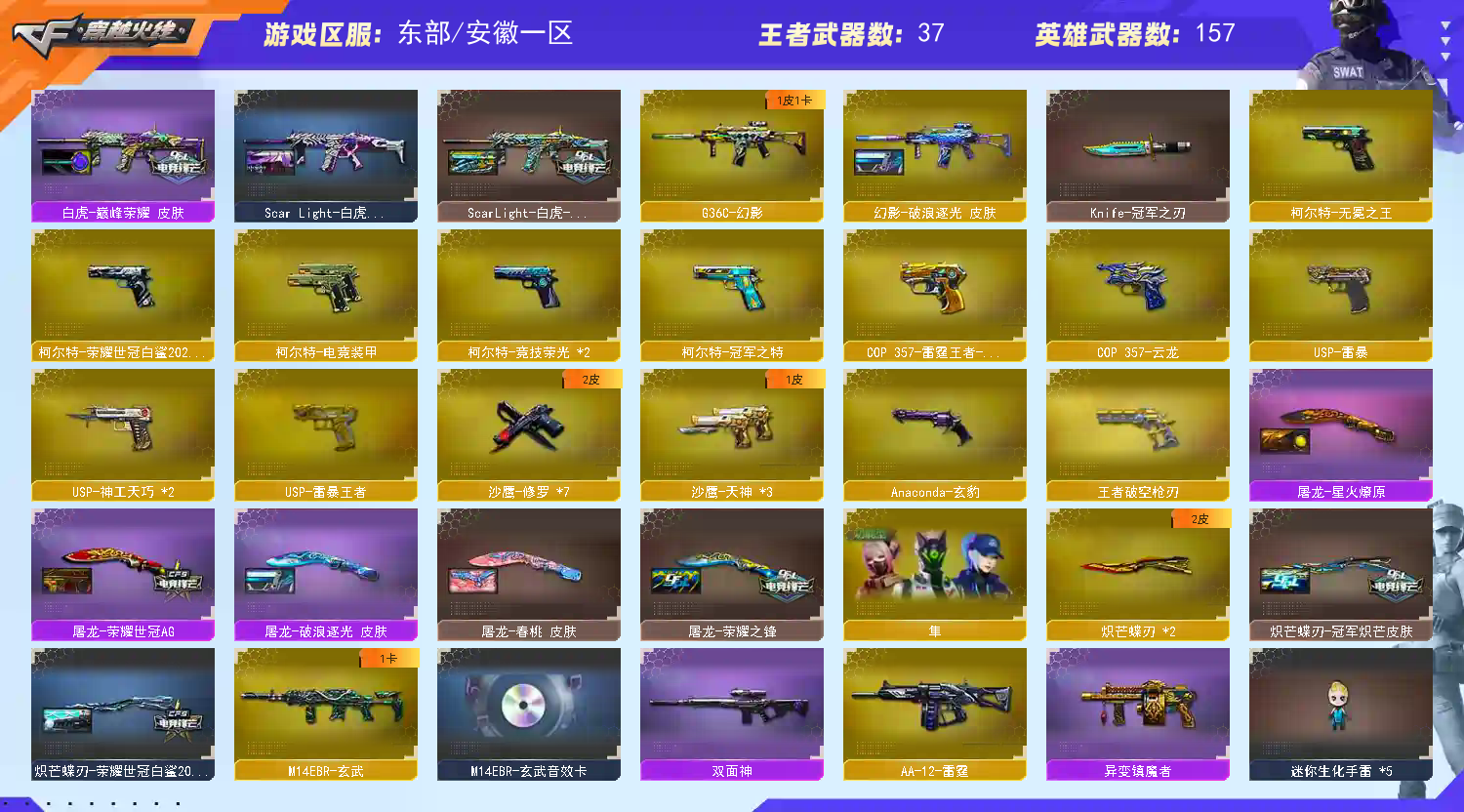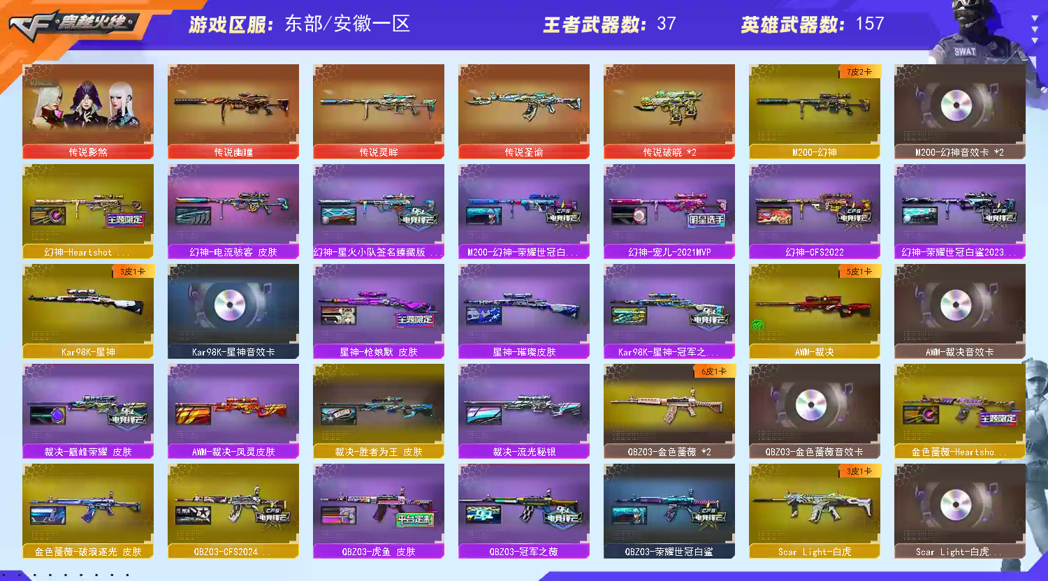 特殊装备有:幻神(宠儿、星火小队、两个白鲨、heartshot 、电流骇客、cfs2022音效卡) 星神(冠军之星、璀璨、枪娘、音效卡) 传说灵眸、传说幽瞳、传说圣谕、传说破晓*2 QBZ03-金色蔷薇(冠军之薇、世冠白鲨、虎鱼、heartshot、cfs2024、破浪逐光音效卡) AWM-裁决(巅峰荣耀、流光秘银、音效卡) AK47-火麒麟(世冠AG、横秒之巅、传奇even、CFS2018、冠军之心) M4A1-雷神(巅峰荣耀、宠儿、念旧、冠军之魄、CFS2019、音效卡) Scar-Light-白虎(冠军之虎、暗星、巅峰荣耀、音效卡) Barrett-毁灭(CFS2018、SV冠军、冠军之怒、荣耀之怒、AG、音效卡) 屠龙(世冠AG、荣耀、星火燎原、春桃、破浪逐光) 擎天(冠军之击)、麒麟刺(世冠白鲨、萌杀、月) 加特林-炼狱(虎牙、斗鱼、玩具、月、音效卡) 炽芒蝶刃x2(冠军炽芒、世冠白鲨) g36c-幻影(破浪逐光)、M14EBR-玄武、 王者破空、王者雷霆cop、王者USP-雷暴、USP-雷暴、无冕之王、世冠白鲨柯尔特、冠军之特、冠军之刃、USP-神工天巧、炼狱-迷你小刚、斯太尔-蝴蝶+枪娘暗刃、毒蜂、双面神、清道夫、CAT、鲨臂、龙宝mac10、全弹匣、王者全觉醒,26副武器、14套雷,8战队炫彩背包、十战队击杀图、11生化皮肤。 角色有:传说隐煞、隼、云悠悠、荒漠琉璃、晴雅、雨墨、兰、月兔特工、葵、迷迭香、樱、炫、狐影、王者春、王者零、王者魅影、王者迷迭香、王者潘多拉、王者瞳闭花羞月,王者樱热浪之夏。;USP-雷暴,柯尔特-无冕之王,USP-雷暴王者,柯尔特-荣耀世冠白鲨2023,柯尔特-冠军之特,炽芒蝶刃,Knife-冠军之刃,