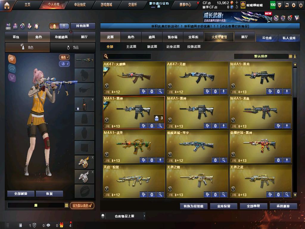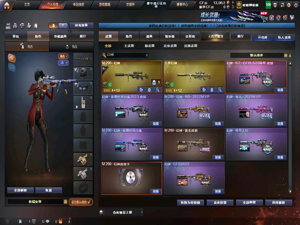 角色:传说女帝、晴雅、兰15周年、鹰、云悠悠、王者-葵-貂蝉、王者-春、王者-魅影、王者-瞳-闭月羞花 步枪:传说辉光、传说光耀、传说暗裔、荣耀世冠-雷神、QBZ03-金色蔷薇(冠军之薇+蔷薇音效卡)、Scar light-白虎(白虎音效卡)、M4AI-雷神(雷神宠儿、荣耀之魄、冠军之魄、耀金、星空、虎将+雷神音效卡+雷神红绿、蓝粉、橙紫光效),M4AI-黑骑士(战神马超,冠军之势、耀金+黑骑士音效卡+蓝粉光效),AK47-火麒麟(2018,冠军之心+火麒麟音效卡)、电玩白虎、王者(王者蔷薇、之心、之影、M4A1-雷霆王者、之武、之魄、之戮) 狙击枪:传说圣灵、幻神(冠军之幻、幻神2022、黄忠+幻神音效卡)、毁灭(绿豆、荣耀之怒、AG、2018、星空+毁灭音效卡+蓝色光效)、王者(王者幻神、王者星神、之决、之怒、之光、巴雷特-雷霆王者)、98K-星神、M200-竞技荣光 副武器:COP 357-雷霆、2USP-雷暴、冠军之特、柯尔特-竞技荣光、荣耀世冠-柯尔特、COP-白鲨 机枪:6盘龙+3炼狱-悦蓝 冲锋枪:6烈龙+蝴蝶斯太尔 近战:冠军之刃,荣耀世冠-龙啸,王者之击;USP-雷暴,荣耀世冠-柯尔特,柯尔特-荣耀世冠白鲨2023,柯尔特-冠军之特,炽芒蝶刃,Knife-冠军之刃,传说女帝,