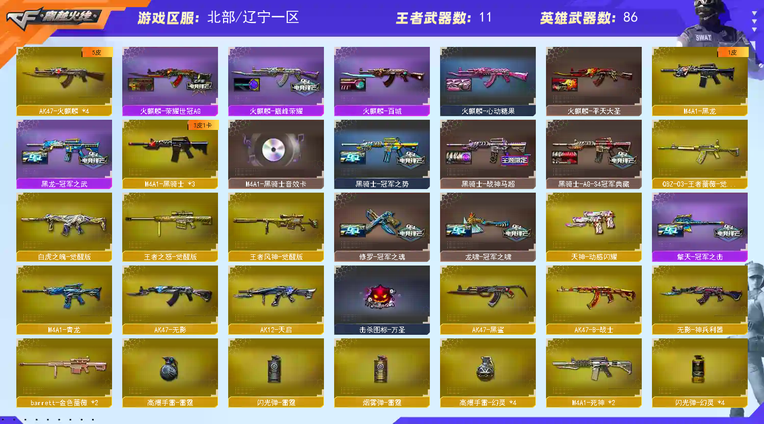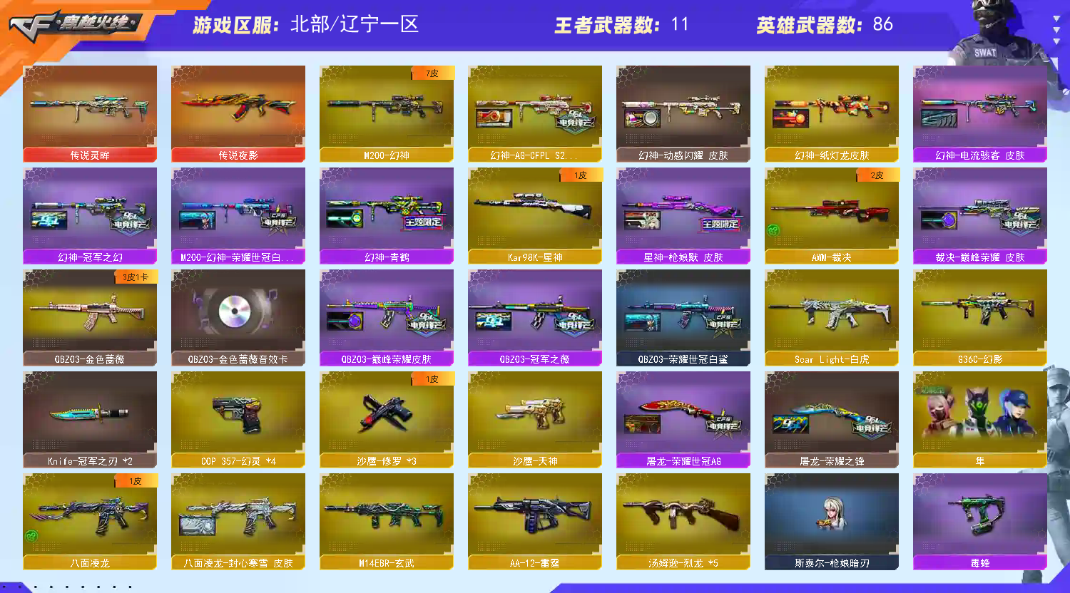 【北部】百v传说灵眸✅幻神新AGs24⑦皮✅G36c幻影✅八面玲珑✅裁决新皮✅星神带皮+4Cop六列;Knife-冠军之刃,隼,晴雅,QBZ03-金色蔷薇,G36C-幻影,M200-幻神,Scar Light-白虎,