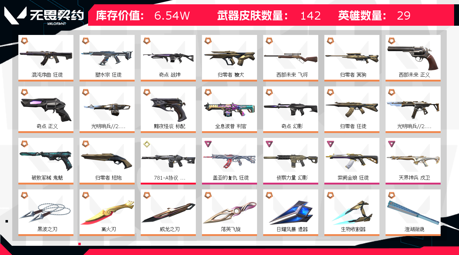 首页 > 租号大厅 > 无畏契约-wegame > wegame/wegame > 13刀✨离火刃✨显卡爪奇点蝴蝶黑波威龙落英苦无✨混沌盖亚塑水紫金狂徒✨781幻影✨西部飞将✨西部正义