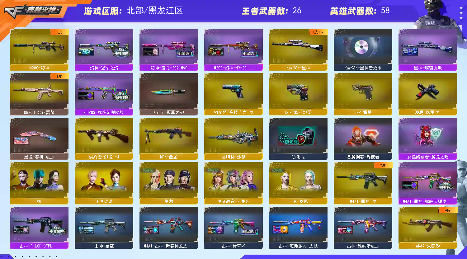 【m200幻神+宠儿皮肤+冠军之幻+n9皮肤+冠军之刃】【98k星神+音效卡+璀璨】【王者幻神】【m200竞技荣光套+usp雷暴+四防云悠悠】【qbz金色蔷薇+巅峰荣耀】【火麒麟】【黑龙+冠军之武】【雷神+巅峰荣耀+n9皮肤】【黑骑士+卡】 【武器:幻灵 王者之心 王者之戮 王者之烈 雷霆王者 王者之决 王者之光 烈龙*5 炼狱 盘龙】 【8手呛:修罗*4 cop幻灵 柯尔特竞技荣光 】 【10刀具:屠龙 龙啸 麒麟刺 幻灵之峰*3 雷霆王者之锋 龙啸烈火龙威】 【5雷套:幻灵雷 竞技荣光雷*4】 【小人呛:】 【音效卡: 星神音效卡 黑骑士音效卡】 【四防角色:云悠悠 影豹 王者魅影 】;USP-雷暴,Knife-冠军之刃,电竞教官-云悠悠,RPK-盘龙,QBZ03-金色蔷薇,M200-幻神,Kar98K-星神,