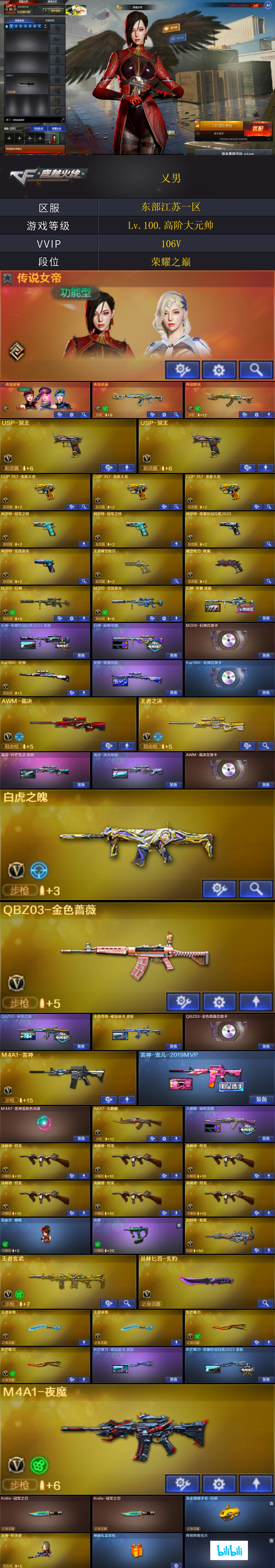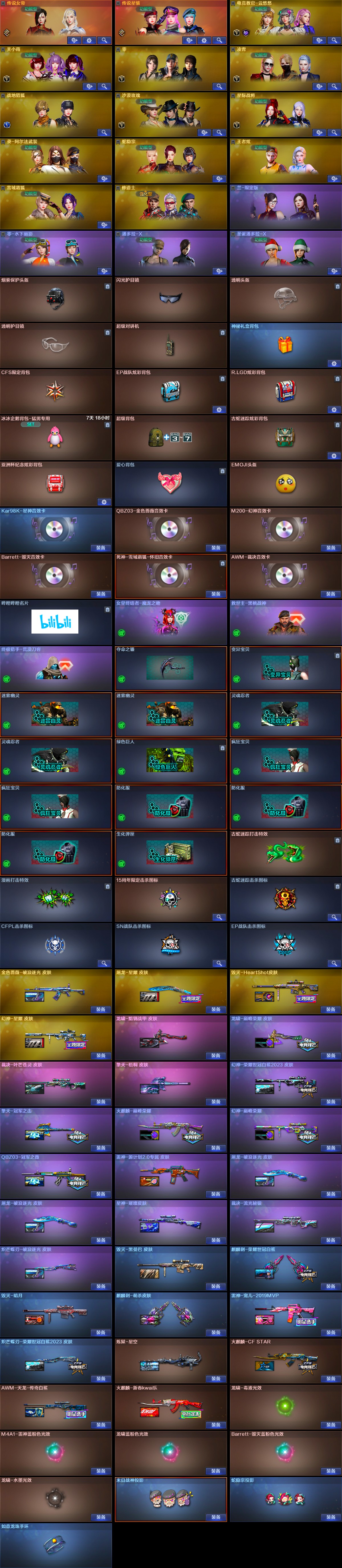 【稀有武器】:神威天凌/传说qbz/传说辉光/M200-幻神/Kar98K-星神/M4A1-夜魔/破空枪刃-夜魔/柯尔特-竞技荣光/柯尔特-荣耀世冠白鲨2023/修罗-古蛇迷踪/COP357-雷霆王者-觉醒版(3)/柯尔特-冠军之特(2)EP冠特4/usp雷暴王者2/王者破空枪刃/QBZ03-金色蔷薇/AK47-火麒麟/M4A1-雷神/Barrett-毁灭/AWM-裁决/M200-竞技荣光/加特林-炼狱/汤姆逊-烈龙(6)/AA-12-雷霆/炽芒蝶刃(2)/斩神刀-雷暴王者*2/麒麟刺-堕天神/龙啸-堕天神/马来剑-夜魔/擎天-竞技荣光(2)屠龙-巅峰荣耀 主流副武器都有 未更新 【王者武器】:白虎之魄-觉醒版/王者之决-觉醒版/王者破空枪刃/M4A1-雷霆王者 【热门角色】:传说女帝/传说星骇/电竞教官-云悠悠/雨墨/关小雨/凌霄/沙漠玫瑰/星际战将/蛇隐宗/王者炫/潘多拉-X/职业经理 【热门音效卡】:M200-幻神音效卡/Kar98K-星神音效卡/AWM-裁决音效卡/QBZ03-金色蔷薇音效卡/Barrett-毁灭音效卡2/白虎音效卡 【热门皮肤】:幻神KZ25皮肤/幻神-星耀皮肤/幻神-荣耀世冠白鲨2023皮肤/幻神世冠EP幻神-巅峰荣耀/龙啸-巅峰荣耀皮肤/金色蔷薇-破浪逐光皮肤/屠龙-星耀皮肤/毁灭-HeartShot皮肤/擎天-梧桐皮肤/擎天-冠军之击/火麒麟-巅峰荣耀/QBZ03-冠军之薇/屠龙-破浪逐光皮肤(2)/星神-璀璨➕拼搏皮肤/裁决-流光秘银/炽芒蝶刃-破浪逐光皮肤/雷神-宠儿-2019MVP/炽芒蝶刃-荣耀世冠白鲨2023皮肤/火麒麟-新春kwai乐 【其他亮点】:斯泰尔-蝴蝶/Knife-冠军之刃(2)/星神-炽天使/毒蜂/VEPR-12-金魔/迷你律动酷熊/宙斯权杖/黄金猫猫手套-白鲨/迷你泡泡象/哔哩哔哩名片 许多东西未更新 除了挑战 其他模式都可畅玩 详情上号查看;USP-雷暴王者,柯尔特-荣耀世冠白鲨2023,柯尔特-冠军之特,炽芒蝶刃,Knife-冠军之刃,沙漠玫瑰,传说星骇,