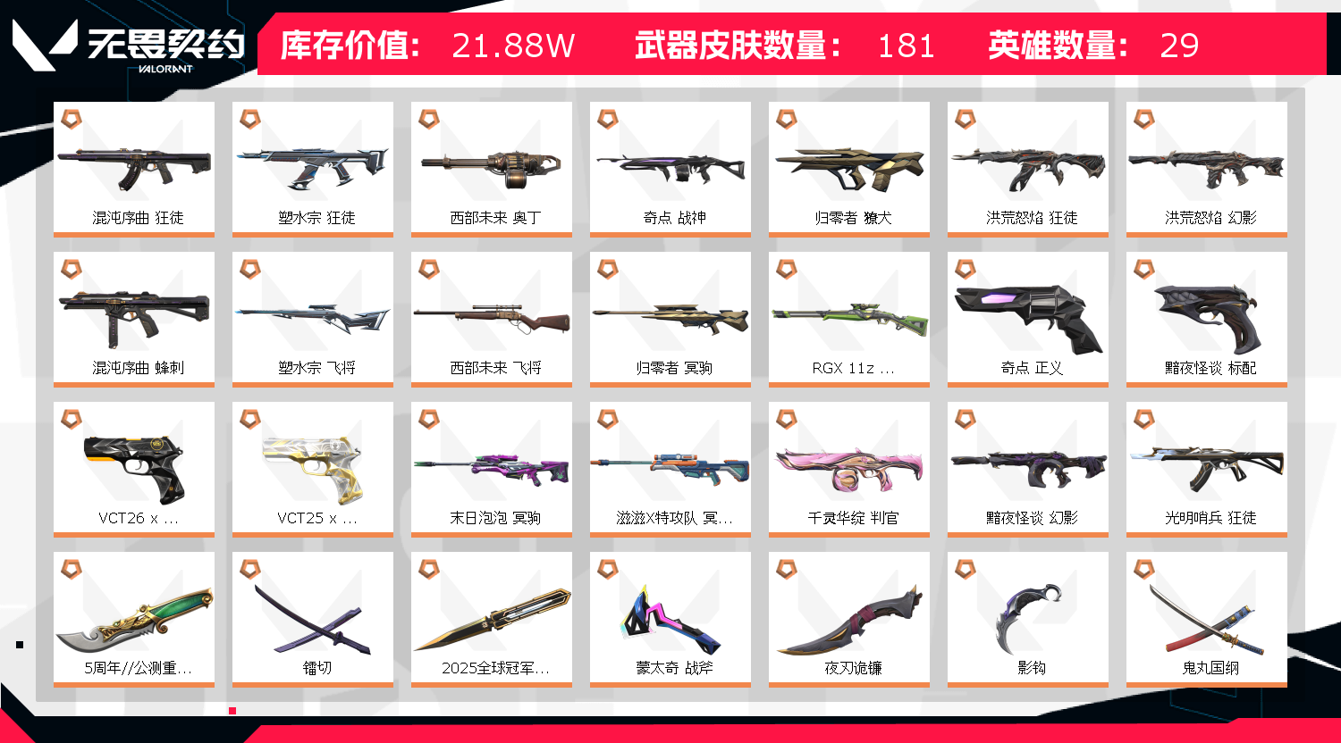 对局结束时间超过订单结束时间10分钟以上永久拉黑,上个租客的残局不打直接撤单永久拉黑! 账号无冻结随意发起号主协助必拉黑! 骂人挂机零容忍,发现永久拉黑,永不恢复。 秒解冻,首次登录失败后请在平台发起号主协助并立即尝试第二遍登录。(敏感操作容易导致账号突然冻结)有租号问题可以通过wegame平台上的信息加号主好友咨询。 此号已使用源晶点数(R点):3850R 现在挂机会直接禁赛7天!请及时续租不要挂机,如果到时不下线,下一个租客会挤号导致挂机,所以请及时续租,导致禁赛的一律永久拉黑。 炸鱼会封三天机械码,会导致你的设备在三天内玩不了无畏契约,下三段请控制击杀数不要超30个,(黄金、铂金杀太猛也有概率封机械码),导致禁赛永久拉黑。 禁止挂机逃跑!禁止骂人!到时后严禁再开游戏,发现永久拉黑。请合理控制炸鱼力度,不然会被别人举报禁赛,你自己的电脑也会被封机械码几天玩不了瓦,被禁赛累计3次的租客会被我永久拉黑。请合理控制租号时长,以免被后续租客顶号。此帐号已在南京市公安局备案,封号时长超过30天会联系警方严肃处理!封号一个月赔偿金额2580元起步,封号三个月赔偿金额7740元起步。 骂人si全家,发现永久拉黑,你跪着求我也不会给你解开,本店24h全程检查违规行为。被拉黑者将无法游玩本店的所有高性价比账号。如果被禁言请和好友通过其它软件语音聊天。 请不要使用拓展坞和yun电脑进行游戏,会被禁赛和封机械码。 喜欢的可以收藏,此号后续会持续氪金。有任何问题可以通过掌瓦留言咨询。 遇到无法登录等问题及时去号主通道加急处理 恶意退排位恶意无理由撤单一律黑名单【店铺所有账号均于南京市网监局备案虚拟财产,开挂/鼠标宏/恶意卡BUG等毁号行为,直接联合本平台提供详细信息邮寄律师函!必追责原价赔偿! 狂徒:ORA颗秒狂徒满级/2025全球冠军赛狂徒满级(25冠军狂徒)/滋滋X特攻队狂徒4级全炫彩/盖亚的复仇狂徒4级全炫彩(盖亚狂徒)/塑水宗狂徒4级全炫彩/混沌序曲狂徒4级全炫彩(混沌狂徒)/洪荒怒焰狂徒4级钴蓝(流脓狂徒)/堕天遗武狂徒4级金色//紫阙金琅狂徒4级蓝色/机动狂飙狂徒4级糖果粉/光明哨兵狂徒4级红绿粉红/海洋之星狂徒(鱼缸狂徒)/离子武器狂徒4级(离子狂徒)/全息波普狂徒4级红色(电幻狂徒)/冰点凝冻狂满级(冰点狂徒)/上古龙炎狂徒4级暗色/超时空卫队狂徒4级蓝色金色/海洋之星狂徒满级黑色(鱼缸狂徒) 近战武器:悲悯之刃满级/ORA颗秒军刀满级/RGX11zPro爪刀2级全炫彩(显卡爪刀)/2025全球冠军赛蝴蝶刀满级(25冠军蝴蝶刀)/魔术火花2级全炫彩(电工钳/电光刃)/影钩2级全炫彩(掠夺爪刀)/鬼丸国纲2级全炫彩/镭切2级粉色/泡泡电锯2级/澄湖涟滟2级(鱼扇)/夜刃诡镰2级黑色蓝色(古神镰刀)/侦察力量蝴蝶刀2级红色/2022全球冠军赛蝴蝶刀满级/5周年公测重制版苍龙之刃2级全炫彩/超时空卫队三棱军刺2级全炫彩/嘟昂嘟昂超弹力水球拳套2级全炫彩 幻影:ORA颗秒幻影满级/千灵华绽幻影4级蓝色紫色/末日泡泡幻影4级黄色/侦察力量幻影4级全炫彩(侦察幻影)/源能者娱乐系统幻影4级全炫彩/2022全球冠军赛幻影满级/781-A协议幻影满级粉白(781幻影)/般若假面幻影4级飞燕/异鳞魔蛇幻影4级全炫彩(蛇年幻影)/掠影幻影4级红色白色(掠夺幻影)/洪荒怒焰幻影4级钴蓝(流脓幻影)/源能者危机001幻影满级/天界神兵幻影4级(鎏金幻影)/盖亚的复仇幻影4级蓝色(盖亚幻影)/奇点幻影4级 鬼魅:掠影鬼魅4级白色(掠夺鬼魅)/艾沃莉的梦之翼鬼魅4级蓝色(哈基米猫猫鬼魅)/超时空卫队鬼魅4级金色蓝色/破败军械鬼魅4级紫色红黄(诅咒鬼魅) 正义:ORA颗秒正义满级/奇点正义4级紫色红色/离子武器正义4级(离子正义)/光明哨兵正义4级/末日泡泡正义4级黄色/虚空遗器正义4级红色(虚无正义) 标配:黯夜怪谈标配4级黑色(古神标配)/VCT25xBLG标配满级/VCT25xEDG标配满级/VCT25xLEV标配/VCT25xTH标配/VCT25xTS标配满级/VCT25xPRX标配/VCT25xWOL标配 冥驹:ORA颗秒冥驹满级/千灵华绽冥驹4级紫色(莲花冥驹)/滋滋X特攻队4级全炫彩/归零者冥驹4级黑色(异星冥驹) 戍卫:天界神兵戍卫4级(鎏金戍卫)/归零者戍卫4级黑色银色(异星戍卫)/盖亚的复仇戍卫 獠犬:归零者獠犬4级白色(异星獠犬)/781A协议獠犬满级粉白(781獠犬)/超时空卫队獠犬4级 莽侠:超时空卫队莽侠4级金色/RGX 11z Pro莽侠3级(显卡莽侠) 骇灵:奇点骇灵4级/掠影骇灵4级白色(掠夺骇灵) 判官:上古龙炎判官4级暗色(龙喷) 蜂刺:混沌序曲蜂刺4级蓝色白色(混沌蜂刺) 雄鹿:起源雄鹿4级白色 奥丁:西部未来奥丁4级银色/艾沃莉的梦之翼奥丁4级蓝色(哈基米猫猫奥丁)/掠影奥丁4级白色(掠夺奥丁) 飞将:塑水宗飞将4级/天界神兵飞将4级(鎏金飞将) 战神:奇点战神4级紫色/盖亚的复仇战神4级蓝色(盖亚战神) 狂怒:砰砰x特攻队狂怒4级黄色(玩具狂怒) 短炮:盖亚的复仇短炮4级蓝色(盖亚短炮) 25冠军/奇幻朋克3.0/滋滋特攻队/超时空卫队/掠夺2.0/2022全球冠军赛/侦察幻影;艾沃莉的梦之翼 奥丁,西部未来 奥丁,奇点 战神,5周年//公测重制版 苍龙之刃,镭切,起源 雄鹿,上古龙炎 判官,
