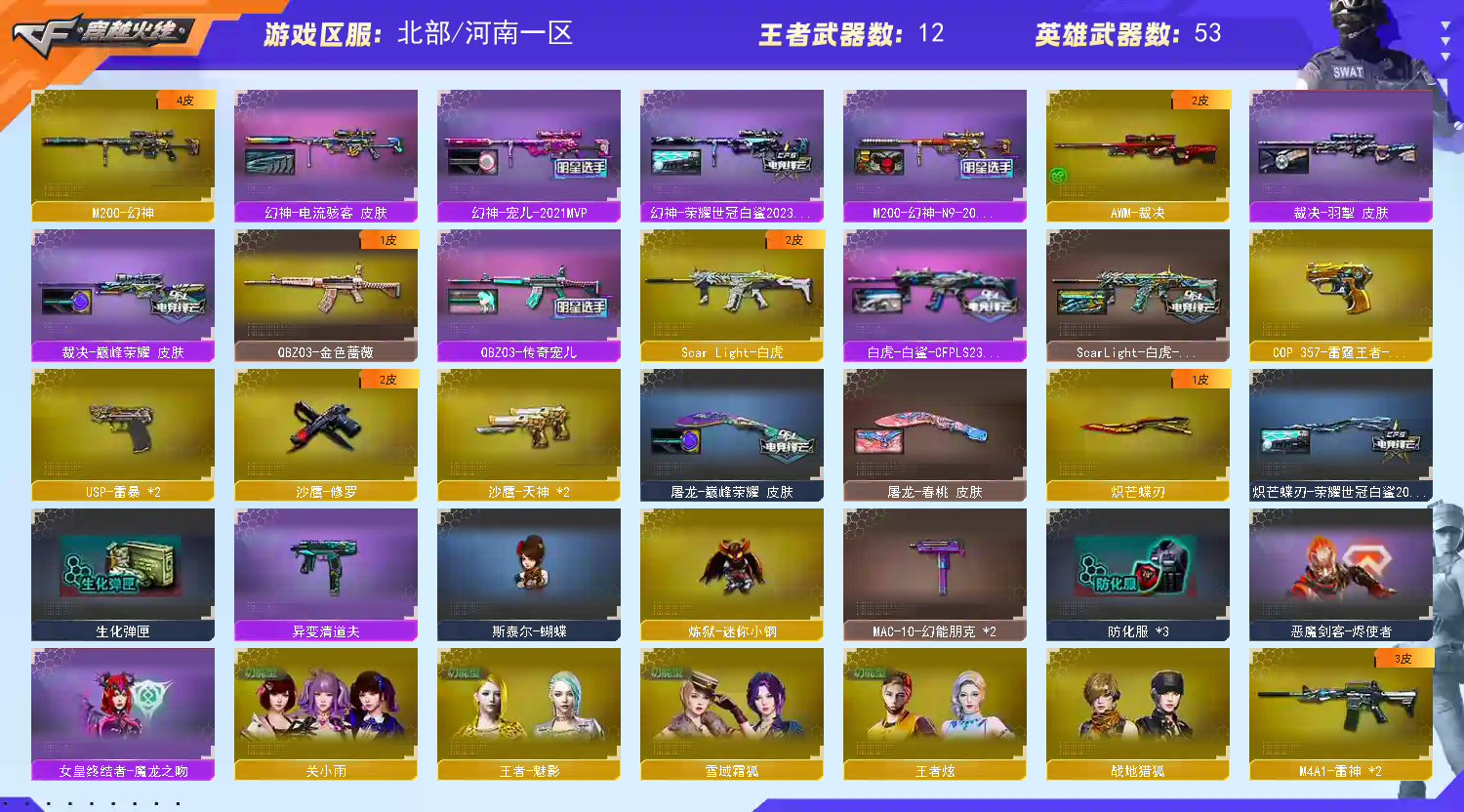 幻神白鲨2023宠儿n9电流骇客,白虎白鲨冠军,qbz宠儿雷神荣耀,裁决巅峰荣耀,双usp雷暴一cop雷霆王者,关小雨王者魅影王者炫炽芒蝶刃白鲨;USP-雷暴,炽芒蝶刃,QBZ03-金色蔷薇,M200-幻神,Scar Light-白虎,