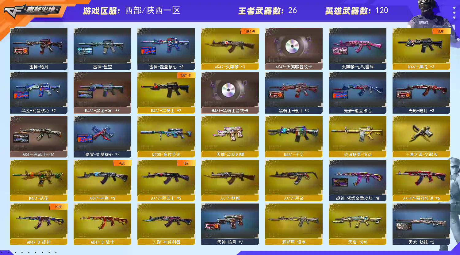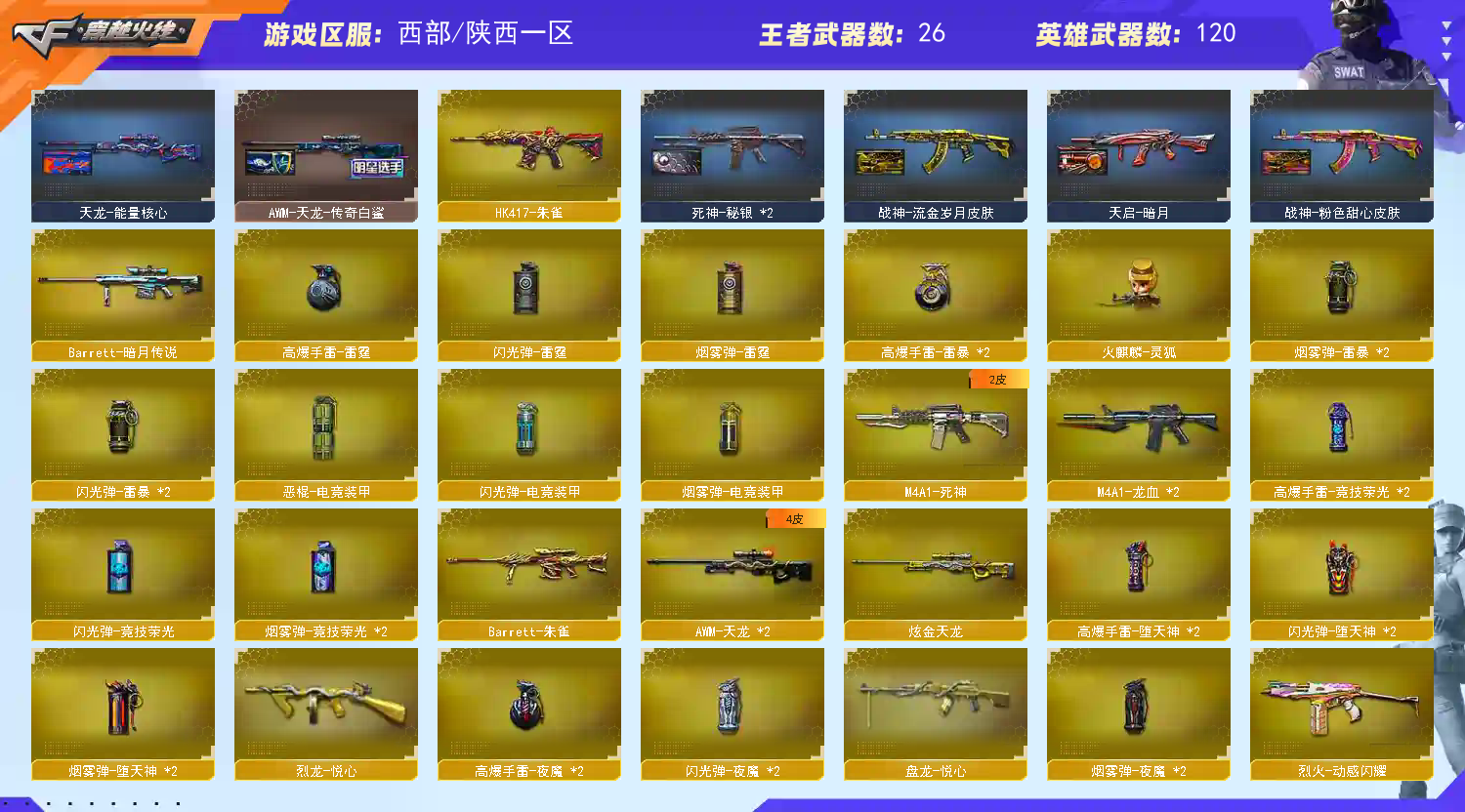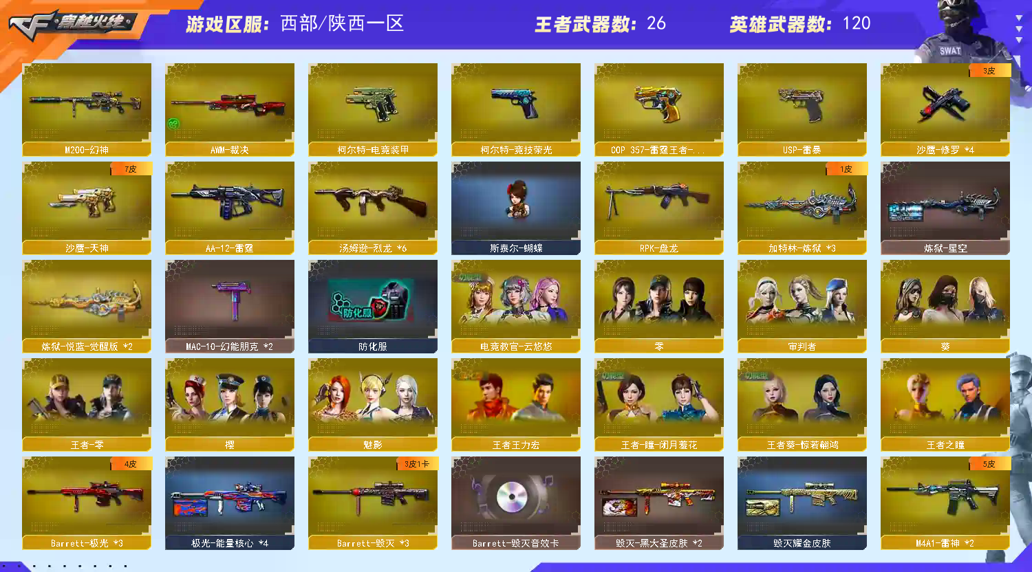 135V19王者7炫金可排位M200-幻神+USP雷暴/M200-竞技荣光+柯尔特竞技荣光+擎天竞技荣光+2套竞技荣光雷+电竞教官云悠悠/Barrett-朱雀/HK417-朱雀/M4A1-青龙/1盘龙3炼狱6烈龙/COP雷霆王者/柯尔特电竞装甲/M4A1-黑骑士音效卡/极光-能量核心/毁灭耀金皮肤/毁灭-黑大圣皮肤/AWM-天龙-传奇白鲨/天龙-秘银/天龙-能量核心/雷神-暗月/雷神-能量核心/雷神-星空/黑骑士-暗月/黑龙-暗月/黑龙-能量核心/M4A1-黑龙-361/火麒麟-CFSTAR/火麒麟-AG/火麒麟-心动糖果/无影-暗月/无影-能量核心/AK47-黑武士-361/死神-秘银/战神-流金岁月皮肤/战神-紫绶金章皮肤/战神-粉色甜心皮肤/天启-暗月/炼狱-星空/修罗-CFSTAR/修罗-能量核心/天神-暗月/炫金武士(2)/炫金超新星(3)/炫金毁灭/炫金天龙/王者之心/天启-悦智/王者之影(2)/超新星-悦享/王者之武/玫瑰精灵-悦动/王者之光/王者之力(2)/盘龙-悦心/炼狱-悦蓝/烈龙-悦心/魅影/樱/审判者/葵/零/王者-瞳-闭月羞花/王者葵-惊若翩鸿/王者王力宏/王者之瞳/王者-零/王者零-传说之路/乔伊教练/铁骑荣耀/空/灵狐者-黄金海岸/虎牙炫彩背包/超级背包3-7/永久防弹衣+永久防弹头盔+永久C4工具钳;USP-雷暴,电竞教官-云悠悠,RPK-盘龙,M200-幻神,