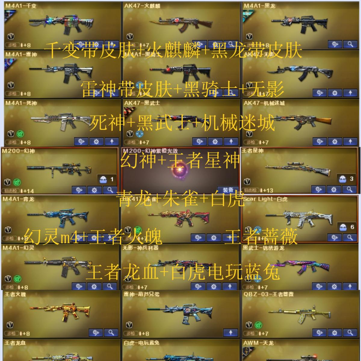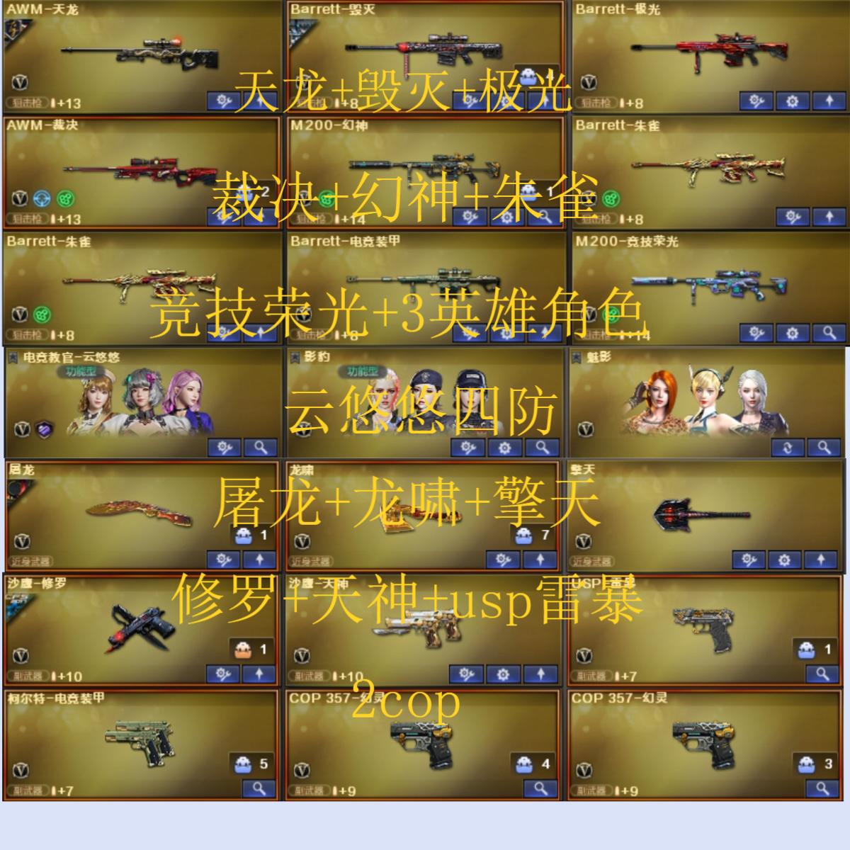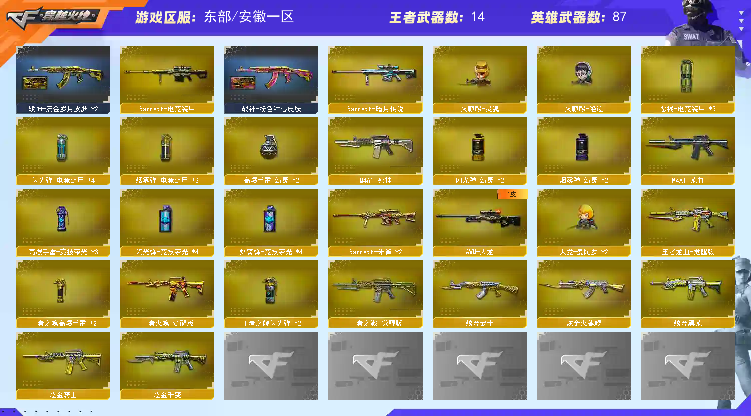 99V14王者5炫金可排位/M200-幻神/Barrett-朱雀/王者星神觉醒/M200-竞技荣光+柯尔特-竞技荣光+擎天-竞技荣光4把+3套竞技荣光雷+电竞教官-云悠悠/M4A1-青龙/HK417-朱雀/Scar Light-白虎/QBZ03-金色蔷薇/QBZ-03-王者蔷薇觉醒/白虎-电玩蓝兔/电竞装甲套装+3套电竞装甲雷/幻灵套装+COP357-幻灵2把+2套幻灵雷/2炼狱/【四防】灵狐者-职业经理/Barrett-毁灭音效卡/M4A1-黑龙音效卡/QBZ03-金色蔷薇音效卡/M4A1-黑骑士音效卡/AK47-火麒麟音效卡/火麒麟-枪娘凯萨林/雷神-高能霹雳皮肤/黑鲨-电流骇客皮肤/雷神-荣耀世冠AG/屠龙-荣耀世冠AG/烈龙-星空/毁灭-星空/雷神-星空/火麒麟-战神关羽/毁灭-墨兰/毁灭-战神张飞/黑骑士-战神马超/M4A1-战神赵云/火麒麟-雷神/修罗-CFS2018/毁灭-BEAN-2020MVP/毁灭-荣耀之怒/屠龙-荣耀之锋/雷神-荣耀之魄/火麒麟-平天大圣/毁灭-黑大圣皮肤/千变-孔明/黑龙-墨子/黑武士-典韦/AWM-天龙-传奇70KG/AWM-天龙-传奇白鲨/修罗-CFSTAR/火麒麟-绝迹/火麒麟-灵狐/雷神-小红/天龙-曼陀罗/COP-白鲨/激光毁灭者3/神圣爆裂者-末日3/黑龙吞噬者/死亡之眼/王者火魄觉醒/王者龙血觉醒/王者之戮觉醒/王者之魂觉醒/王者之锋觉醒/炫金火麒麟/炫金武士/炫金黑龙/炫金骑士/炫金千变/影豹/魅影/王者-救世主/王者玲珑/猫耳头盔/【长时效】闪光护目镜/炫彩背包/全背包+扩展背包/永久防弹衣+永久防弹头盔+永久C4工具钳+永久手雷包;USP-雷暴,荣耀世冠-柯尔特,电竞教官-云悠悠,QBZ03-金色蔷薇,M200-幻神,Scar Light-白虎,
